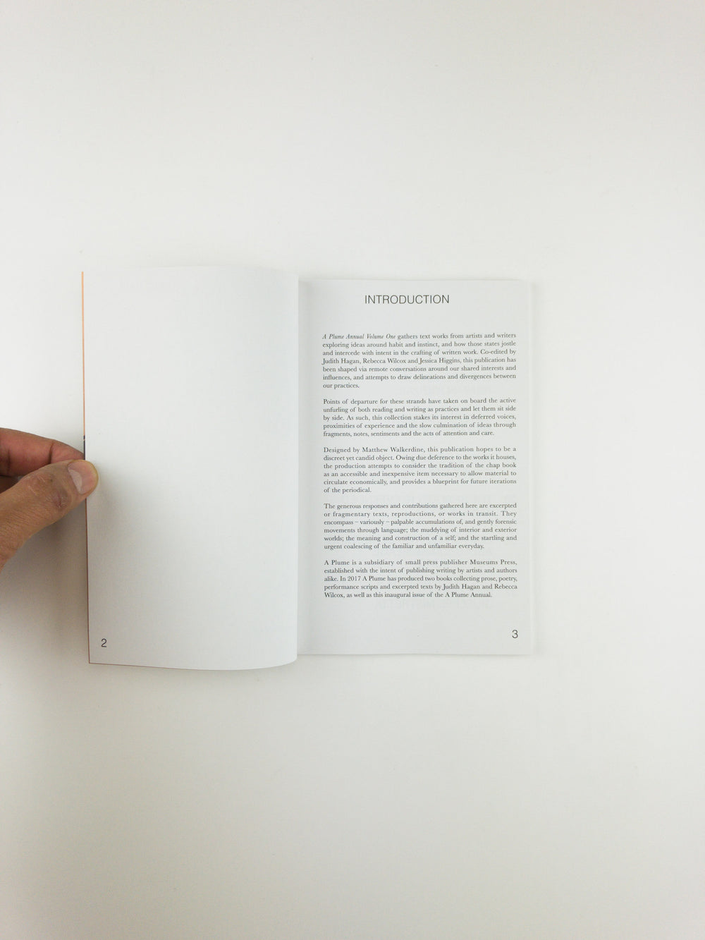 A Plume Annual Volume One gathers text works from artists and writers exploring ideas around habit and instinct, and how those states jostle and intercede with intent in the crafting of written work. Co-edited by Judith Hagan and Rebecca Wilcox and Jessica Higgins, the publication has been shaped via remote conversations around shared interests and influences, and attempts to draw delineations and divergences between practices.