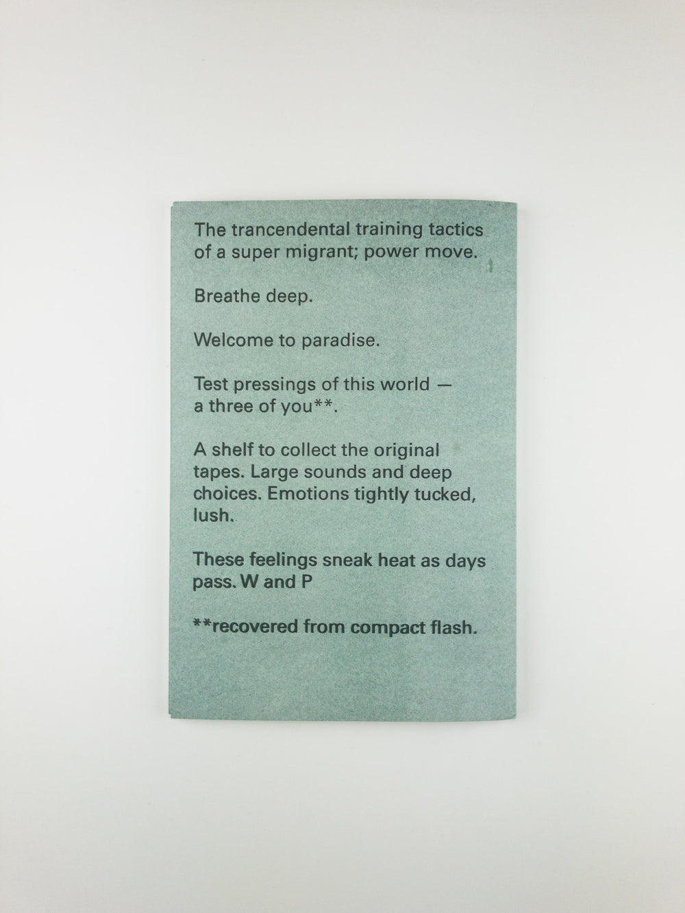 The transcendental training tactics of a super migrant; power move. Breathe deep. Welcome to paradise. Test pressing of this world – a three of you*. A shelf to collect the original tapes. Large sounds and deep choices. Emotions tightly tucked, lush. These feelings sneak heat as days pass. W and P *recovered from compact flash.