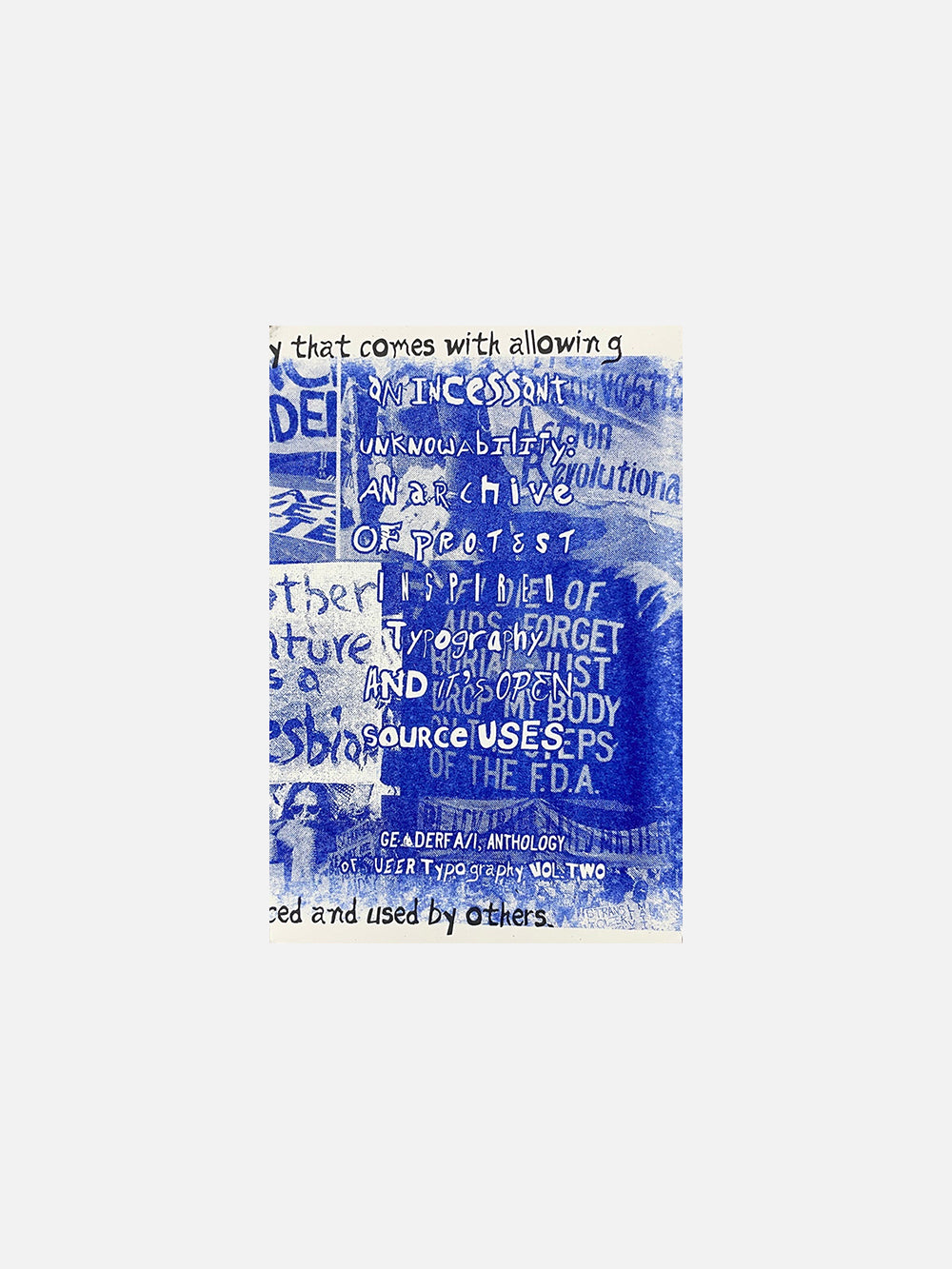 An Incessant Unknowability: An Archive of Protest Inspired Typography and it’s Open Source Uses is the 2nd volume in the GenderFail, Anthology of Queer Typography ongoing series . This second volume centers on the open source uses of our fonts from 2018 (when the first font was made) to the present. The fonts’ uses presented in this book account for just the knowable uses of the 10 GenderFail fonts. This book features 26 unique open source uses categorized into four different sections: Personal, collective institutional, and protest. Finding these works can be hard and one of the only ways is either being tagged on Instagram or being emailed directly from the makers. It’s amazing to think there are numerous other uses of our fonts that I will never see.