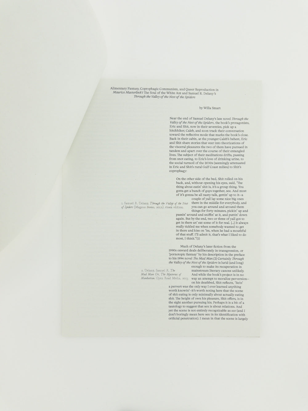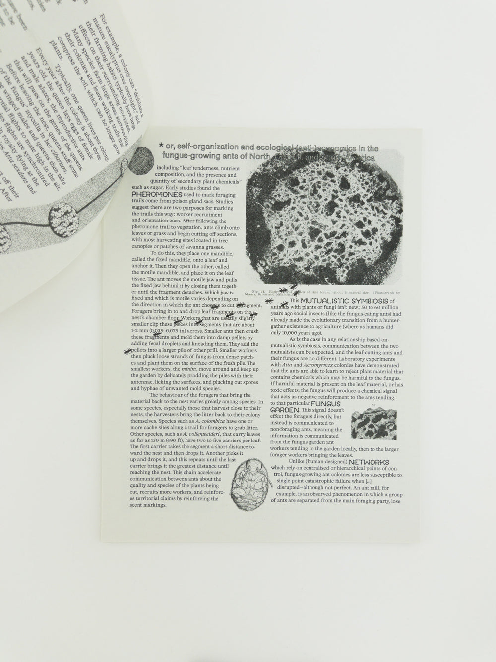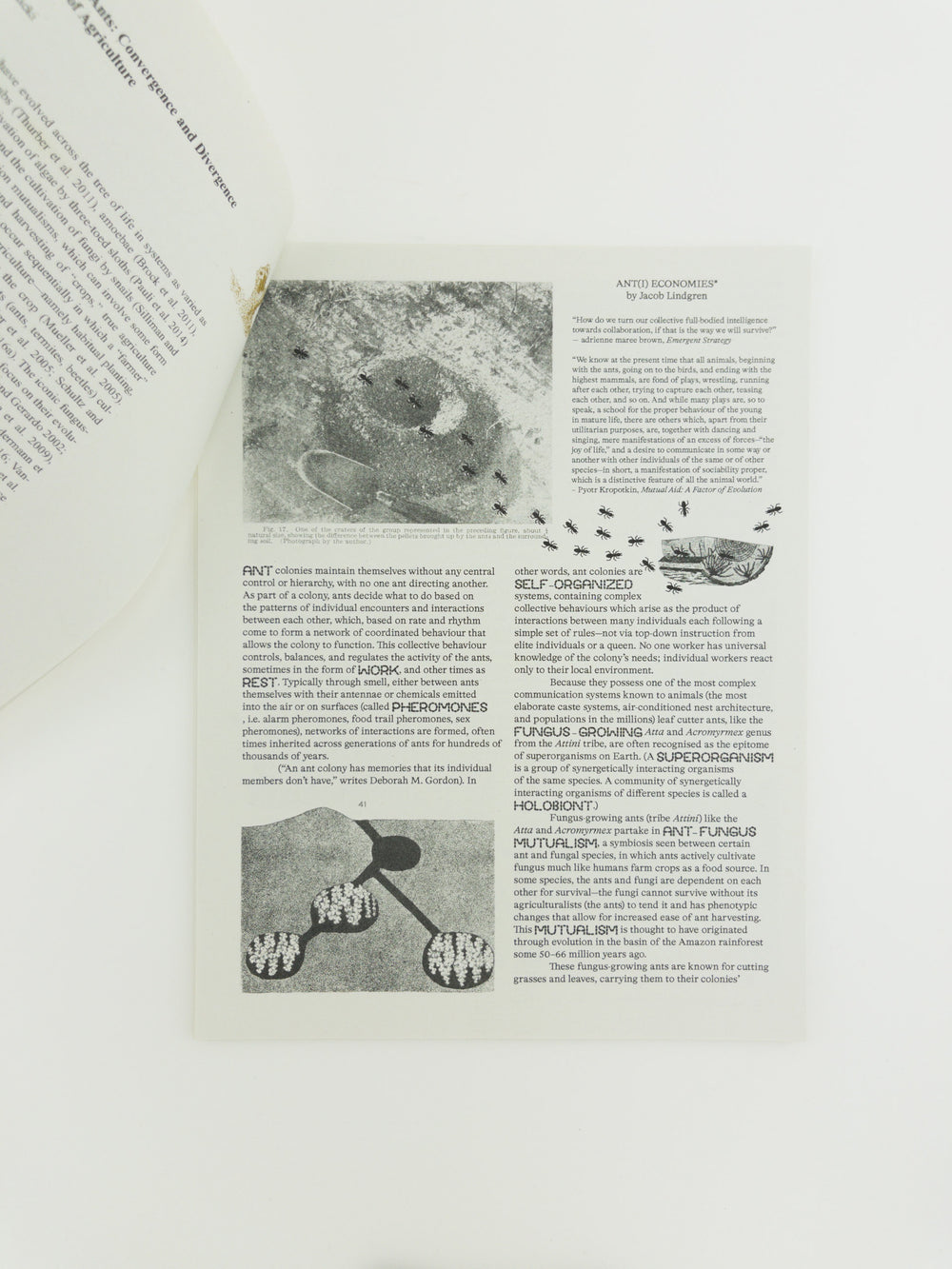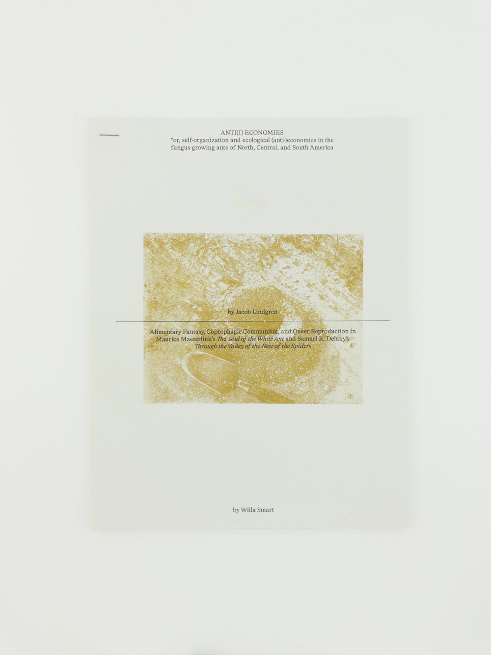"Ant(i) Economies" (an in-progress essay) by Jacob Lindgren and "Alimentary Fantasy, Coprophagic Communism, and Queer Reproduction in Maurice Maeterlink’s The Soul of the White Ant and Samuel R. Delany’s Through the Valley of the Nest of the Spiders" by Willa Smart. Self-organization in ants, ecological (non) economies, un"natural" sexual constructs, transformative fantasies, and a queer alimentarity. Includes interwoven, facsimile reproductions of instances of economic anthropomorphism in scientific literature, novels, and cinema surrounding fungus-growing leafcutter ants (Atta and Acromyrmex) and the convergent histories of agriculture between humans and insects.