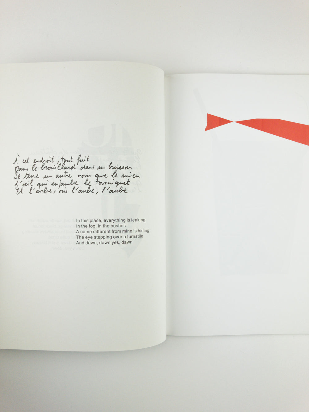 Rodzielski’s work examines and makes use of contemporary modes of production, reproduction, and circulation of images. For the book Aube, he turns this process to his own work, that we see developing by fragments and previews, as if behind an openwork filter “or is it the surface of the page that is appearing through the pictures?” A poem written by the artist gives the book its rhythm: it refers to an ancient genre of poetry that describes the sun rising and lovers leaving each other. But here this movement of becoming visible and setting apart is affecting the images and their materiality, as well as the way we look at them.