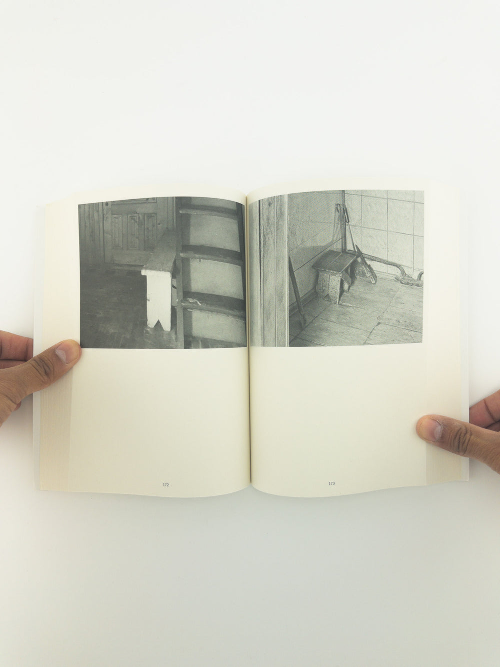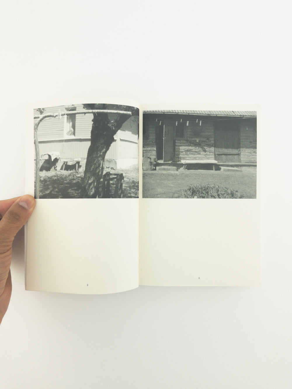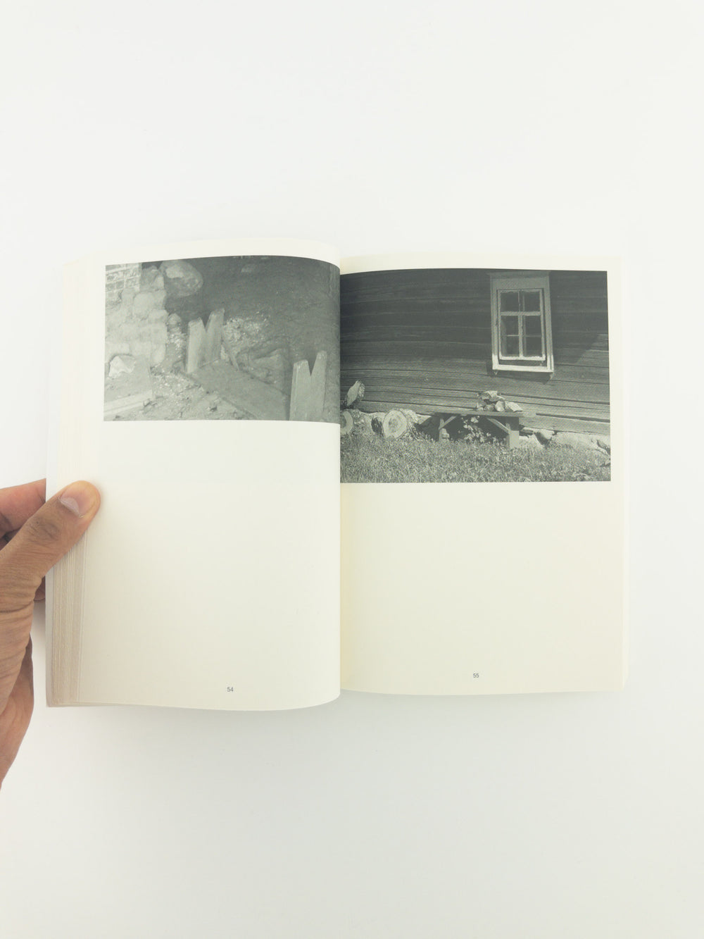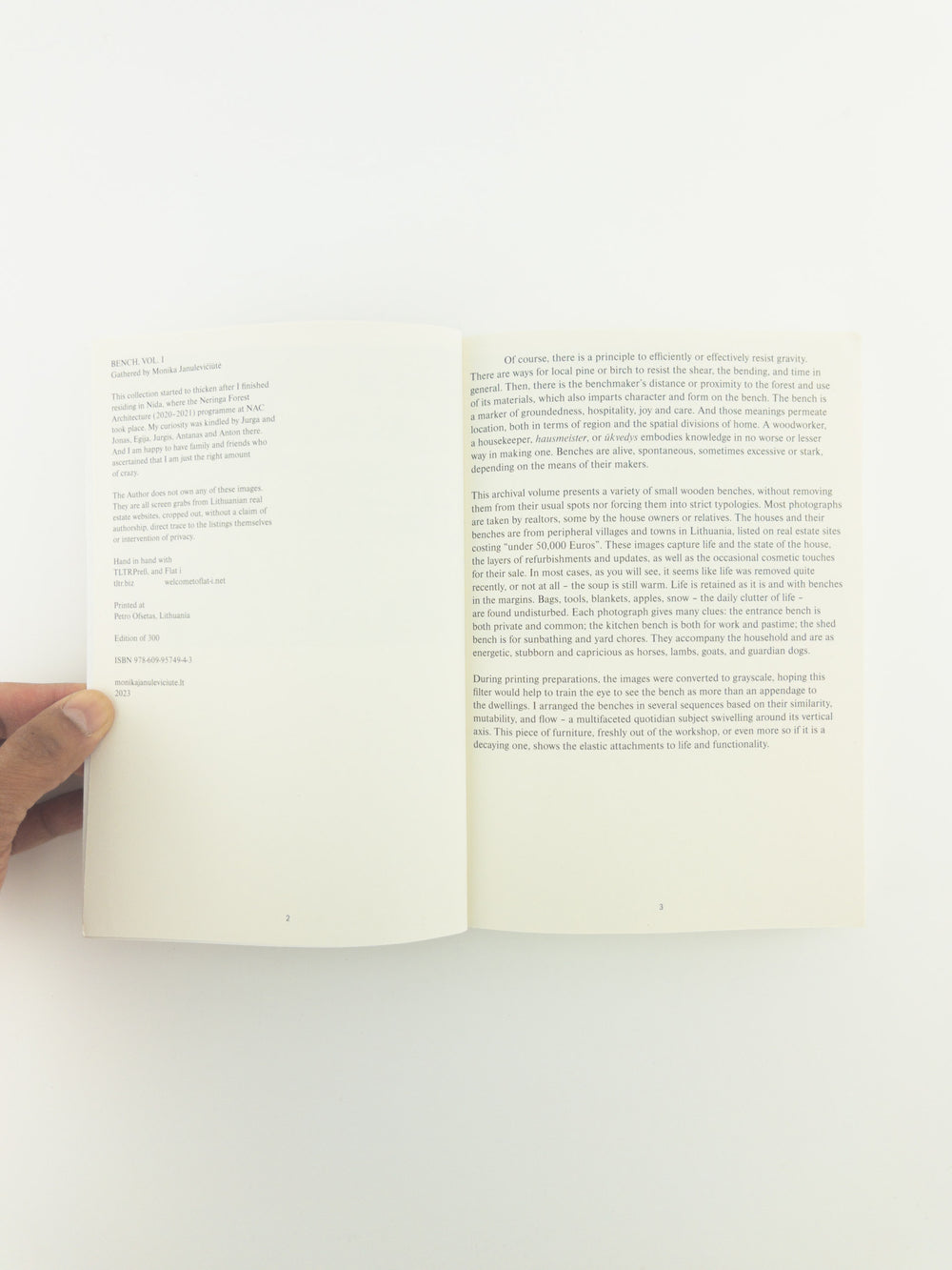 This archival volume presents a variety of small wooden benches, without removing them from their usual spots nor forcing them into strict typologies. Most photographs are taken by realtors, some by the house owners or relatives. The houses and their benches are from peripheral villages and towns in Lithuania, listed on real estate sites costing “under 50,000 Euros”. These images capture life and the state of the house, the layers of refurbishments and updates, as well as the occasional cosmetic touches for their sale. In most cases, as you will see, it seems like life was removed quite recently, or not at all – the soup is still warm. Life is retained as it is and with benches in the margins. Bags, tools, blankets, apples, snow – the daily clutter of life – are found undisturbed. Each photograph gives many clues: the entrance bench is both private and common; the kitchen bench is both for work and pastime; the shed bench is for sunbathing and yard chores. They accompany the household and are as energetic,