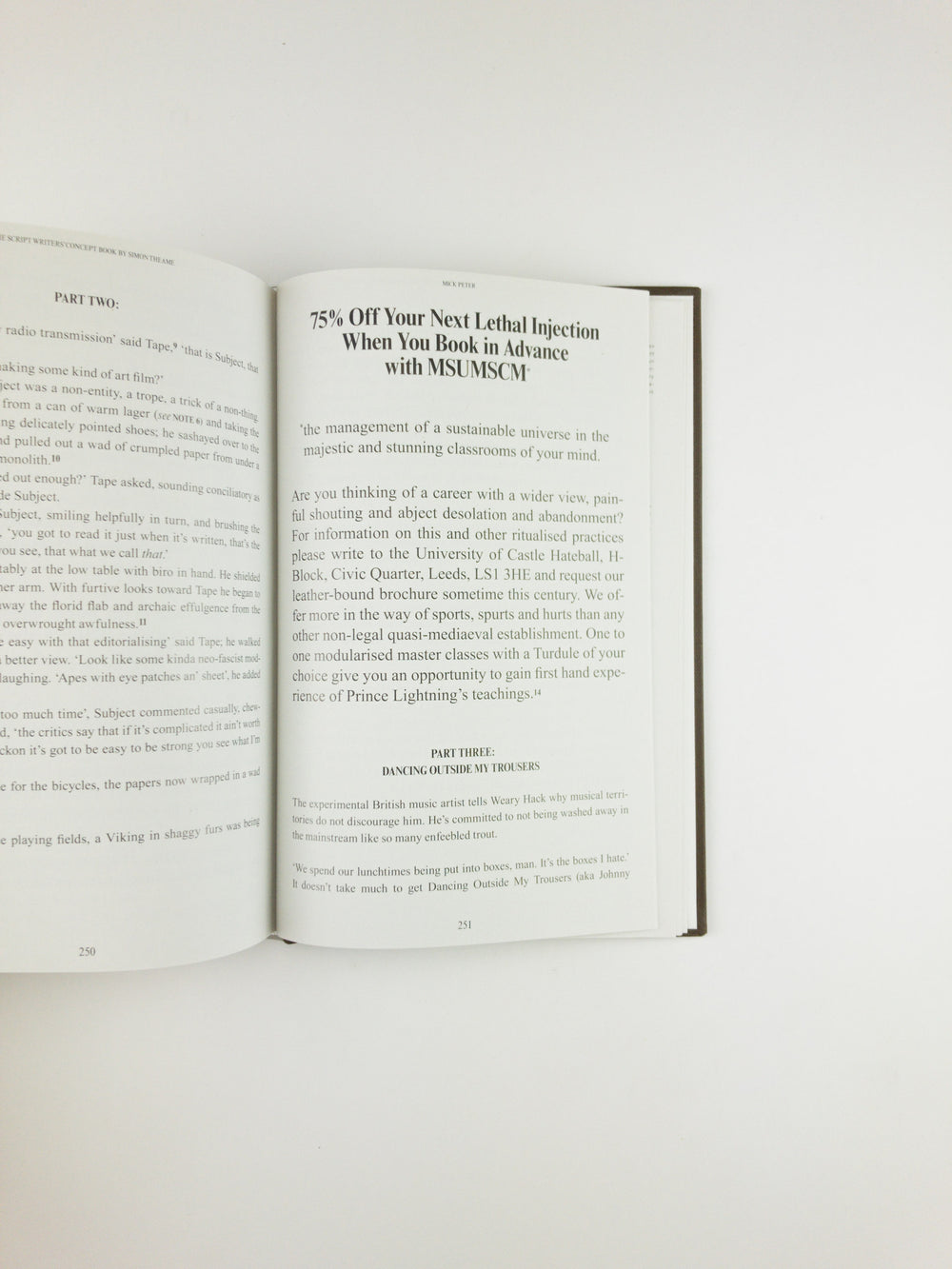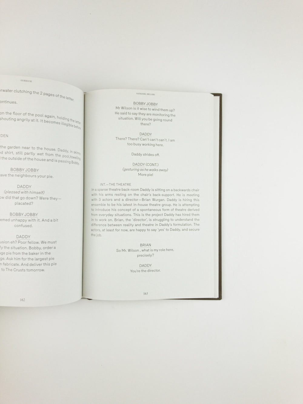 An experimental monograph that explores Nathaniel Mellors’s linguistic manipulation, absurdist comedy, and aspects of video, sculpture, performance, and critical writing interwoven in his work. Featuring a selection of his original scripts from 2006 onward that have since been developed into video and installation works, including Ourhouse (2010) and Brain One—Mózg Jeden (2006). Contributions by artist and writer Mick Peter and art critic John C. Welchman.
