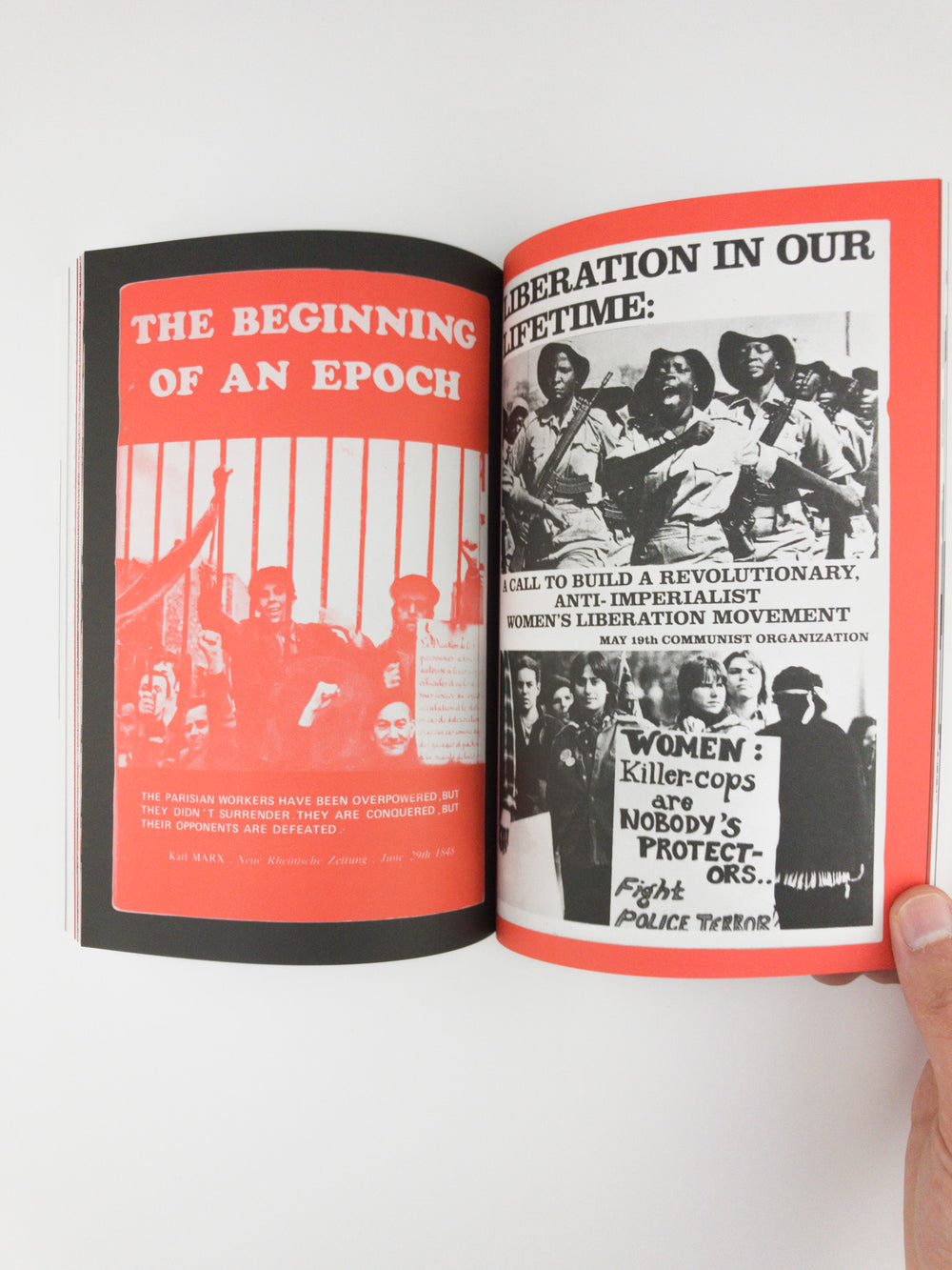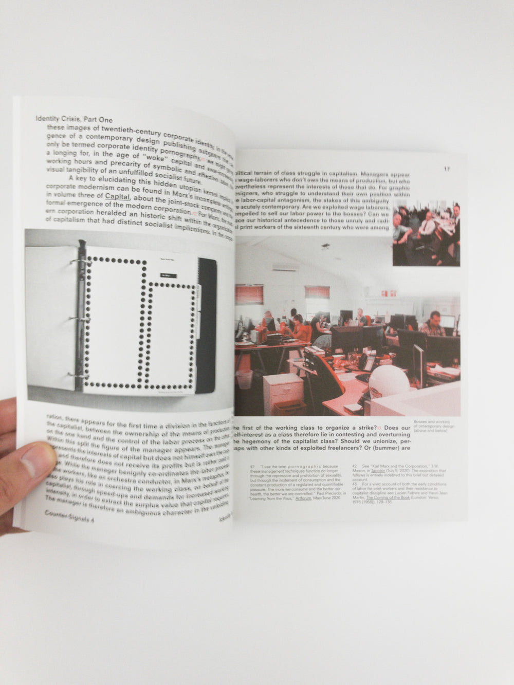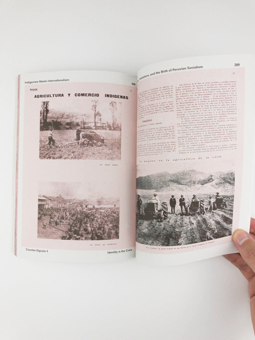 The fourth issue of Counter-Signals invokes, in black and bright red, texts and images to query the claims and break the aesthetic chains of “visual identity,” within and against late capitalism. What is an identity and what can we do about it? Proletarian negativity, the IBM design manual, chop suey cheap wasp workers, rowdy crinolines, tranquilizing camouflage, misprint capital, José Carlos Mariátegui, queers at war, indonesian punks on hope, and much much more, or less.
