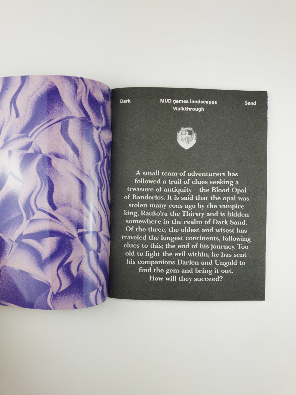 Dark Sand is Alain Vonck's guide through the hyperreal environments and landscapes of an early multi-user domain game, a precursor to the more commonly known MMORPG (online role-playing game). Medieval structures come head-to-head with glitchy bitmap backdrops and interspersed with passages of text that together form a deconstructed narrative world.