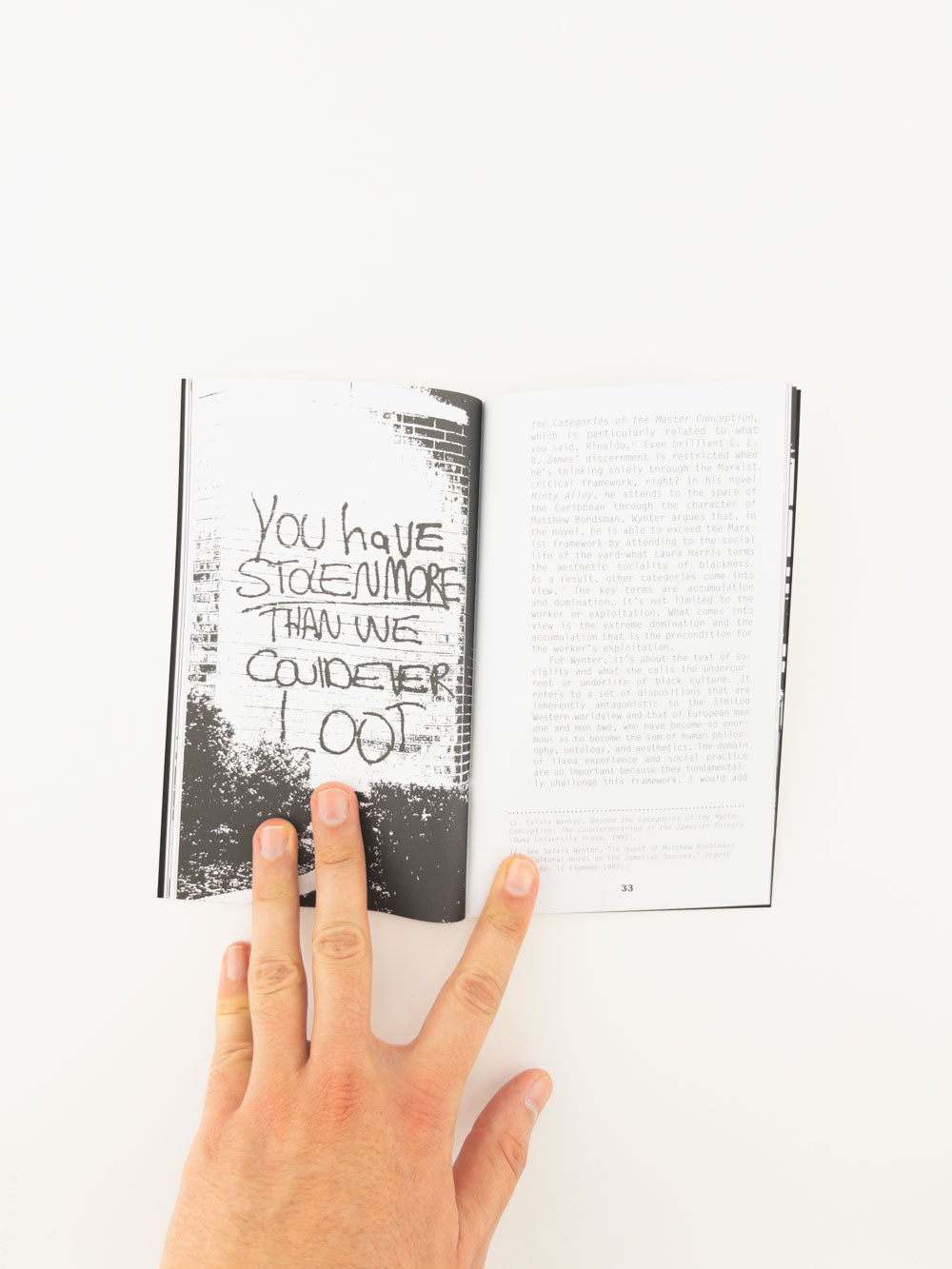 Volume 3 is titled Looting and is a conversation between Saidiya Hartman, Christina Sharpe, Rinaldo Walcott, and Vicky Osterweil. They discuss looting as a modality of Black struggle and a form of contesting whiteness, property, politics, and modes of governance. Looting is discussed via aesthetic theory, but also in the ways it has been and is used by states to protect constituent modes of power and to cultivate Western culture. It is an engagement with centuries of Black radical thought, history, and social movements.