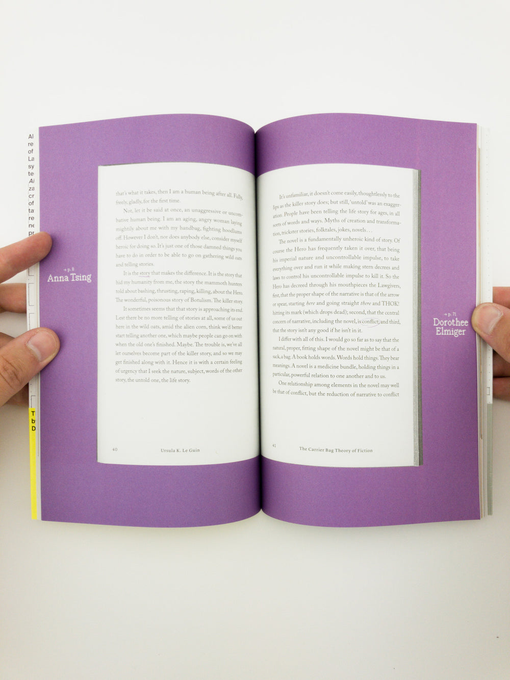 Ursula K. Le Guin’s 1986 essay “The Carrier Bag Theory of Fiction” presents a feminist story of technology centering on the collective sustenance of life, and reimagines the carrier bag as a tool for telling strangely realistic fictions. Here, new writings and images respond to her narrative practice of worldmaking through gathering and holding.