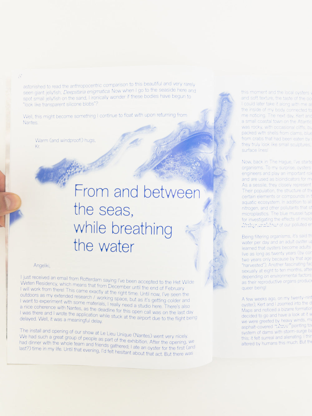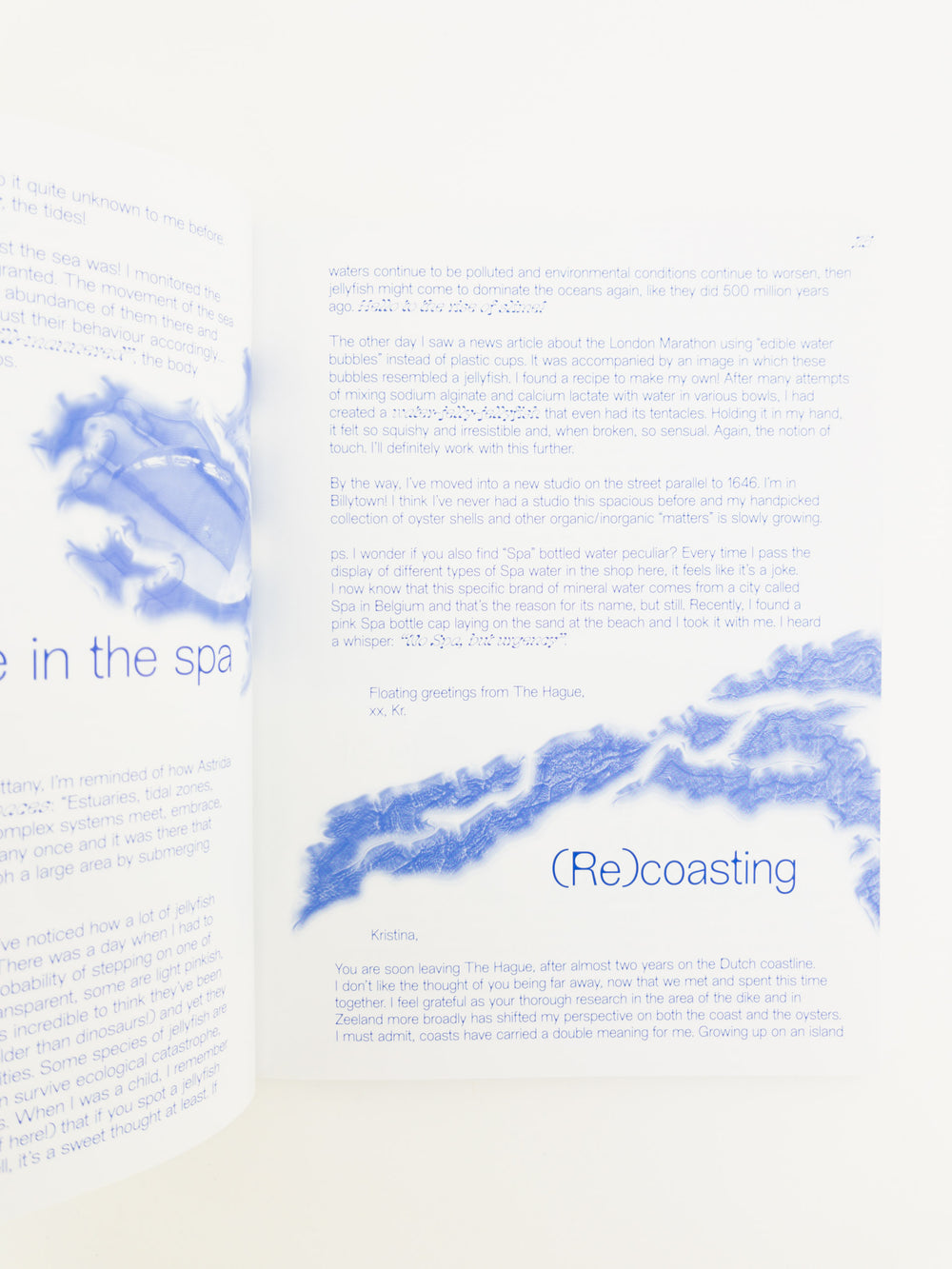 Exploring Kristina Õllek’s marine and coastal ecological interest, the publication Filter Feeders, Double Binds & Other Blooms invites us to think with her four year long working process, based on research and personal observations around anthropocentric influences on marine ecology. Focusing on the North Sea and its filter feeders: blue mussels, oysters and the expanding jellyfish population; as well as on the Baltic