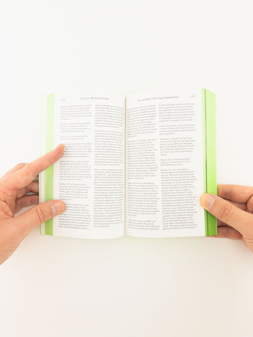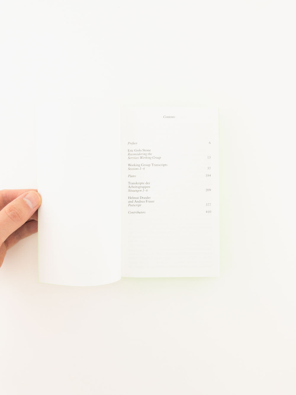 Held on January 22 and 23, 1994, the candid discussions between the organizers, Kunstraum representatives, and invited practitioners were video-recorded. Newly-produced transcripts of this compelling recording are presented here in English and German, documenting the entirety of the debut Services Working Group discussions. These transcripts are supplemented by newly-digitized photograph documentation of the conversations and a newly-commissioned post-script text by Draxler and Fraser that reexamines Services in light of current discussions around the socioeconomic conditions of art and its institutions.