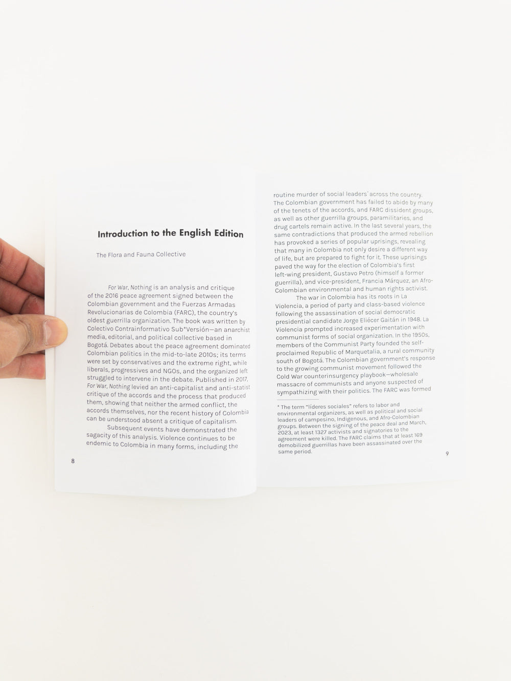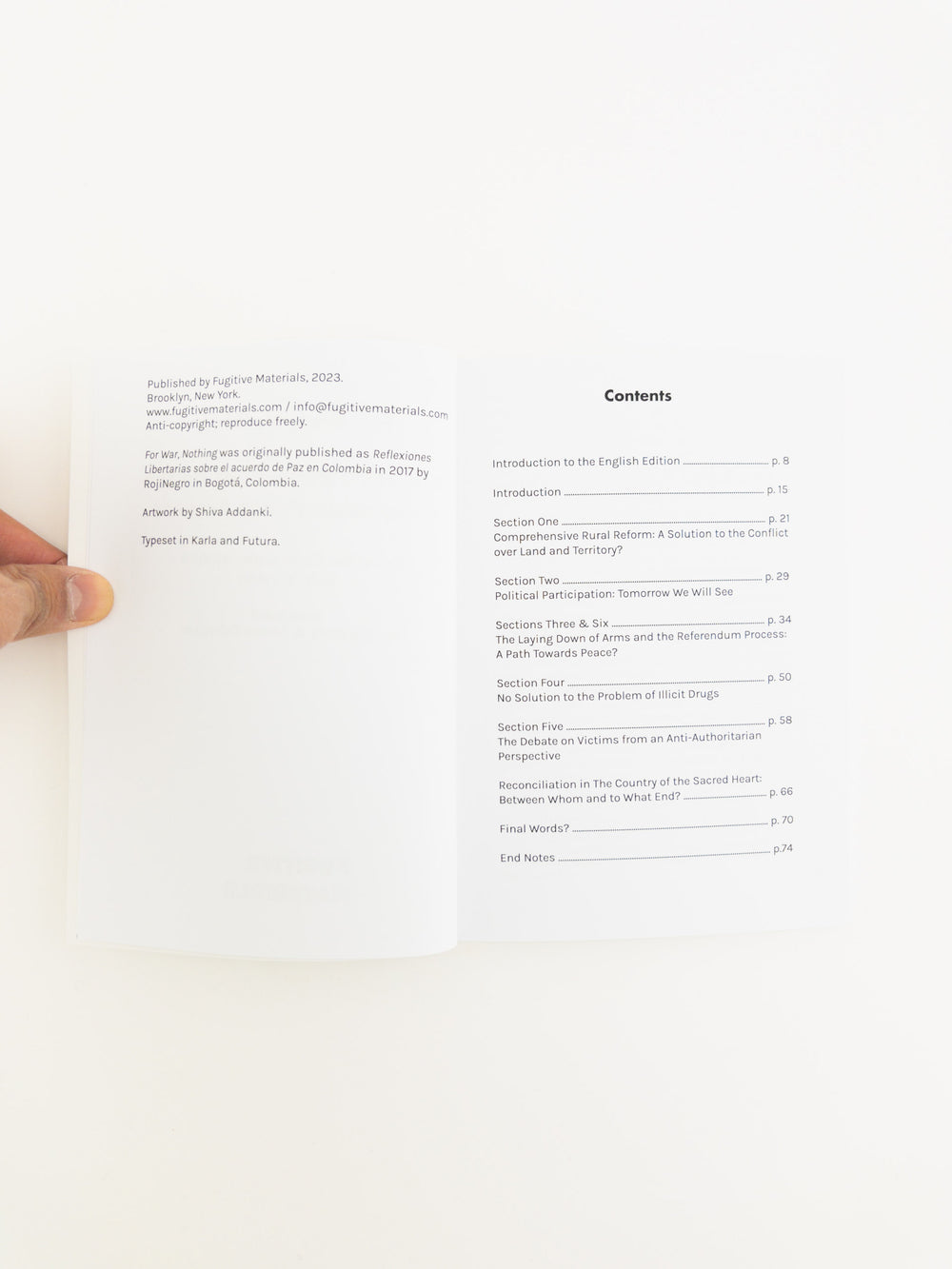 For War, Nothing was originally published as Reflexiones Libertarias Sobre el Acuerdo de Paz en Colombia in 2017 by RojiNegro in Bogotá, Colombia.