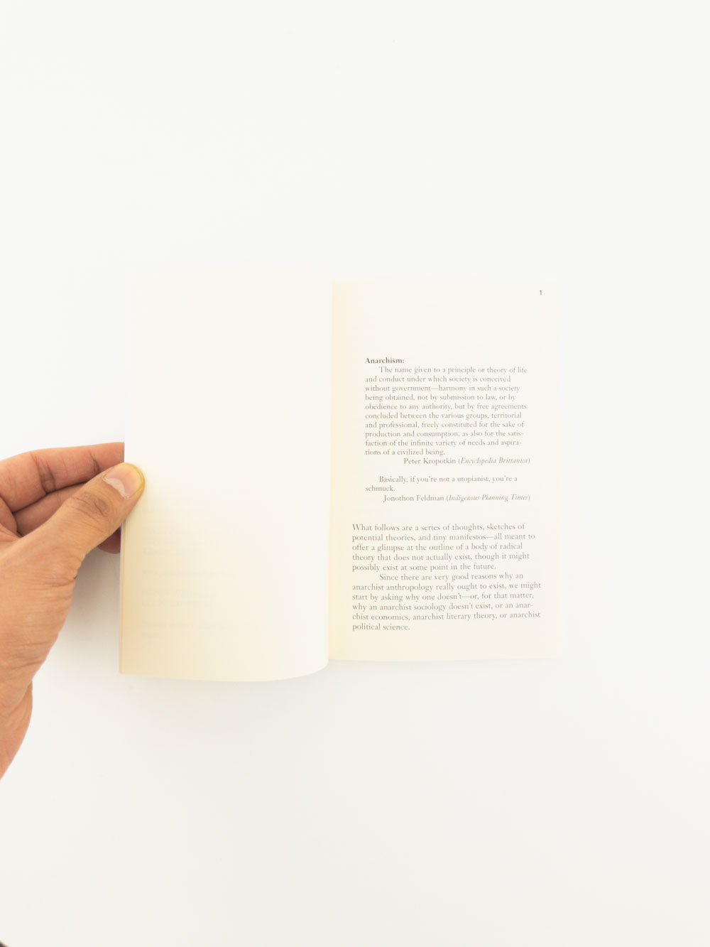 Everywhere anarchism is on the upswing as a political philosophy—everywhere, that is, except the academy. Anarchists repeatedly appeal to anthropologists for ideas about how society might be reorganized on a more egalitarian, less alienating basis. Anthropologists, terrified of being accused of romanticism, respond with silence . . . . But what if they didn’t?