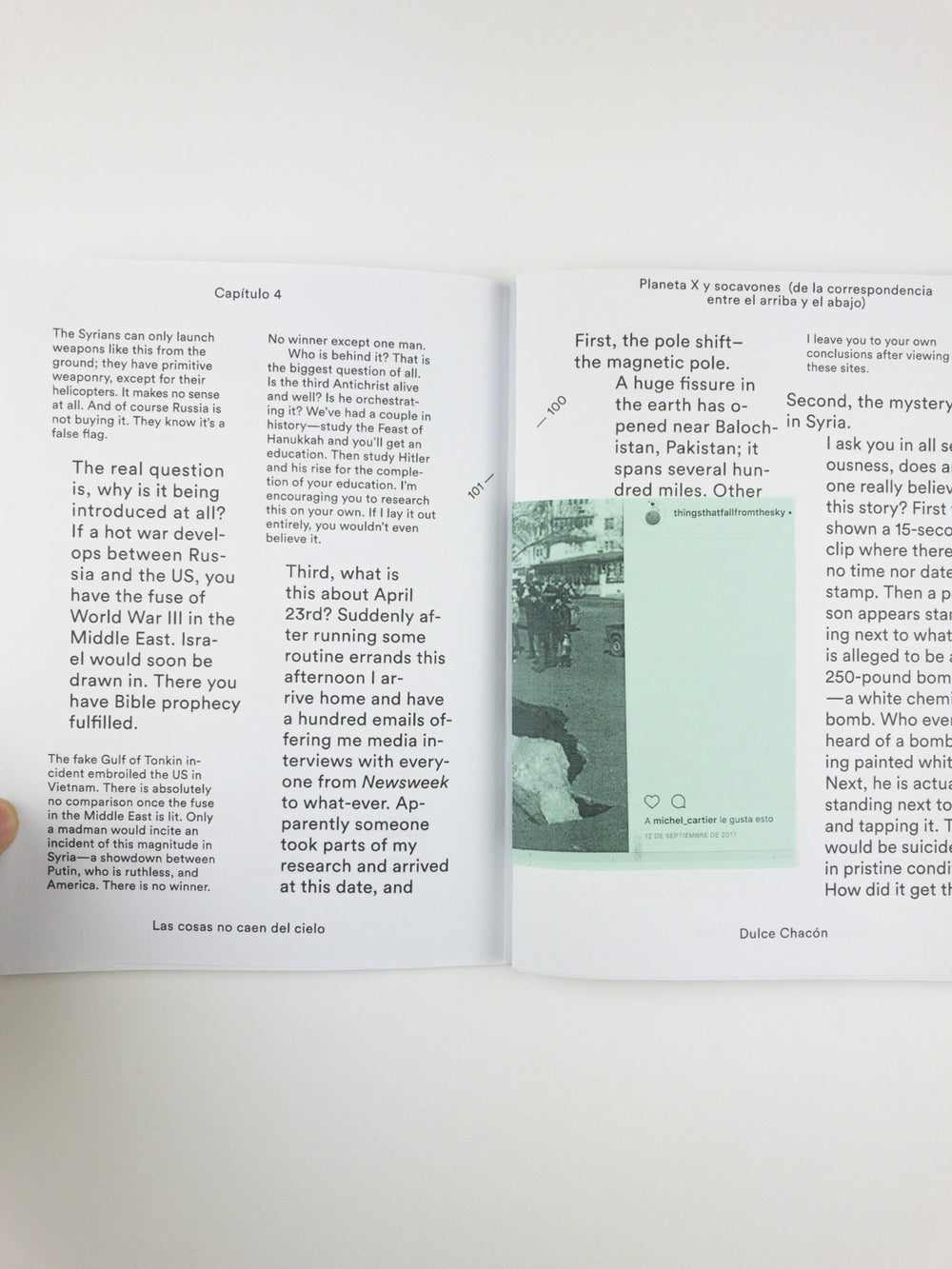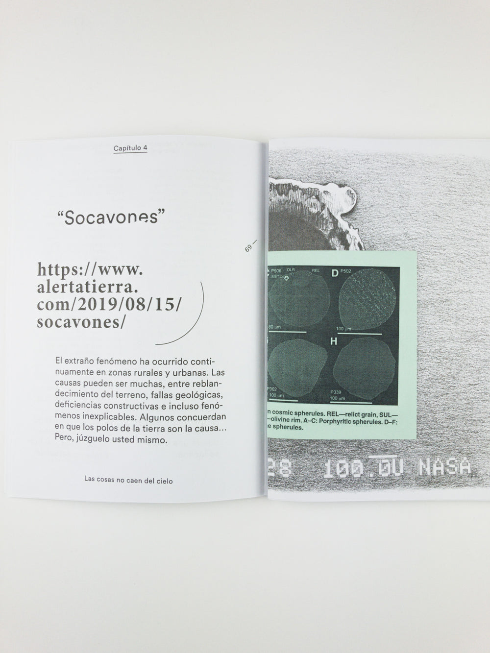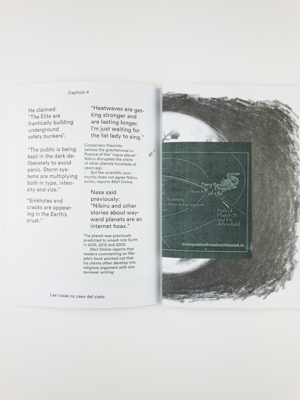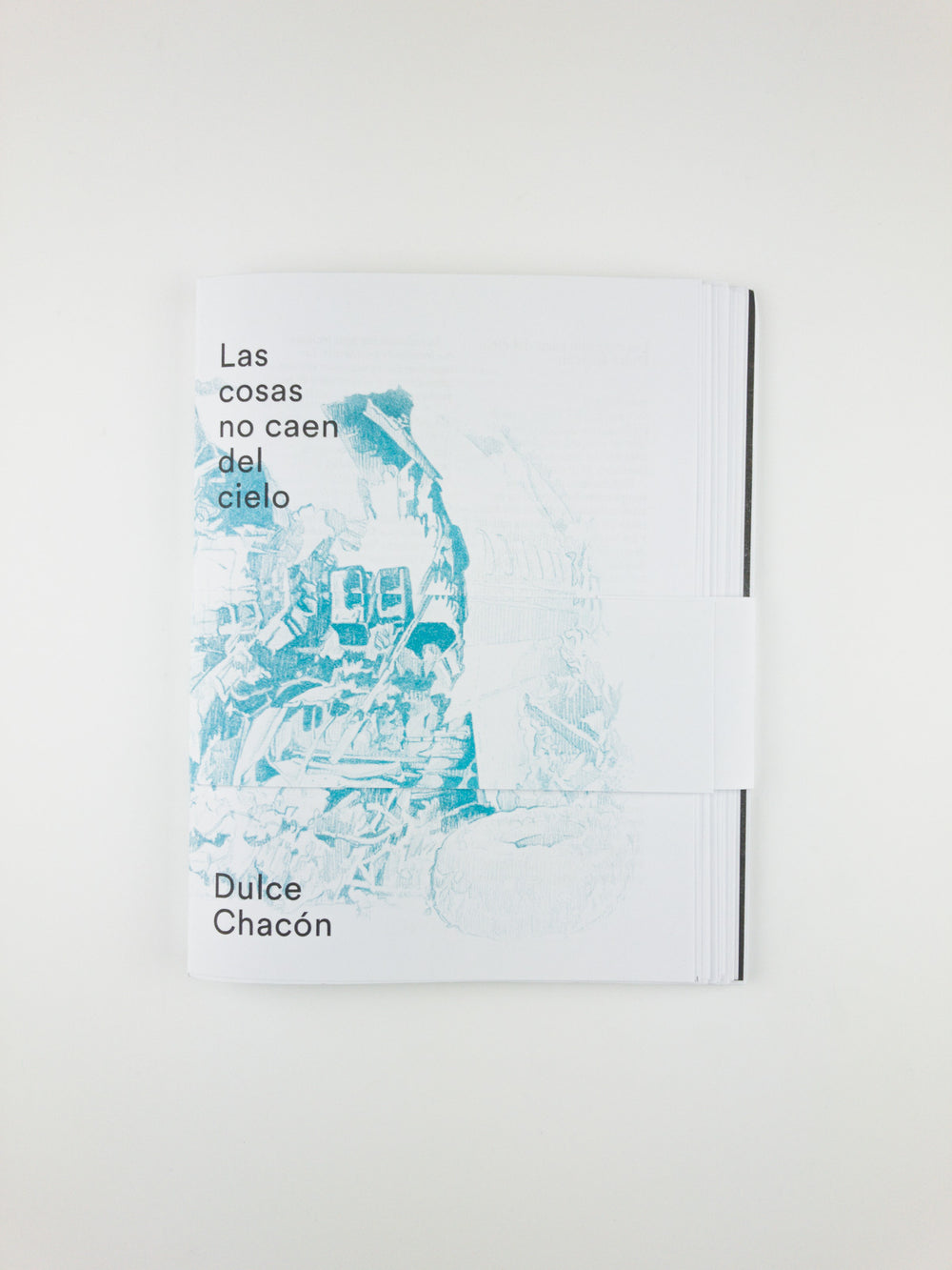 Las cosas no caen del cielo es parte del proyecto Las cosas caen del cielo (que no siempre), de la artista Dulce Chacón, en el recoge narrativas (reales y ficticias), y se apropia de ellas y las transporta a su imaginario gráfico, en ese espacio paralelo que se empeña en construir con su dibujo. En el libro, Dulce recopila (a veces tergiversa) esas narraciones y las reconstruye convirtiéndolas en ficción al tiempo que las recrea con su dibujo y las revela mágicas y caóticas. Las cosas no caen del cielo juega con la formalidad del objeto y lo desarma para retar la atención del lector, invitándolo a descubrir su lógica y a rearmarlo cada vez, es un experimento-capricho generado del diálogo entre editor-artista que expande el horizonte donde leer la realidad no es un juego sencillo.