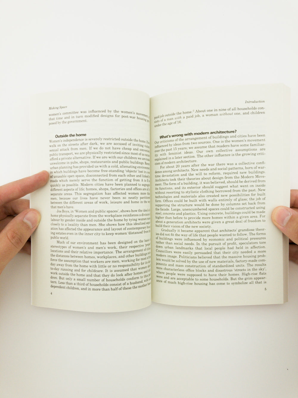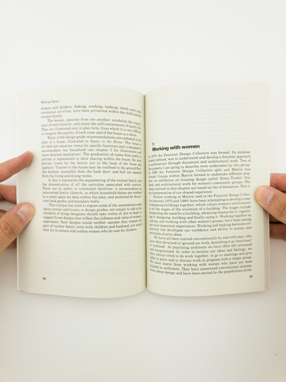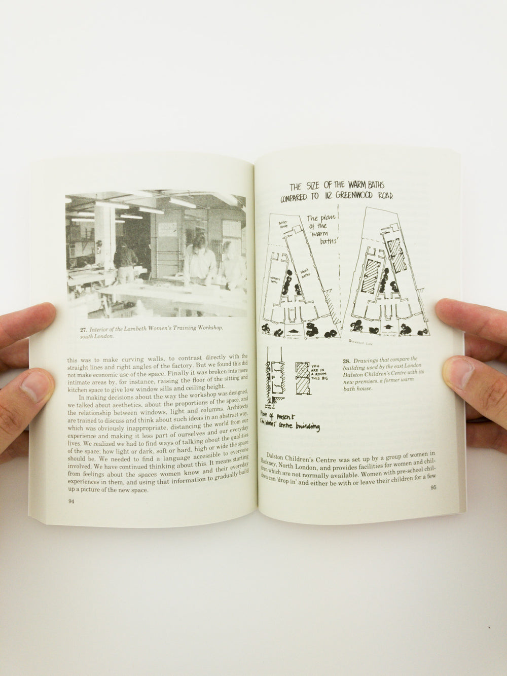 Some authors worked for the London-based Matrix Feminist Architect’s collective, an architectural practice set up in 1980 seeking to establish a feminist approach to design. They worked on design projects—such as community, children and women’s centres. Others were engaged in building work, teaching and research.