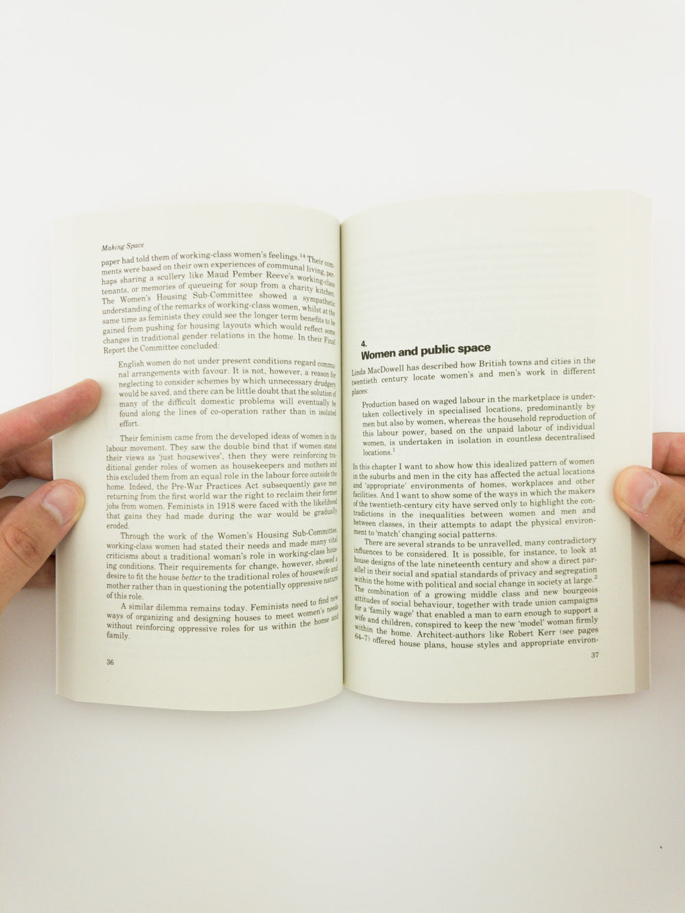 Making Space is a pioneering work first published in 1984 which challenges us to look at how the built environment impacts on women’s lives. It exposes the sexist assumptions on gender and sexuality that have a fundamental impact on the way buildings are designed and our cities are planned.