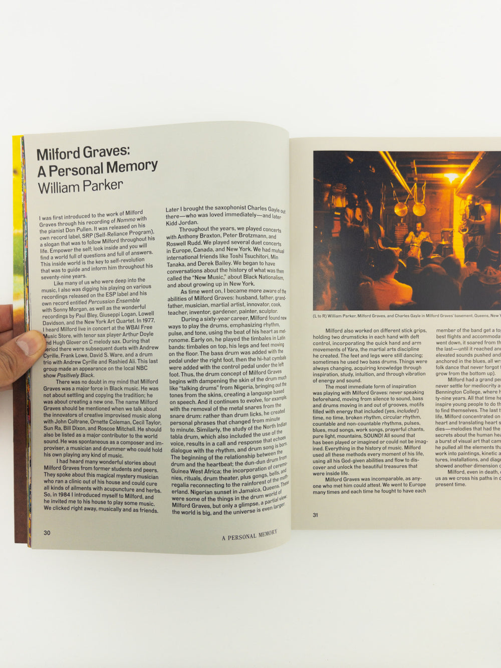 Milford Graves (1941–2021) was a revelatory force in music beginning in the mid-1960s, liberating the drummer from the role of time-keeper to instrumental improviser. A pivotal figure in the free jazz movement, he created groundbreaking work with Albert Ayler, the New York Art Quartet, Min Tanaka, and John Zorn, and led the way in artistic self-production. But his kaleidoscopic genius was not bound by music, and it led him to develop an oeuvre unprecedented in its breadth—from healing arts to botany, cardiac research to martial arts.