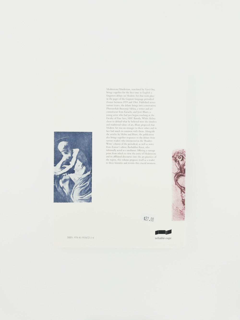 Modernism/Murderism, translated by Vasvi Oza, brings together, for the first time in English, a forgotten debate on Modern Art that took place in the pages of the Gujarati-language periodical Kumar between 1959 and 1964. Published across various issues, the debate brings into conversation Pherozeshah Rustomji Mehta, a writer and art connoisseur from Karachi, and Jyoti Bhatt, a young artist who had just begun teaching at the Faculty of Fine Arts, MSU Baroda. While Mehta chose to defend what he believed were the timeless and traditional values of art, Bhatt proposed that Modern Art was no stranger to these values and in fact had much in common with them. Alongside the articles by Mehta and Bhatt, the publication also brings together responses to the debate from various readers who interjected in the ‘Readers Write’ column of the periodical, as well as notes from Kumar’s editor, Bachubhai Ravat, who informally acted as a mediator. Offering a vantage point from which to view the entry of Modernism and its affiliated discourses into the art practices of the region, this volume proposes itself as a reader to these histories and revisits this crucial moment. - reliable copy