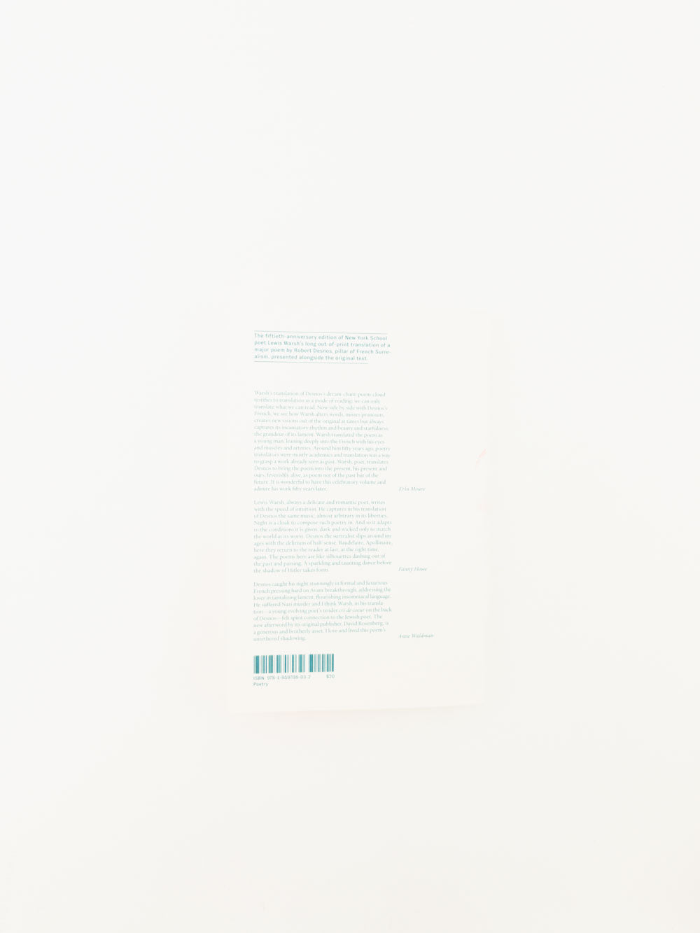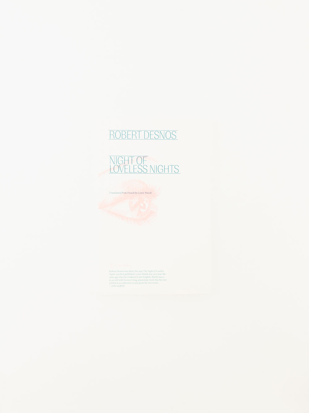 Desnos’s Night of Loveless Nights—written in tribute to legendary French chanteuse Yvonne George in 1926—is a maelstrom of romantic despair, political upswell, and psychedelic irony. John Ashbery’s claim that Frank O’Hara 1971 collected poems was “the founding of a new tradition” should be made for both Desnos’s poem and Warsh’s translation. Long unavailable, Warsh’s Desnos stands beside Ron Padgett’s Cendrars and John Ashbery’s Rimbaud, a sublime translation experiment of letting the language speak for itself—as had the poem’s author. Originally published in 1973 by poet and translator David Rosenberg in The Ant’s Forefoot chapbook series, Warsh’s translation is reproduced in this fiftieth anniversary edition alongside the French original, and with an afterword by Rosenberg.