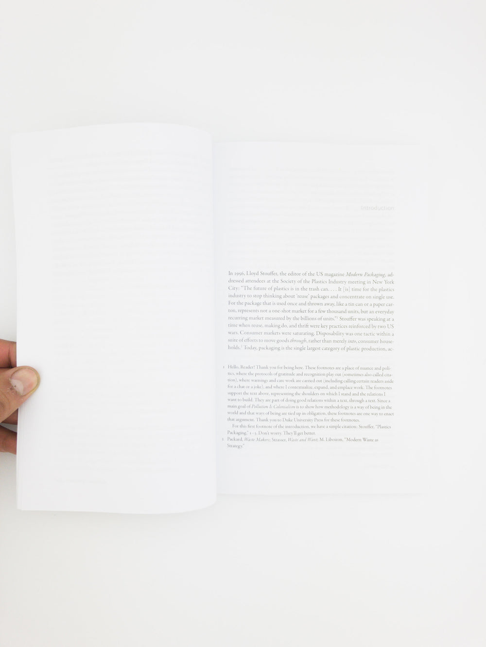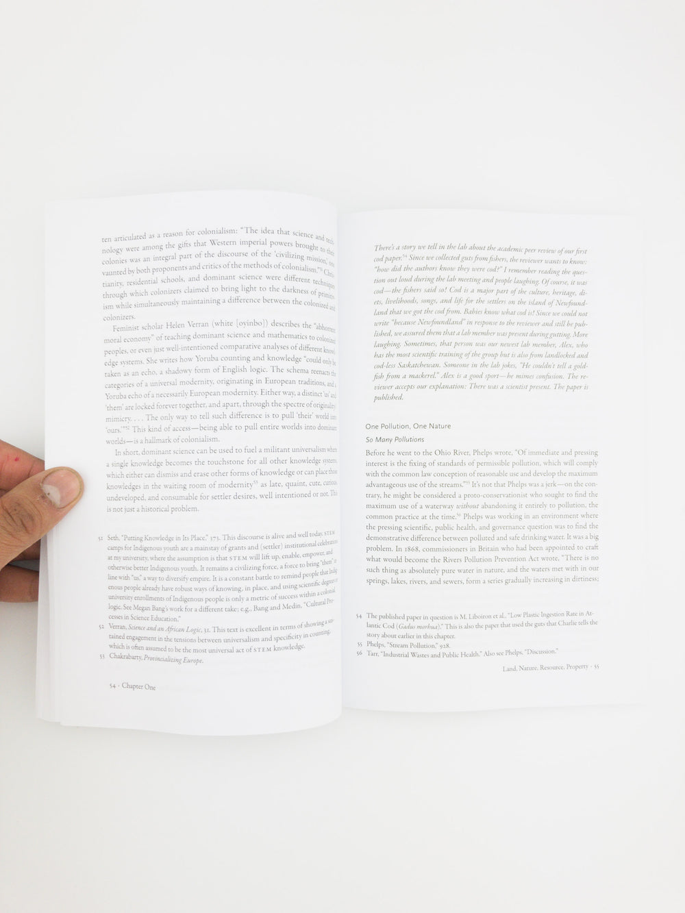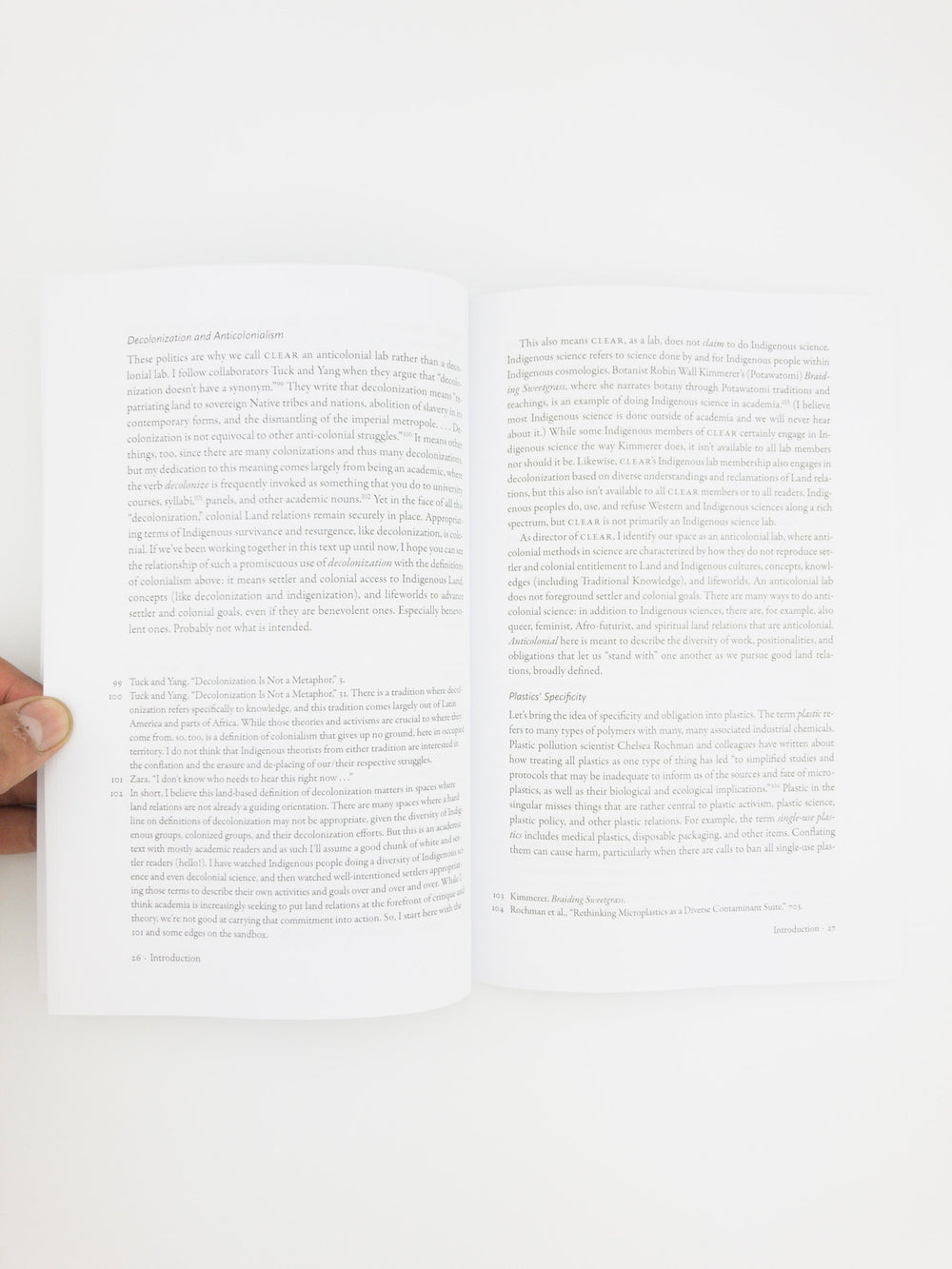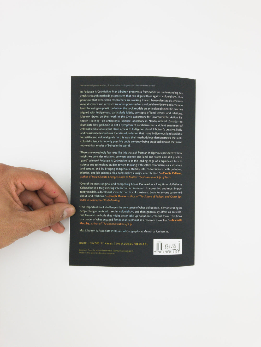 In Pollution Is Colonialism Max Liboiron presents a framework for understanding scientific research methods as practices that can align with or against colonialism. They point out that even when researchers are working toward benevolent goals, environmental science and activism are often premised on a colonial worldview and access to land. Focusing on plastic pollution, the book models an anticolonial scientific practice aligned with Indigenous, particularly Métis, concepts of land, ethics, and relations. Liboiron draws on their work in the Civic Laboratory for Environmental Action Research (CLEAR)—an anticolonial science laboratory in Newfoundland, Canada—to illuminate how pollution is not a symptom of capitalism but a violent enactment of colonial land relations that claim access to Indigenous land. Liboiron's creative, lively, and passionate text refuses theories of pollution that make Indigenous land available for settler and colonial goals. In this way, their methodology demonstrates that anticolonial science is not only possible but is currently being practiced in ways that enact more ethical modes of being in the world.