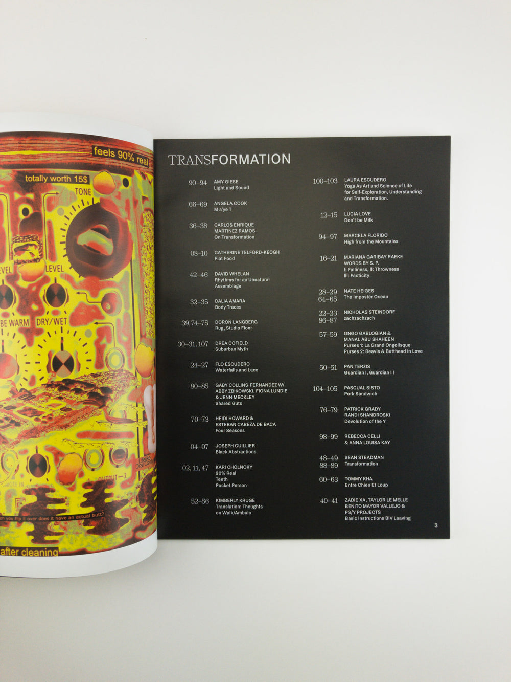 Issue 3: Transformation addresses the many manifestations of flux through submissions by Abby Zbikowski, Amy Giese, Angela Cook, Anna Louisa Kay, Benito Mayor Vallejo, Carlos Enrique Martinez Ramos, Catherine Telford Keogh, Dave Whelan, Dalia Amara, Doron Langberg, Drea Cofield, Esteban Cabeza de Baca, Fiona Lundie, Florencia Escudero, Gaby Collins Fernandez, Heidi Howard, Jenn Meckley, Joseph Cuillier, Kari Cholnoky, Kellie Konapelsky, Kimberly Kruge, Laura Emilia Escudero, Lucia Love, Manal Abu-Shaheen, Marcela Florido, Mariana Garibay Raeke, Nate Heiges, Nicholas Steindorf, Panayiotis Terzis, Pascual Sisto, Pat O Grady, Randi Shandroski, Rebecca Celli, Sally Thurer, Sean Steadman, Taylor Le Melle, Tommy Kha, and Zadie Xa.