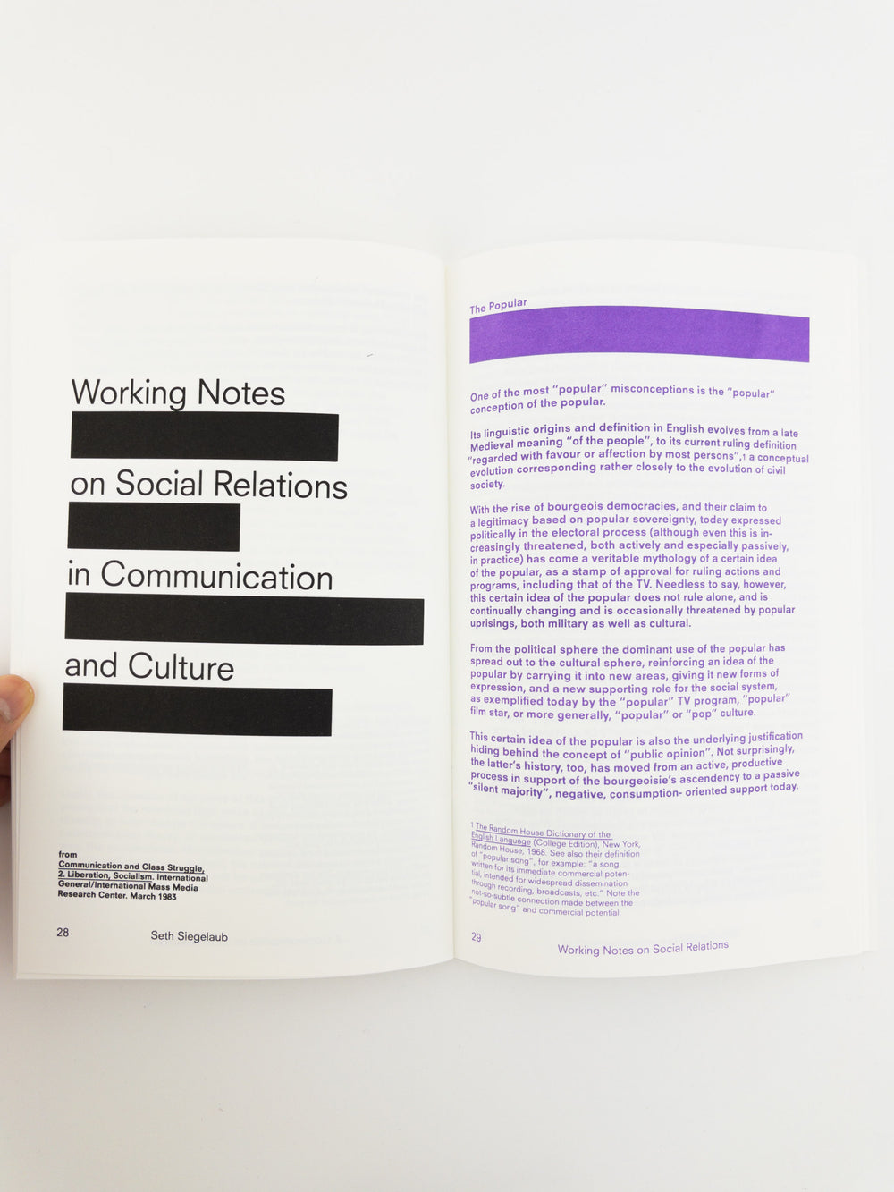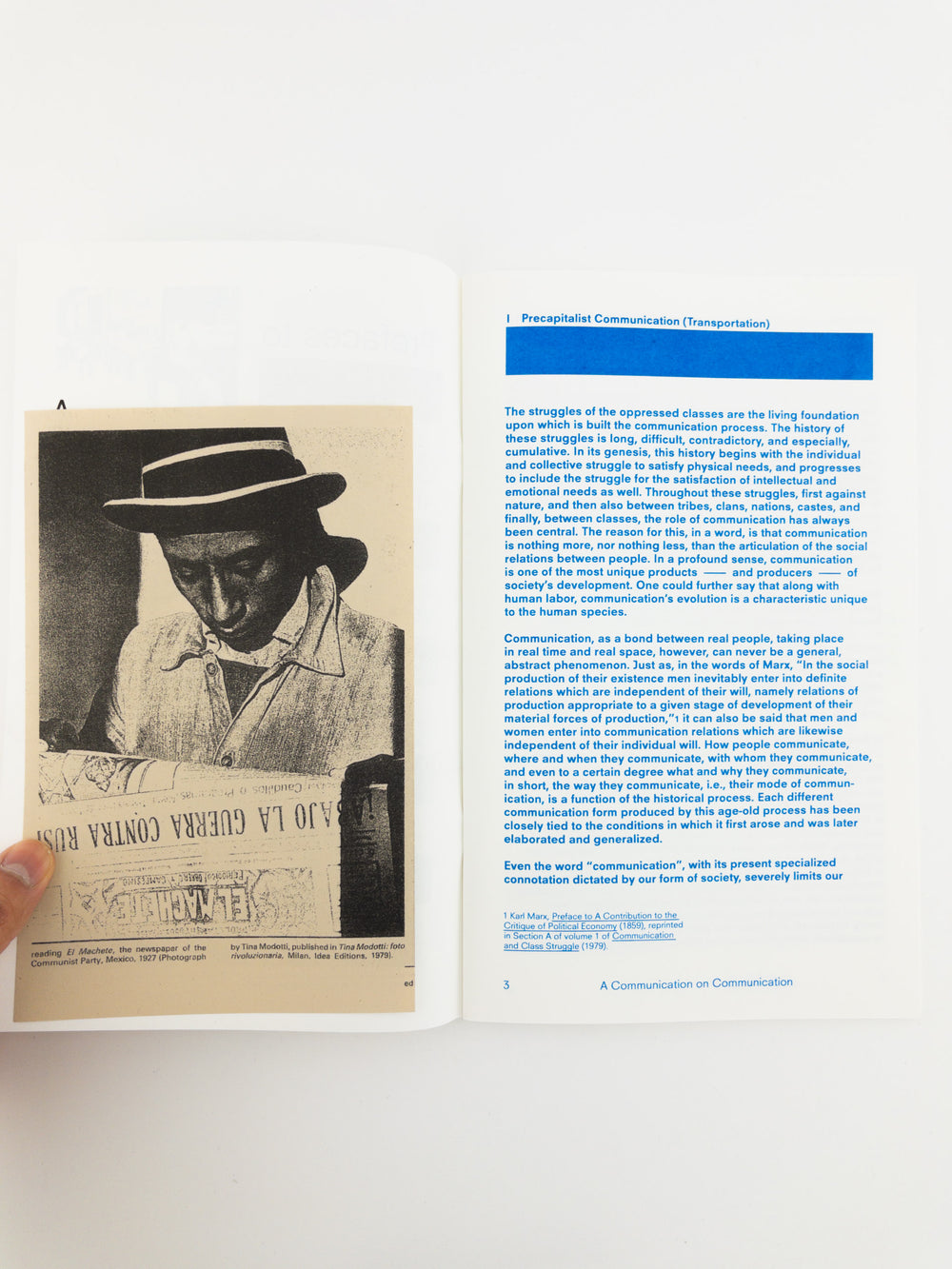 This small pamphlet aims to recirculate the two prefaces from Seth Siegelaub’s epic and out-of-print anti-capitalist anthologies Communication and Class Struggle. The texts reprinted here make timely interventions into a theory of communication and should be read again today for a number of reasons, not least for the indirect illumination they might cast on the algorithmic domination of our own late capitalist moment, in which forms of electronic media appear both utterly obscure in their relation to contents of political struggle, as well as unbreakably monopolistic.