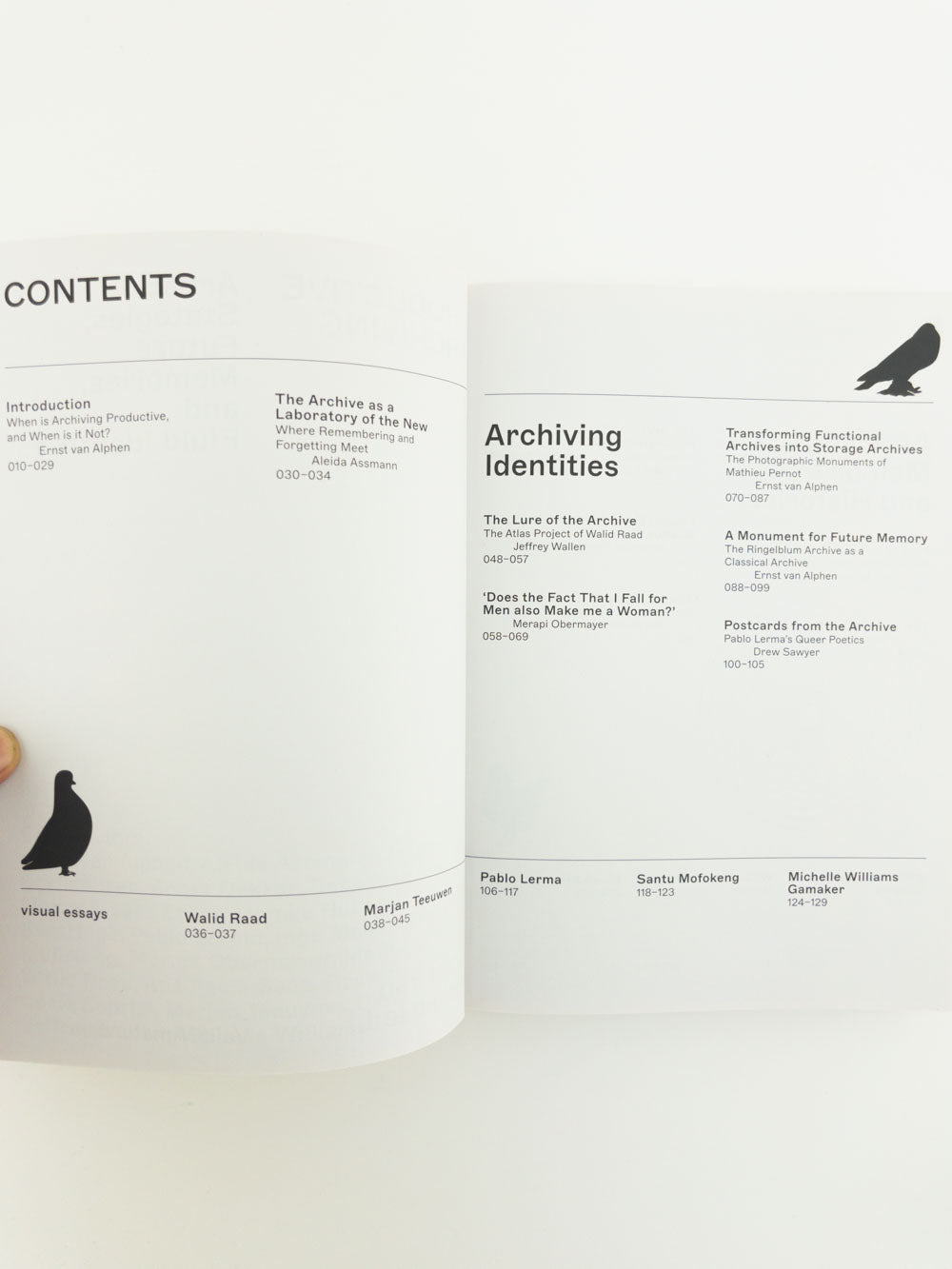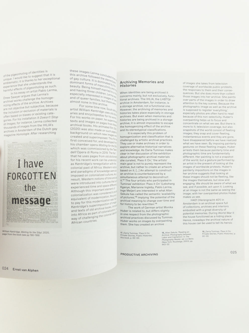 Authors include: Aleida Assmann, Annet Dekker, Lars Ebert, Sebastián Díaz Morales, Monika Huber, William Kentridge, Pablo Lerma, Inge Meijer, Santu Mofokeng, Merapi Obermayer, Walid Raad, Ana Paula Saab, Drew Sawyer, Carla Subrizi, Marjan Teeuwen, Daria Tuminas, Jeffrey Wallen.