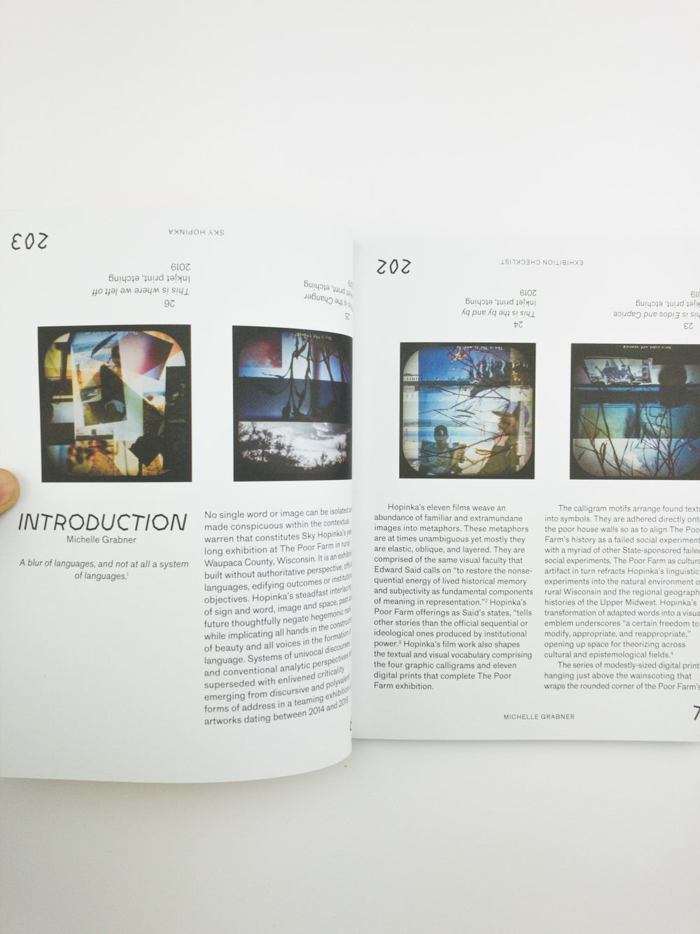 This book was published on the occasion of the exhibition of Sky Hopinka's work at the Poor Farm, Manawa, WI USA, 2019-2020