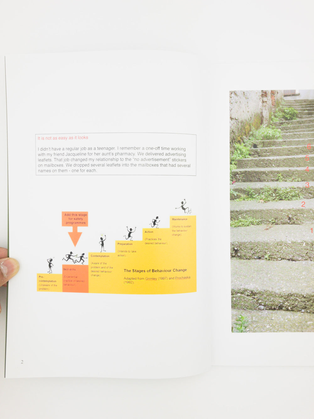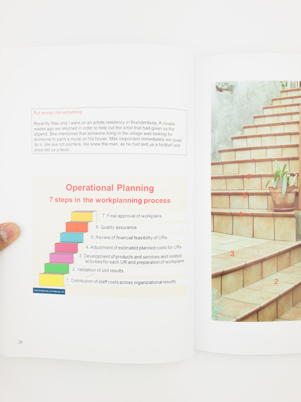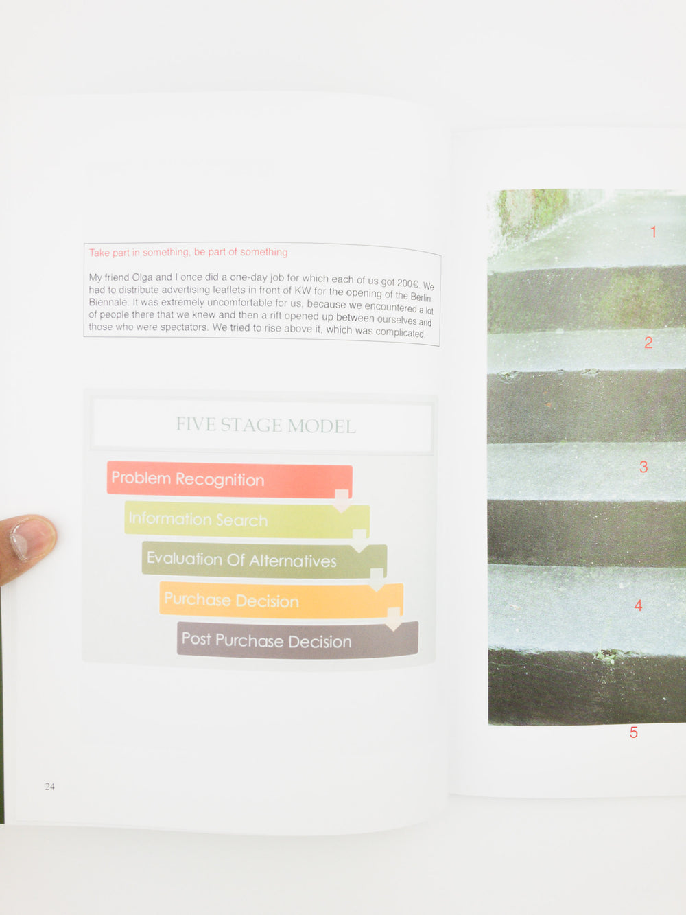 In Slippery Stairs/Glitschige Stufen Leonie Nagel combines texts with diagrams and photographs. The texts are concerned with wage labor experiences. The diagrams describe paths with start and finish points and the photographs show staircases on which one can retrace such paths. However, it is often unclear whether the highest number of steps will take you to the top and if the first step is really the beginning, since the starting point cannot be the same for everyone, as much as it would be desirable.