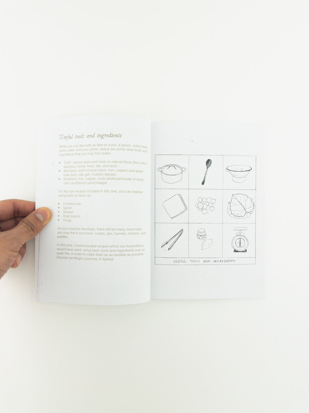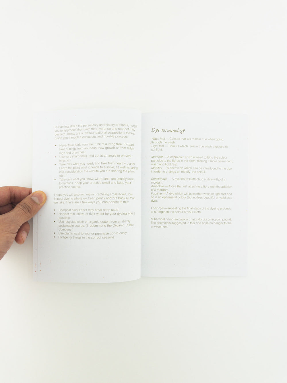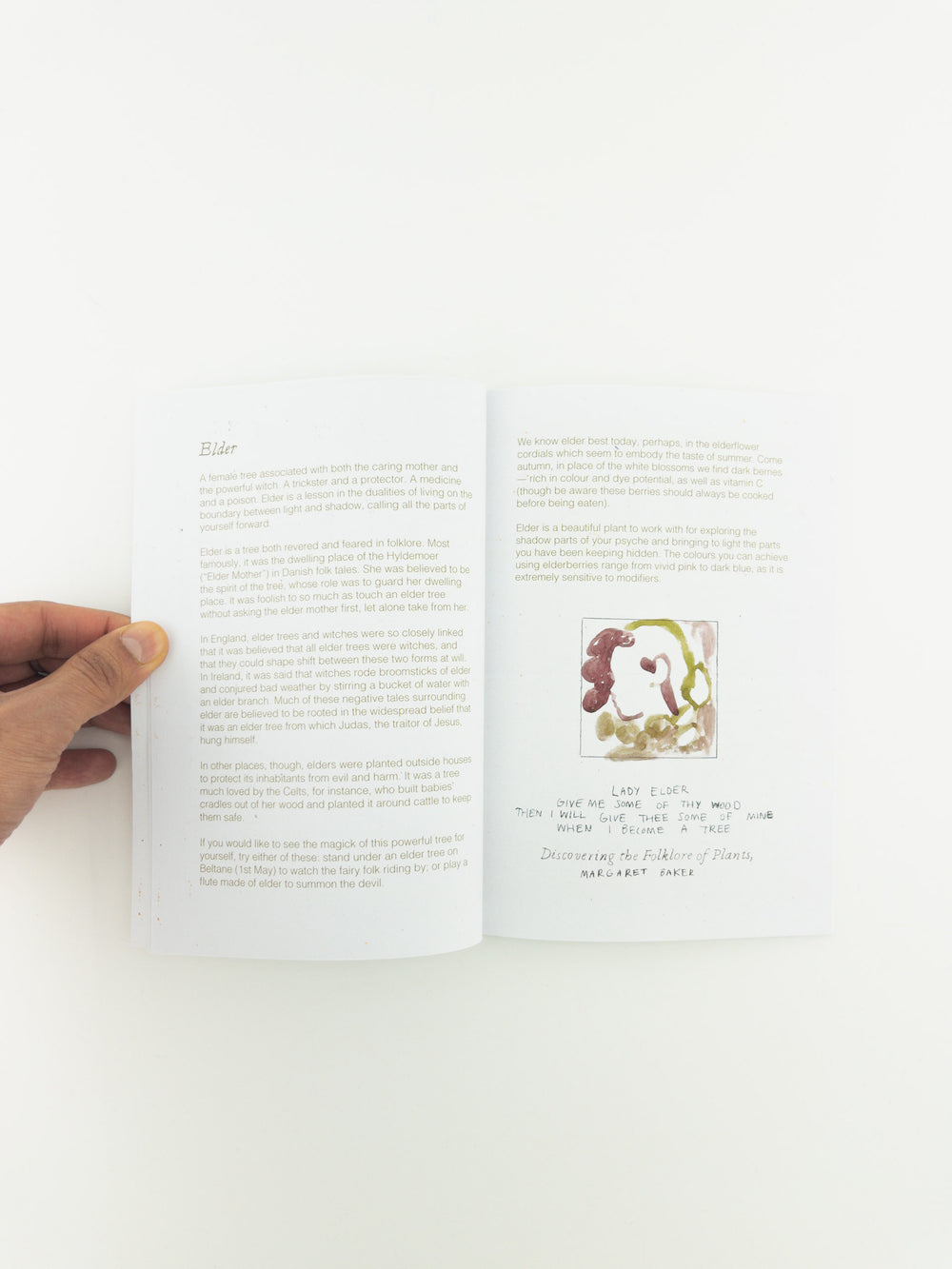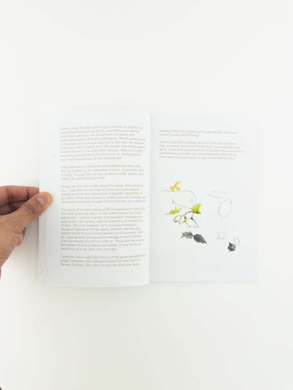 This zine turns our eyes to the great histories of natural dyers. Women, witches and healers throughout time have practised dyeing out of necessity and joy, and passed down the sacred knowledge to their children. Now rooted in the pages of this zine, we honour these women - the women who taught us how to deliver our babies, to use herbs as medicines, to cook, spin, sew, and dye. It features 10 dye recipes available to any forager, alongside their accompanying folklore. Including oak, apple, and elder, this zine will teach readers the basics of natural dyeing with local and readily available ingredients.
