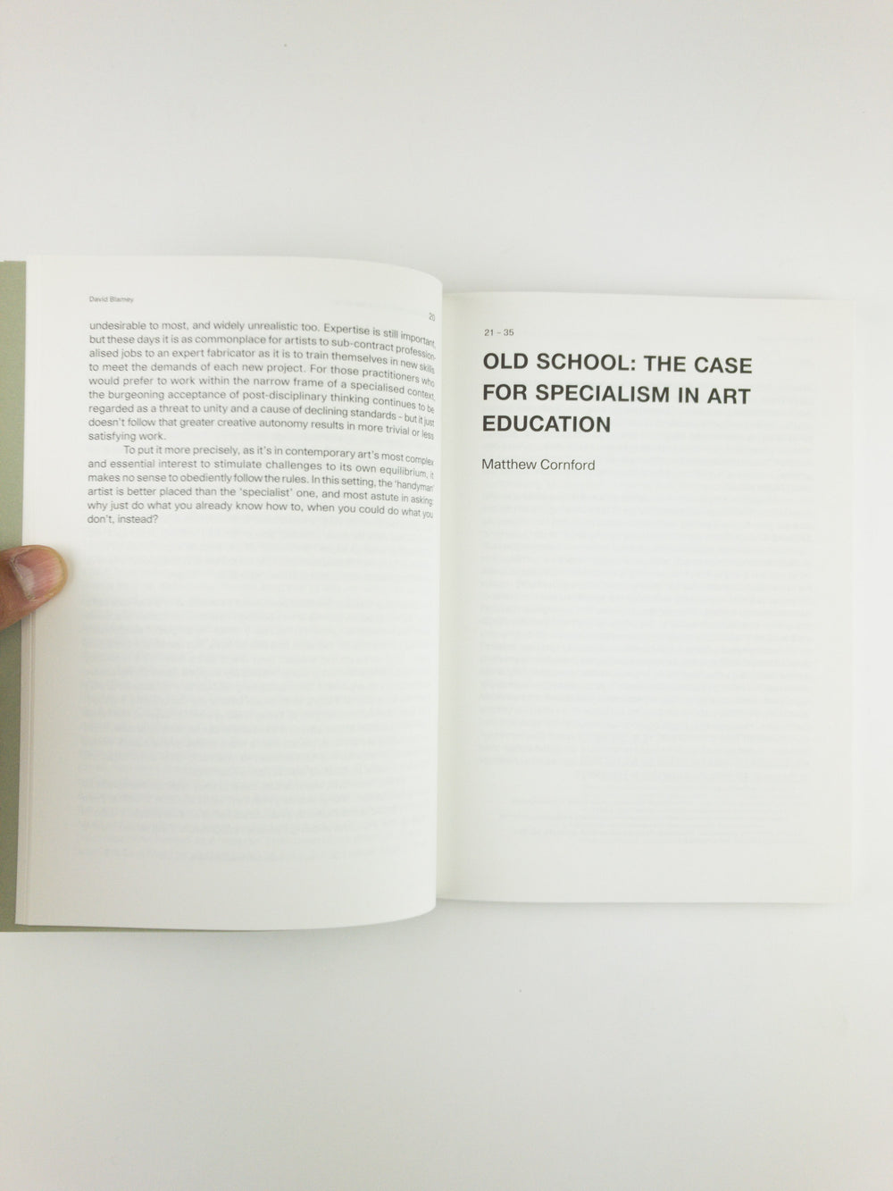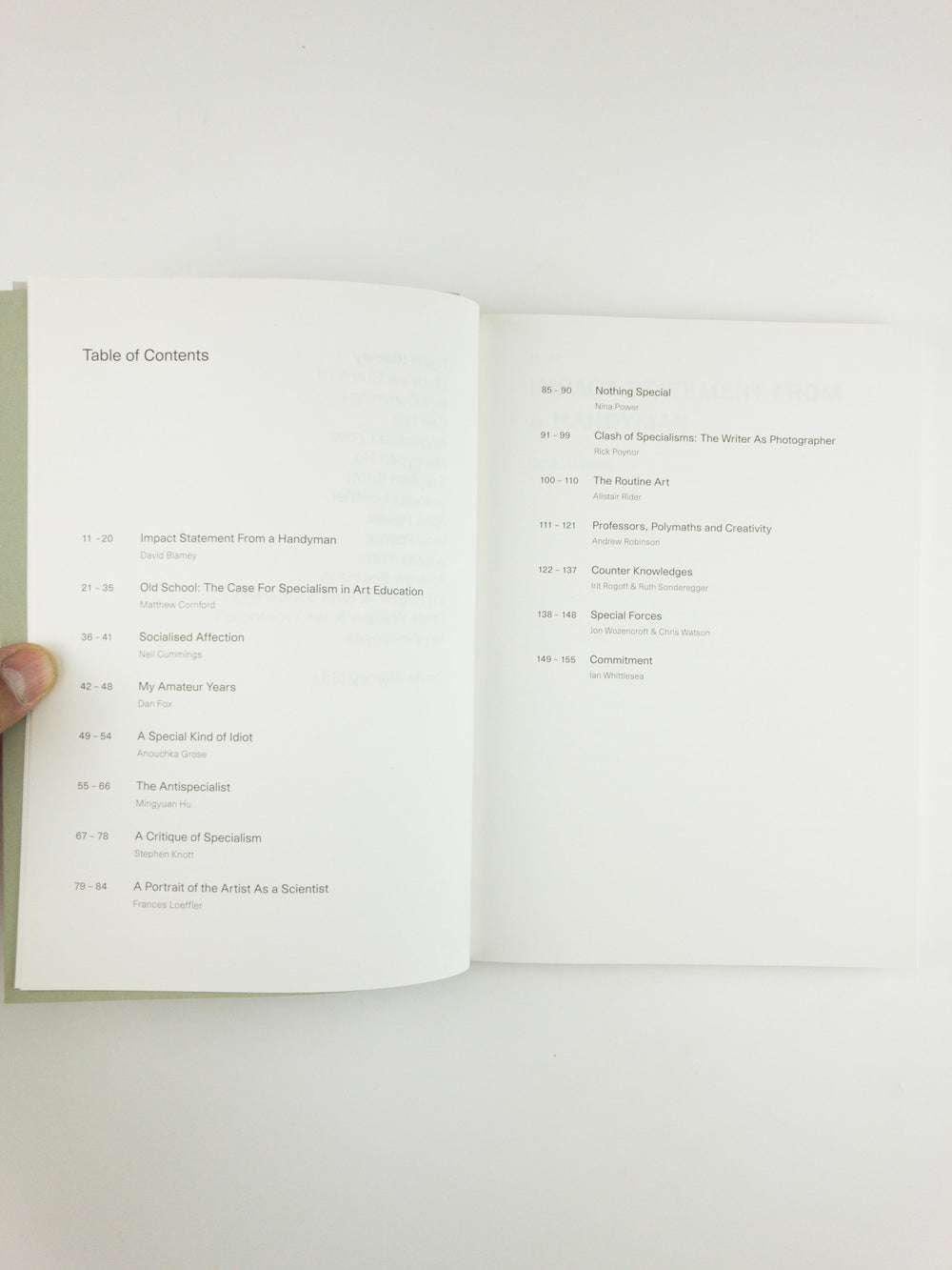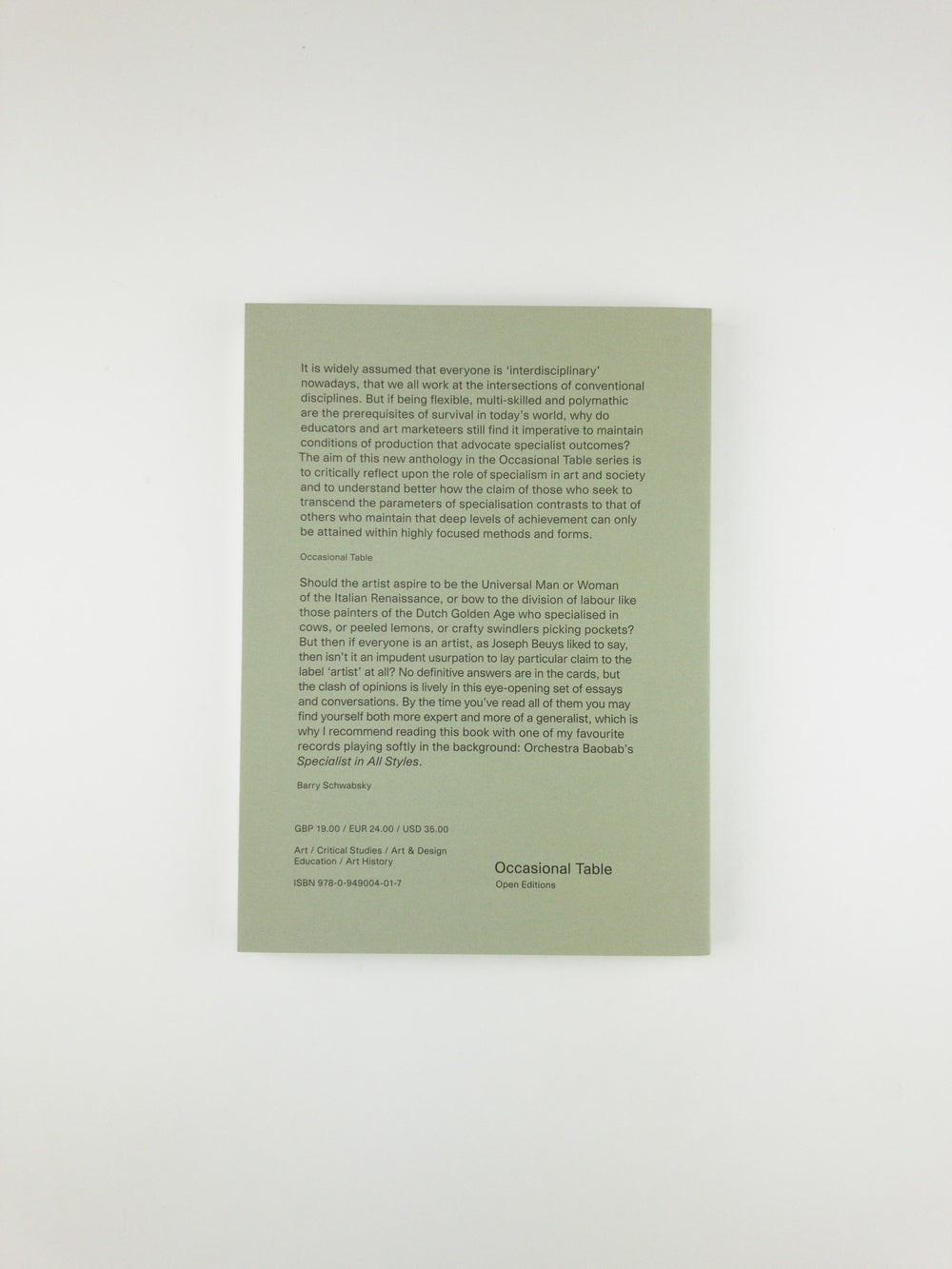 It is widely assumed that everyone is ‘interdisciplinary’ nowadays, that we all work at the intersections of conventional disciplines. But if being flexible, multi-skilled and polymathic are the prerequisites of survival in today’s world, why do educators and art marketeers still find it imperative to maintain conditions of production that advocate specialist outcomes? The aim of this new anthology in the Occasional Table series is to critically reflect upon the role of specialism in art and society and to understand better how the claim of those who seek to transcend the parameters of specialization contrasts to that of others who maintain that deep levels of achievement can only be attained within highly focused methods and forms.