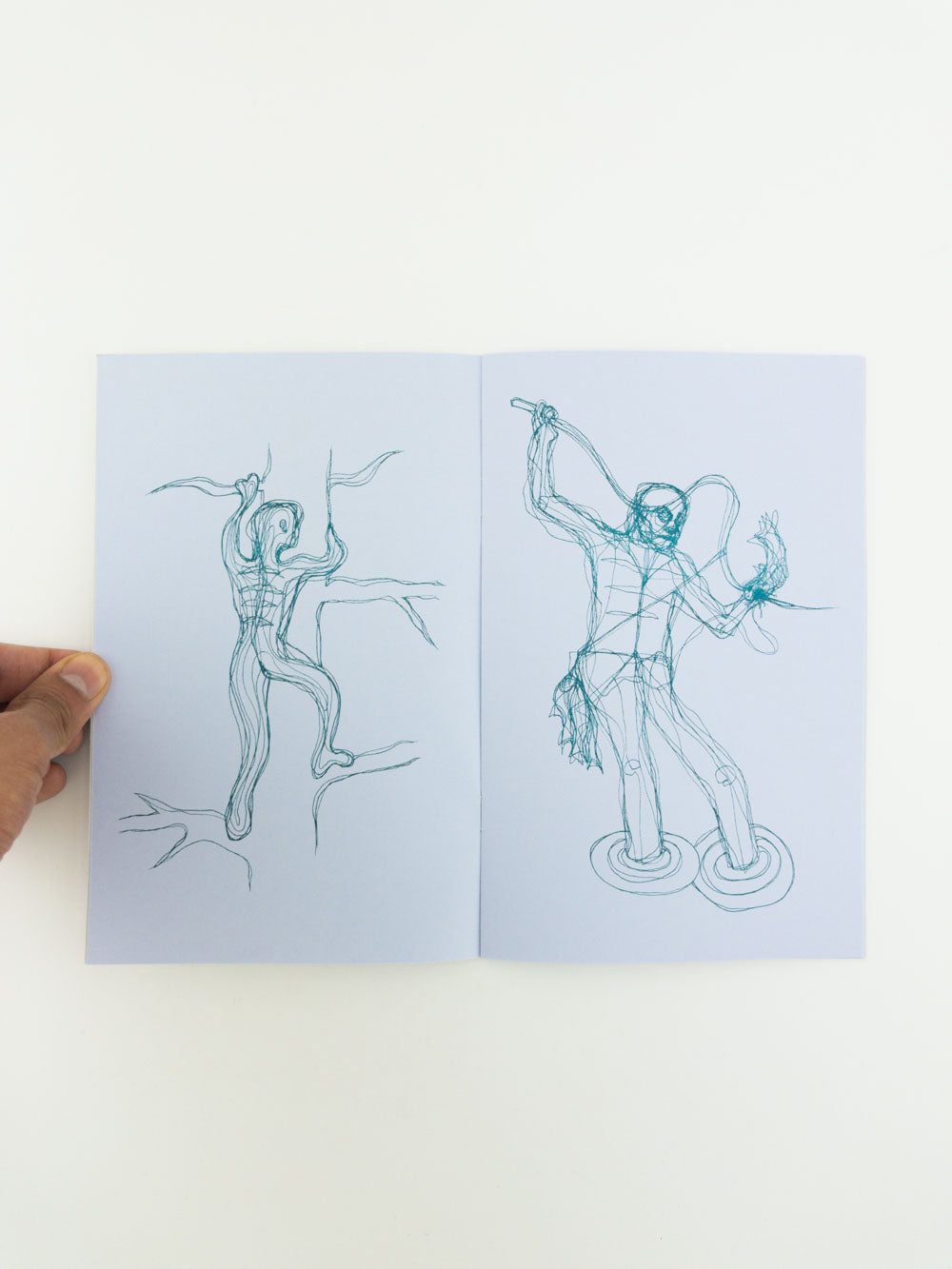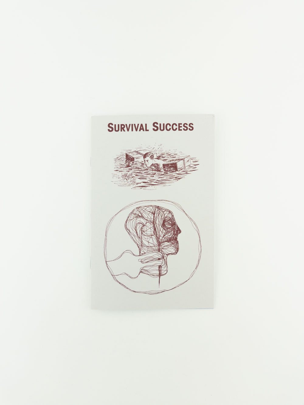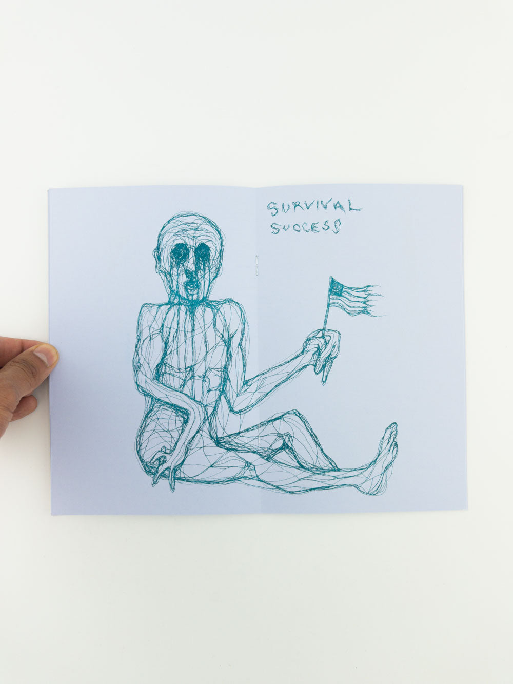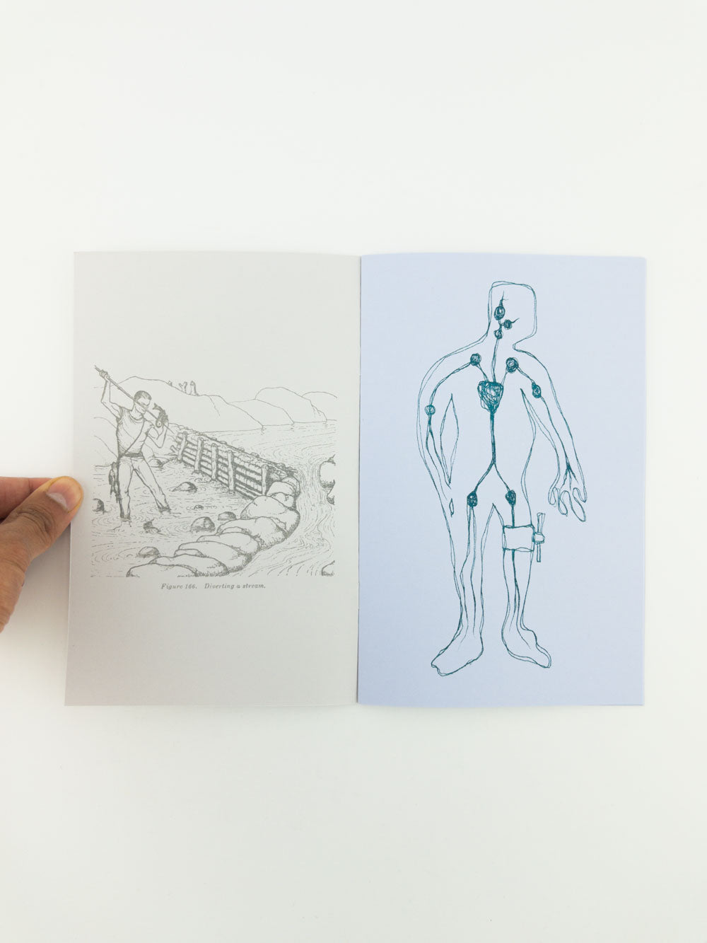 This booklet features Jonathan Canady’s drawings based on illustrations from a 1957 U.S. Army-issued survival guide (reprinted in 1970). Canady’s drawings are paired with scans of some of his source material. The illustrator of the drawings created for the Army is uncredited. Some of the original drawings that inspired Canady are placed alongside his reimaginings, while others are dispersed throughout the booklet in less direct placements or not included at all. In his versions of these illustrations, Canady takes these pragmatic guides to surviving under harsh conditions and transforms them into existential scenes of discovery and recovery. His humans are no longer soldiers that have successfully followed a lesson in a book, but creatures from a less identifiable time whose circumstances have been made strange and unknowable.