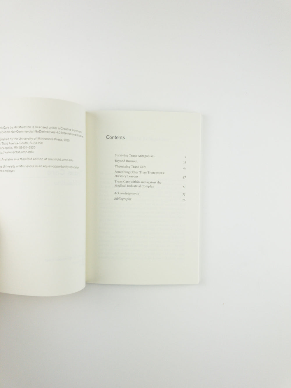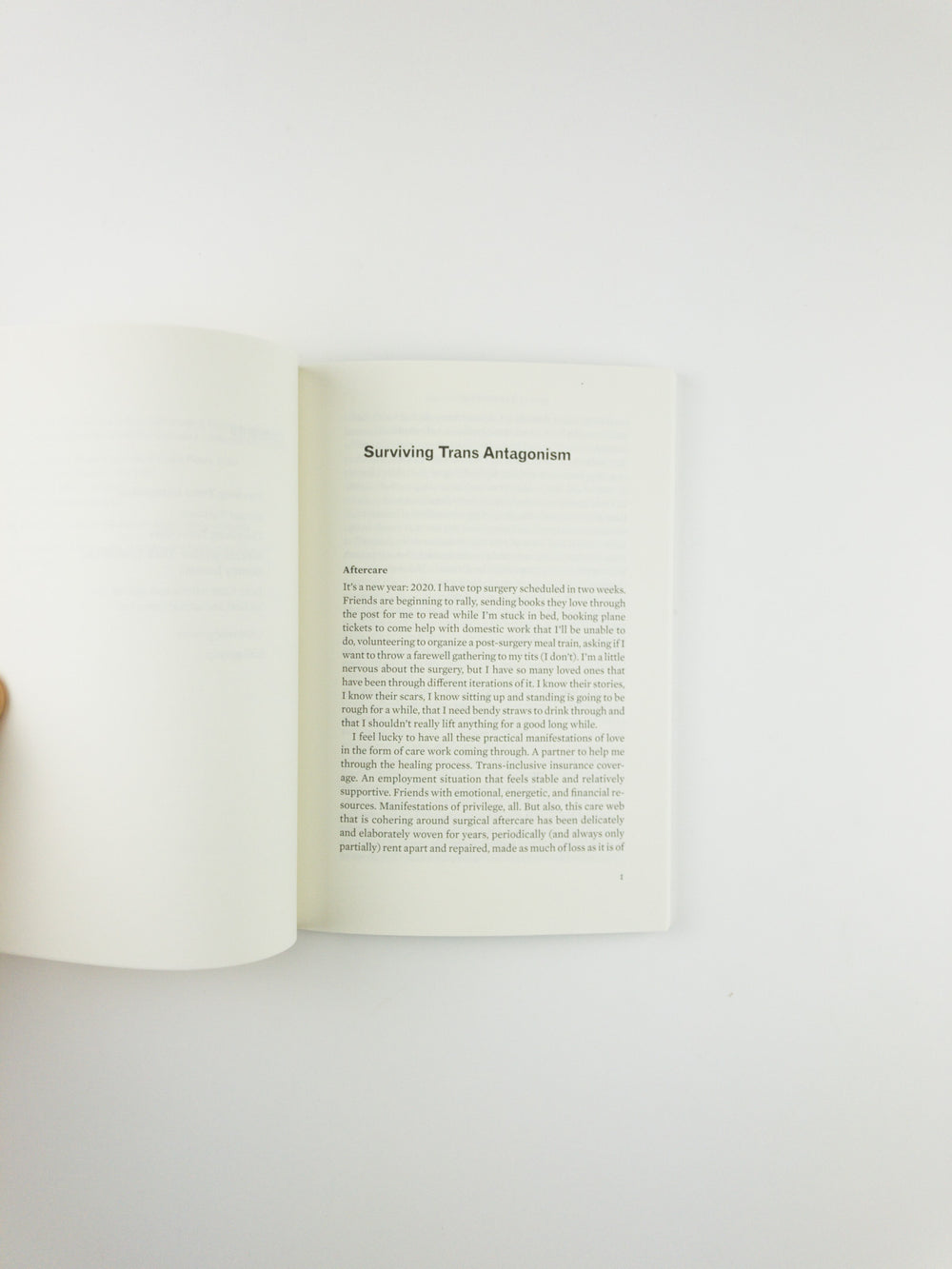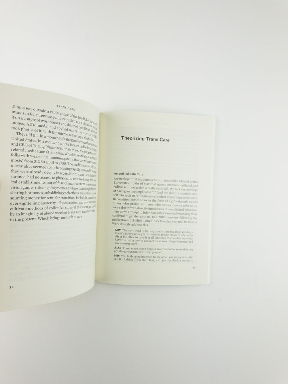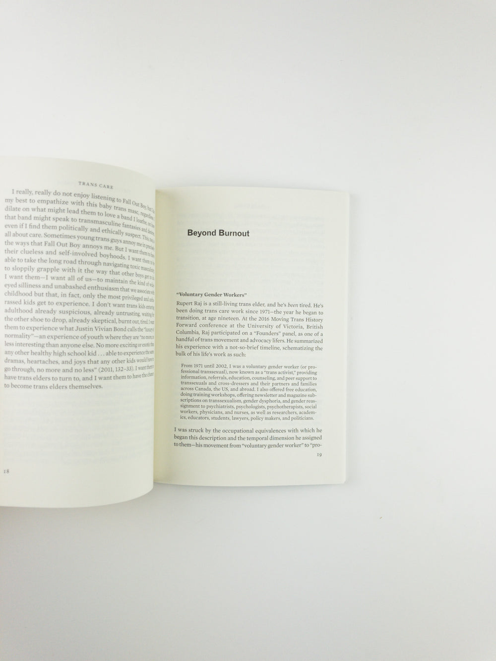 Trans Care is a critical intervention in how care labor and care ethics have been thought, arguing that dominant modes of conceiving and critiquing the politics and distribution of care entrench normative and cis-centric familial structures and gendered arrangements. A serious consideration of trans survival and flourishing requires a radical rethinking of how care operates.