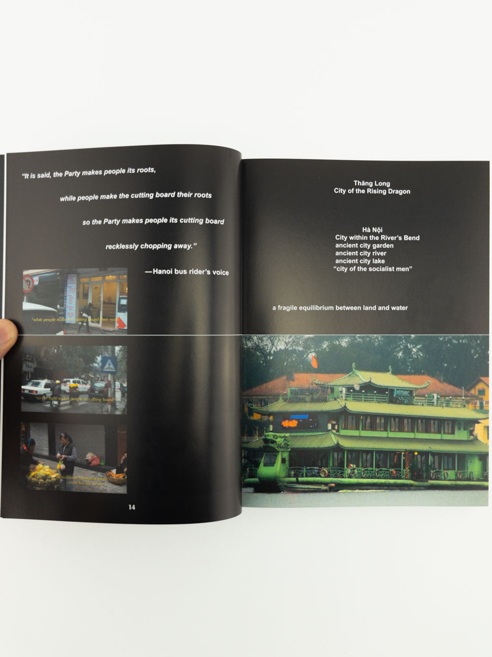 The Twofold Commitment is an artist book by filmmaker, writer, and theorist, Trinh T. Minh-ha. While contextualizing the wider scope of her filmmaking practice, this publication centers on Trinh’s feature film Forgetting Vietnam (2015), which takes up one of the myths surrounding the creation of Vietnam: a fight between two dragons whose intertwined bodies fell into the South China Sea and formed Vietnam’s curving, S-shaped coastline. Commemorating the fortieth anniversary of the end of the Vietnam War, the film draws inspiration from ancient legend to stage an ongoing, contemporary conversation between land and water, creating a third space for historical and cultural re-memory.