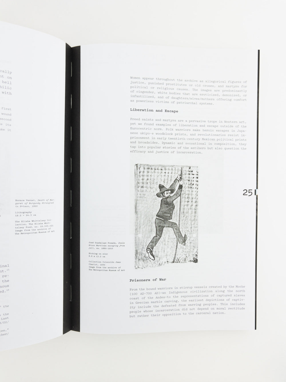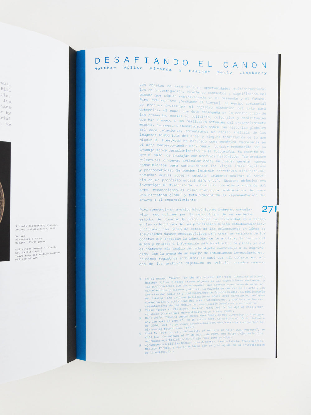 How to unravel the scopic regimes that sustain the punitive system of U.S. prisons? How can artistic production shake them up? Published on the occasion of the group show Undoing Time Project: Art and Histories of Incarceration, held at the Arizona State University Art Museum, this catalog and traveling exhibition is an exercise in tracking, recovering, and analyzing different voices that confront the horizons of meaning that sustain the penitentiary system, its structural problems—racism, gender violence, and classism—reproduced by the devices of “justice”, as well as its ethics and aesthetics.