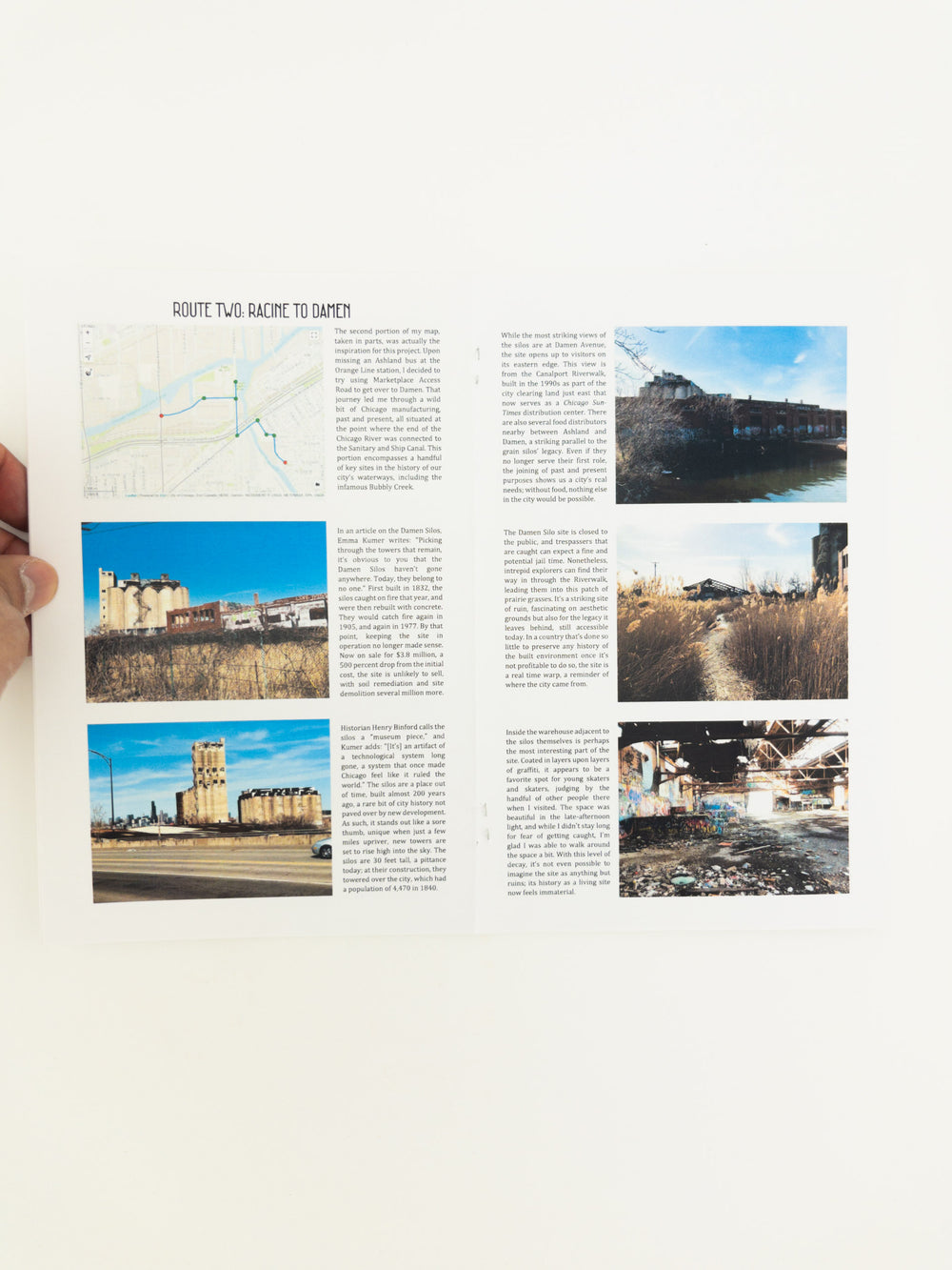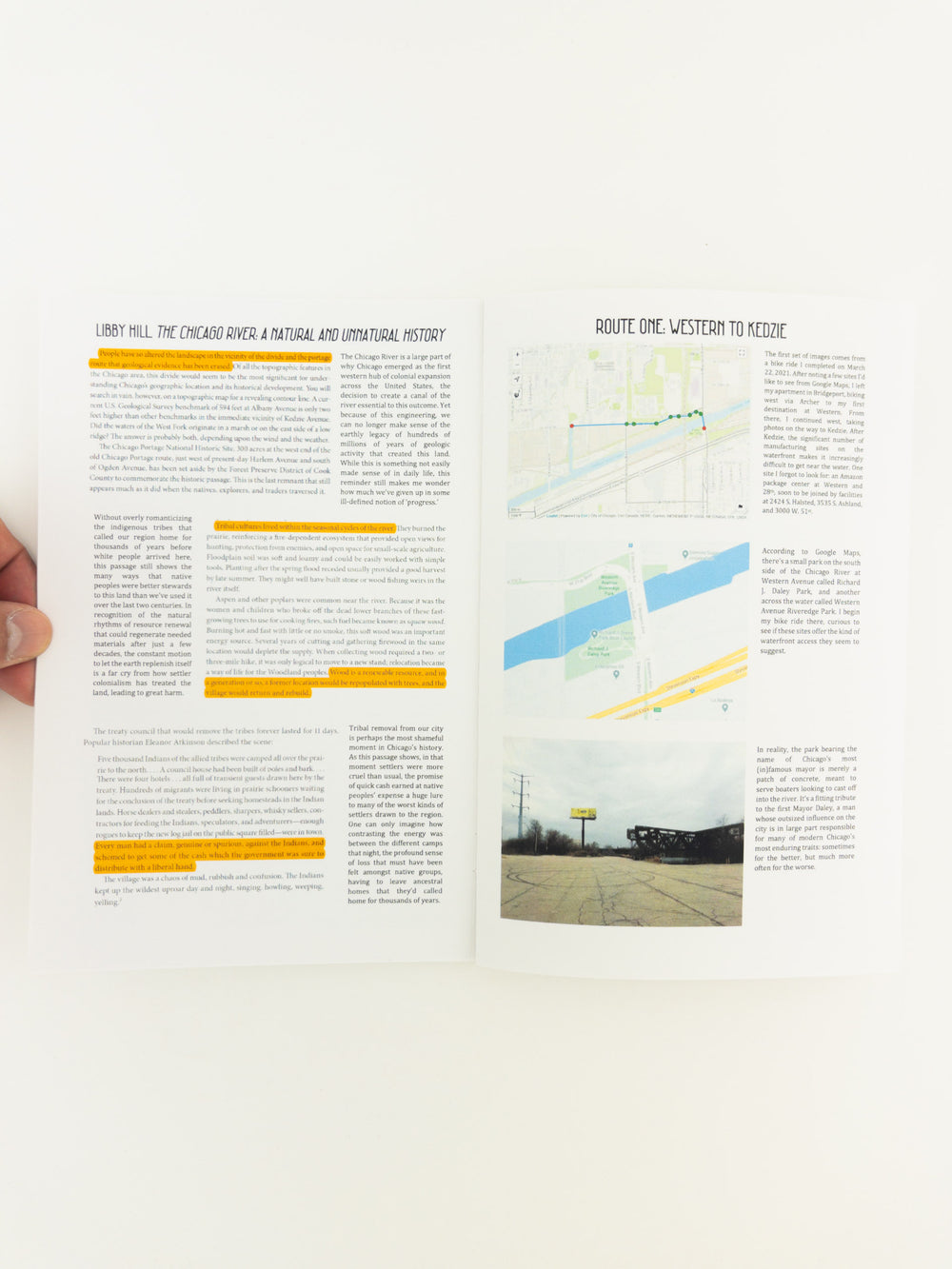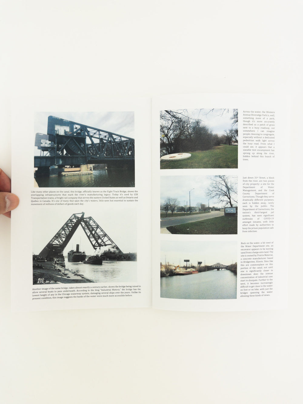 "Never Step in the Same River Twice" is an exploration of the changing shape, role, and identity of the South Branch of the Chicago River. Historically the natural connector between the Great Lakes and the Mississippi River systems, several centuries of colonialism have remade the river as to make it unrecognizable in many ways. While generations of industrial use of have made the river highly polluted, portions of the South Branch are today a part of the city's vision for future pedestrian use, tied to megadevelopment projects like the 78 and more accessible public spaces like Ping Tom Park. Using historic images and planning documents, as well as present-day photos along the river's edge, "Never Step in the Same River Twice" narrates the changing fate of this vital waterway, attentive to the water's essential nature: perpetual change.