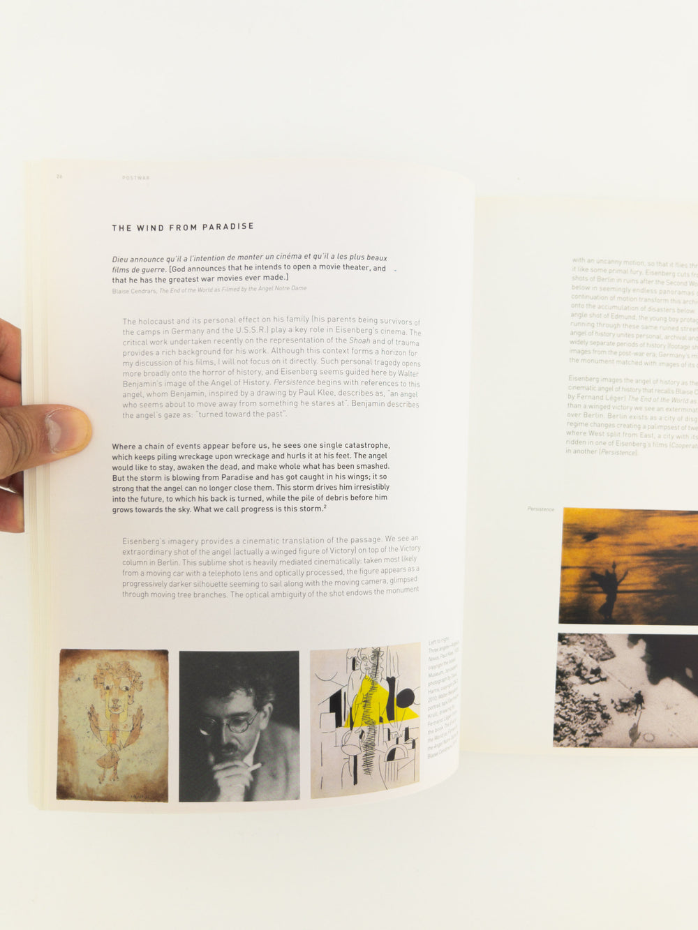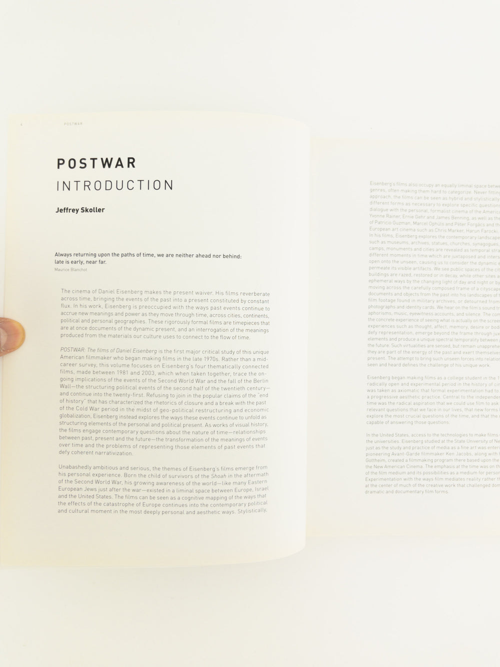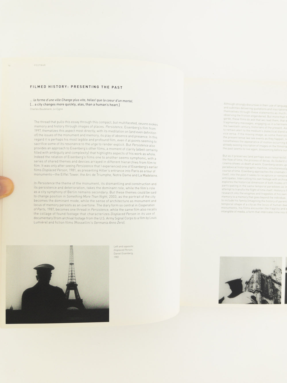 Postwar: The Films of Daniel Eisenberg presents the major films of filmmaker Daniel Eisenberg: Displaced Person, 1981, Cooperation of Parts, 1987, Persistence, 1997, and Something More Than Night, 2003, through newly commissioned essays by five highly respected writers of contemporary film and media art. This book represents the first survey of Eisenberg’s work, placing it in the context of contemporary theory and experimental media practice.