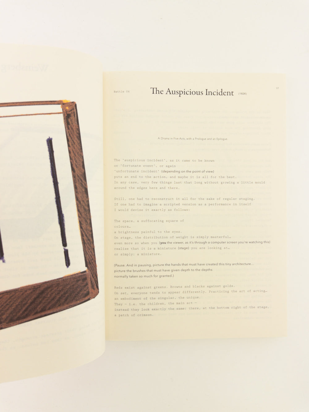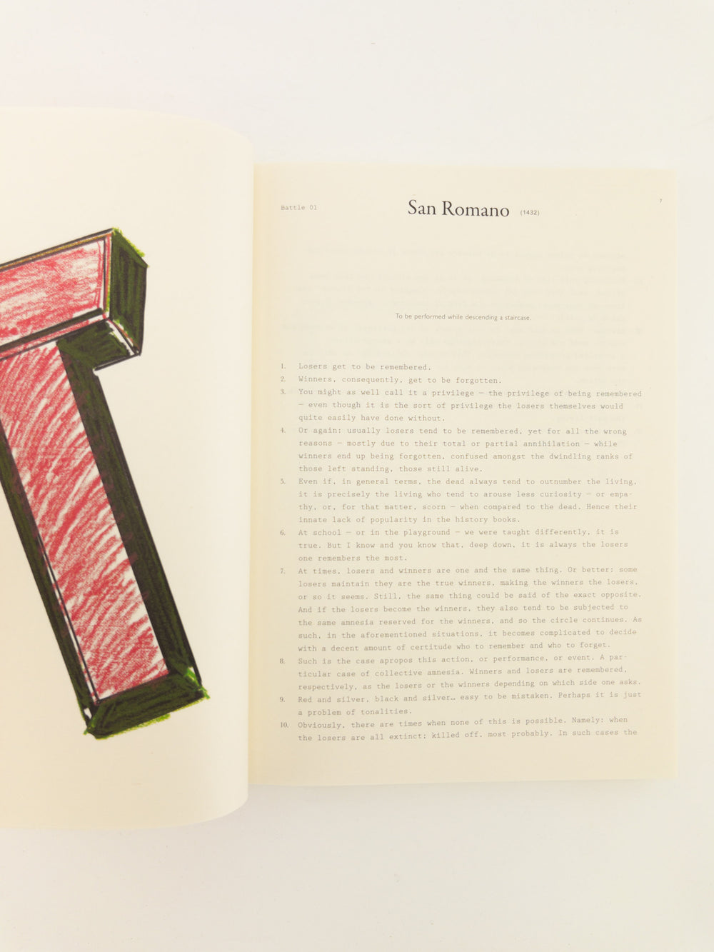 Pedraglio’s second book with Book Works, takes battles as a story-telling frame to focus on the small details and absurdities that characterise almost all of historical events and that end up changing the course of their action. Mixing into the historical stories, are personal accounts, trivial idiosyncratic events that become elevated to the same status as those that effect history.