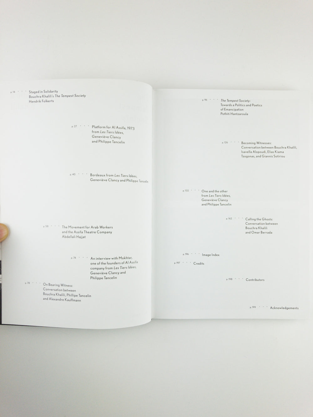 With contributions from Abdellali Hajjat, Hendrik Folkerts, Pothiti Hantzaroula, and interviews with Philippe Tancelin, surviving member of Al Assifa, Bouchra Khalili, Omar Berrada, and Alexandre Kauffmann, and Isavella Alopoudi, Elias Kiama Tzogonas, and Giannis Sotiriou, the performers in The Tempest Society.