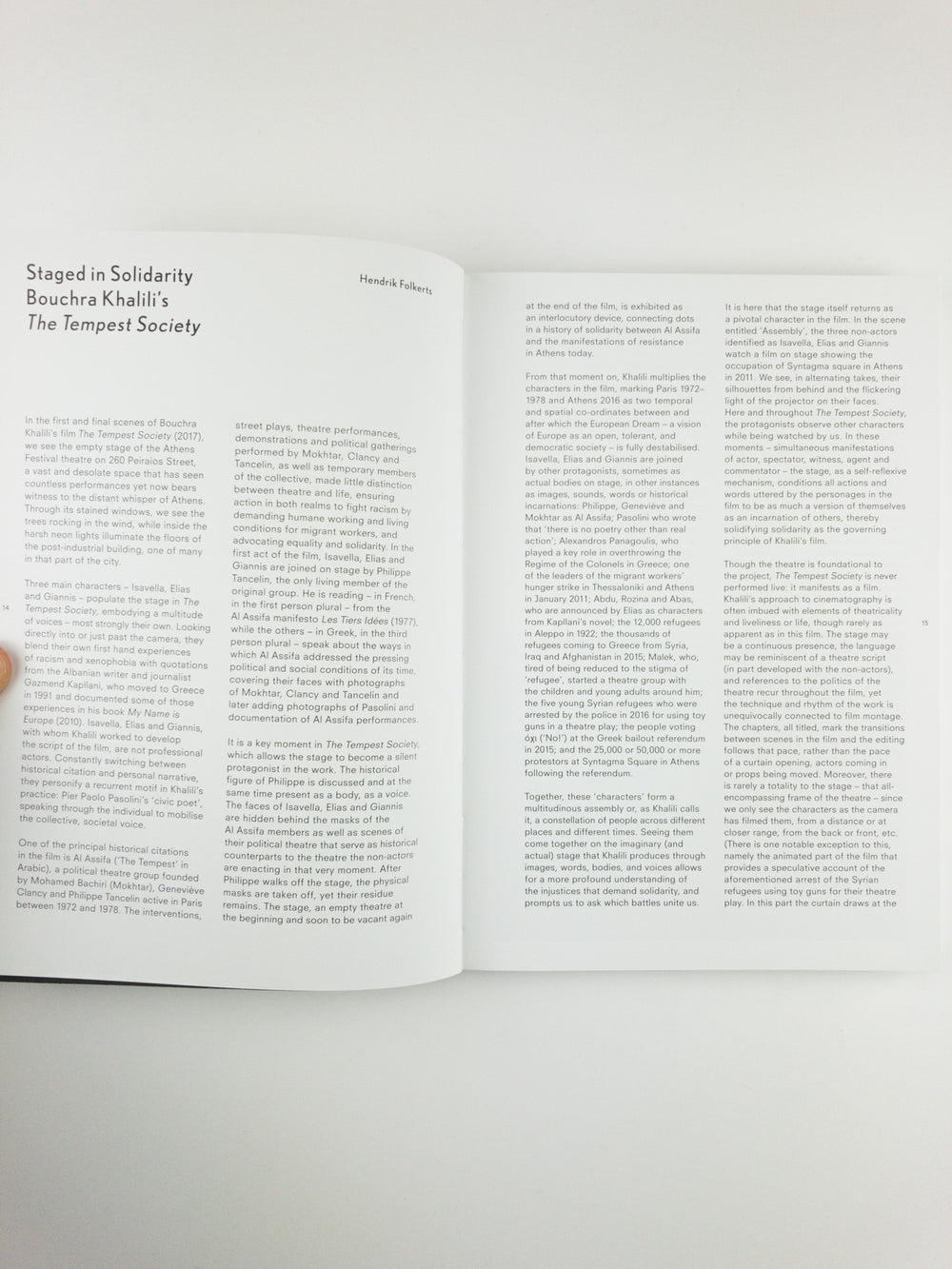 Following The Tempest Society (2017), the original video installation commissioned for documenta 14, which took Athens as a site to reflect on radical equality, democracy and theatre as a civic space, the book brings to light the specific history, the archive, and the ongoing resonance of the agit-prop theatre group ‘Al-Assifa’ in the context of urgent economic, political and humanitarian upheaval.