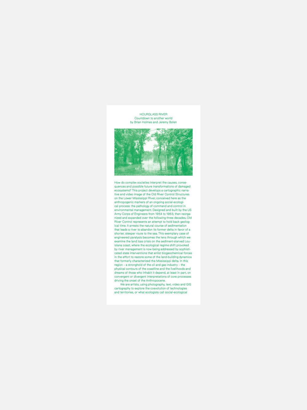 “How does a river tell time? And what kind of clock will it take to mark a new era? This text brings together history and geology to examine the land loss crisis affecting the Mississippi delta. Here, where continental sediments flow into the sea, the colonial drive to master and subdue nature has always been accompanied by the domination of other human beings. As the coastline literally disappears before our eyes, it is long past time to begin studying questions of pathology and healing in social-ecological systems.” — Brian Holmes