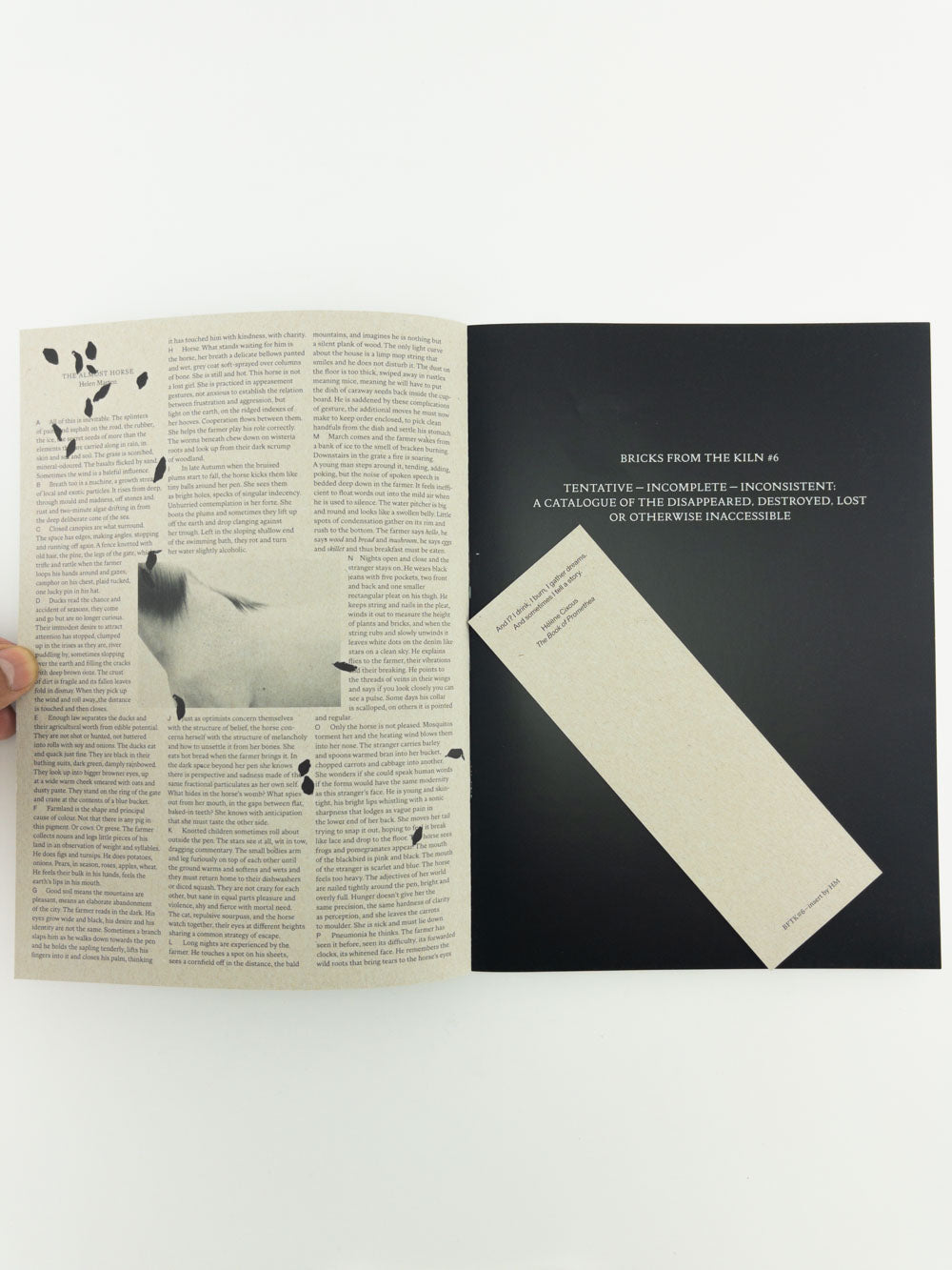This instalment of Bricks from the Kiln doubles as issue #6 of the journal and as an exhibition catalogue for the thematic show ‘BFTK#6: Tentative — Incomplete — Inconsistent: A Catalogue of the Disappeared, Destroyed, Lost or Otherwise Inaccessible’. Presenting objects, artworks, artefacts, models, events and animals that no-longer — or never did — exist in physical form, the exhibition explores themes of death, destruction and reincarnation, examining persisting interests in notions of ephemerality and permanence, memory and record, preservation and erasure, creation and reconstruction. How do we remember and memorialise? How is space given to the unrecorded? How do we experience the out of reach, concealed, unseen, undiscovered? How can the dematerialised be materialised again, through the mediation of writing, image and sound?