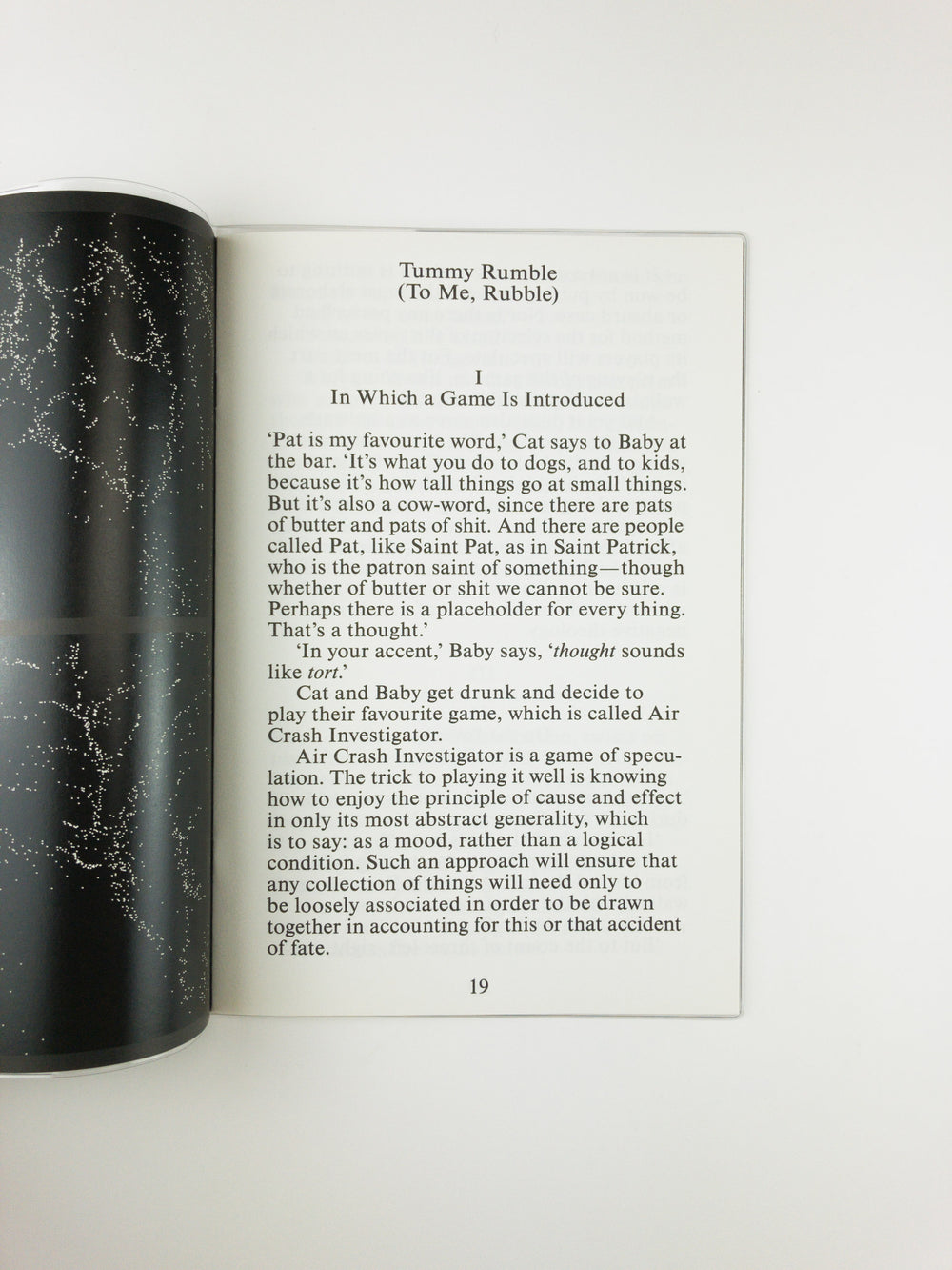 Tummy Rumble (To Me, Rubble) narrates and illustrates a series of fictional after-hours encounters set within imagined versions of the art hall and the club located in its basement. Its characters play a drunken game of association, passing through images and metaphors of the digesting body and of architectural form. These spatial fictions were represented on the wall of the exhibition with a diagram that also served, in the first instance, as a map for the plotting of the text. Drawing and writing are here the parallel instruments of a collaborative (and serendipitous) investigation into the abstraction of language and form.