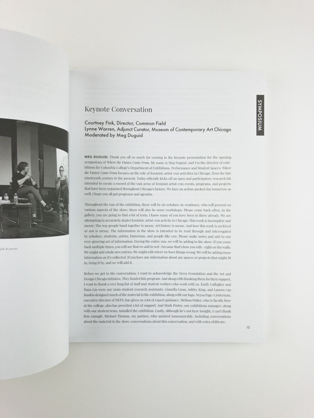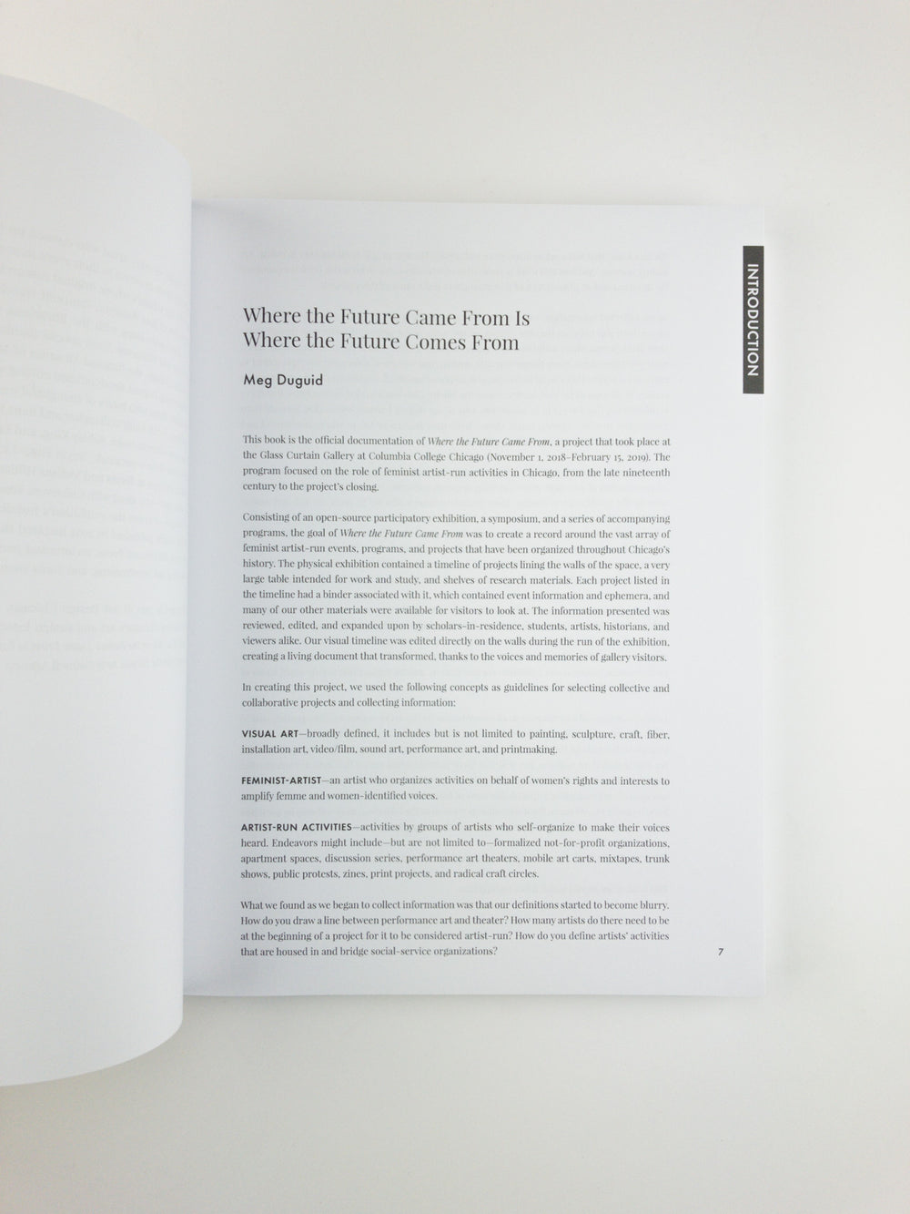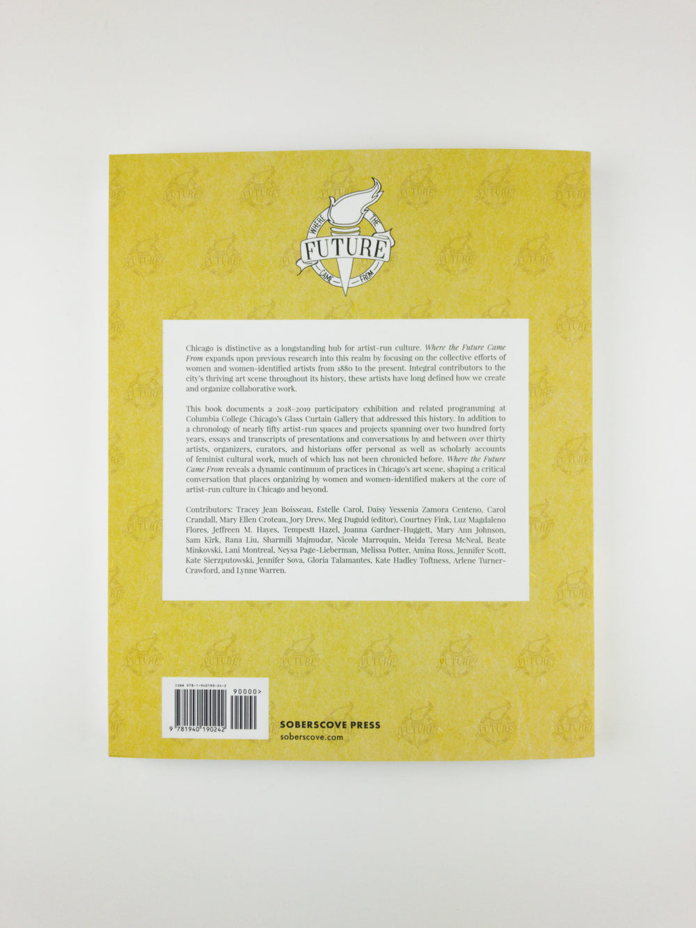 This book documents a 2018-2019 participatory exhibition and related programming at Columbia College Chicago’s Glass Curtain Gallery. In addition to a chronology of nearly 50 artist-run spaces and projects spanning from 1880 to 2019, this volume shares presentations and essays by 30 artists, organizers, curators, and historians that offer personal as well as scholarly accounts of feminist cultural work, much of which has not been chronicled before. Where the Future Came From reveals a dynamic continuum of practices in Chicago’s artist-run culture, shaping a critical conversation that places women and women-identified organizers at the core of the art world in Chicago and beyond.