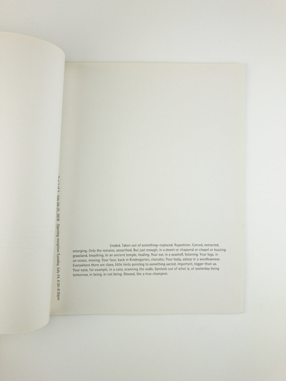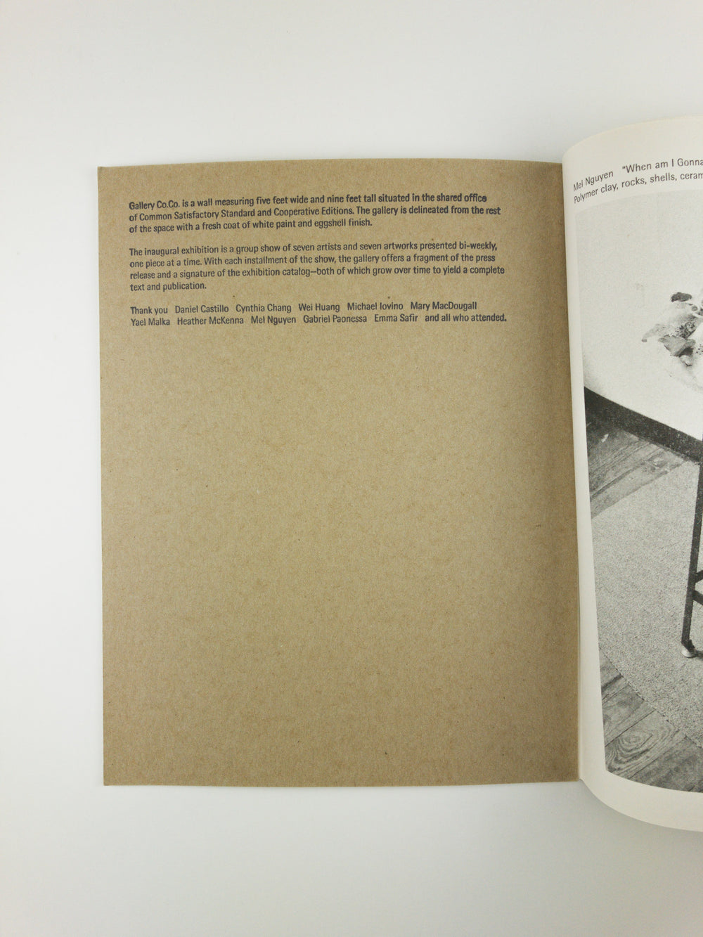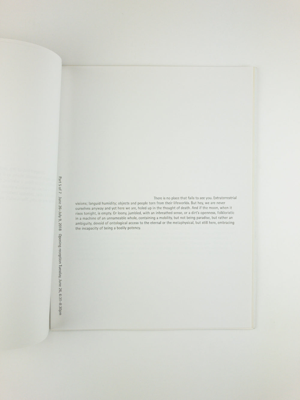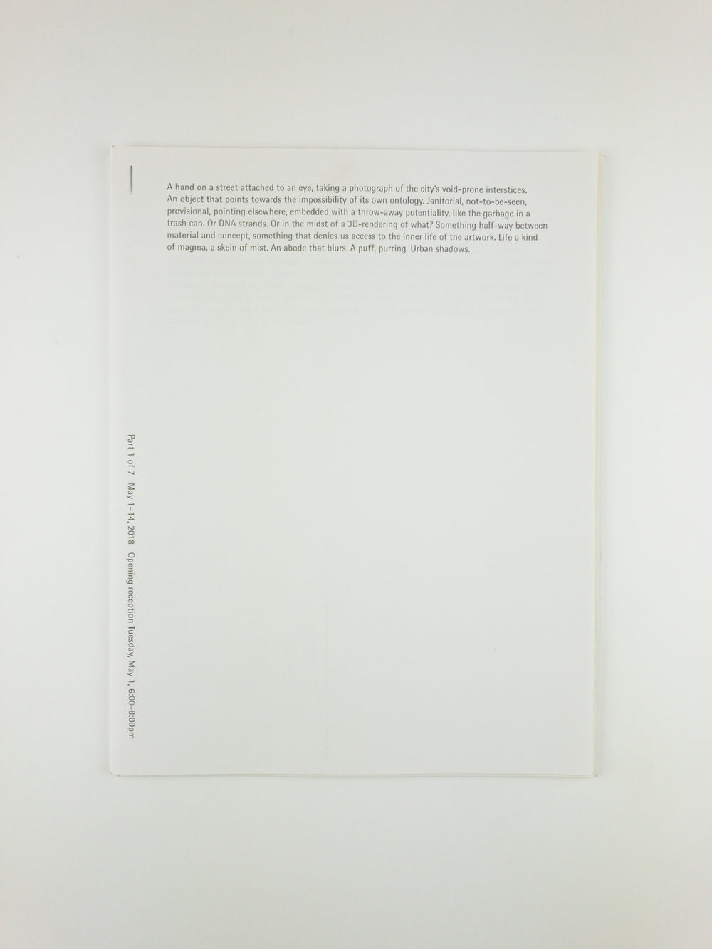 The inaugural exhibition is a group show of seven artists and seven artworks presented bi-weekly, one piece at a time. With each installment of the show, the gallery offers a fragment of the press release and a signature of the exhibition catalog—both of which grow over time to yield a complete text and publication.