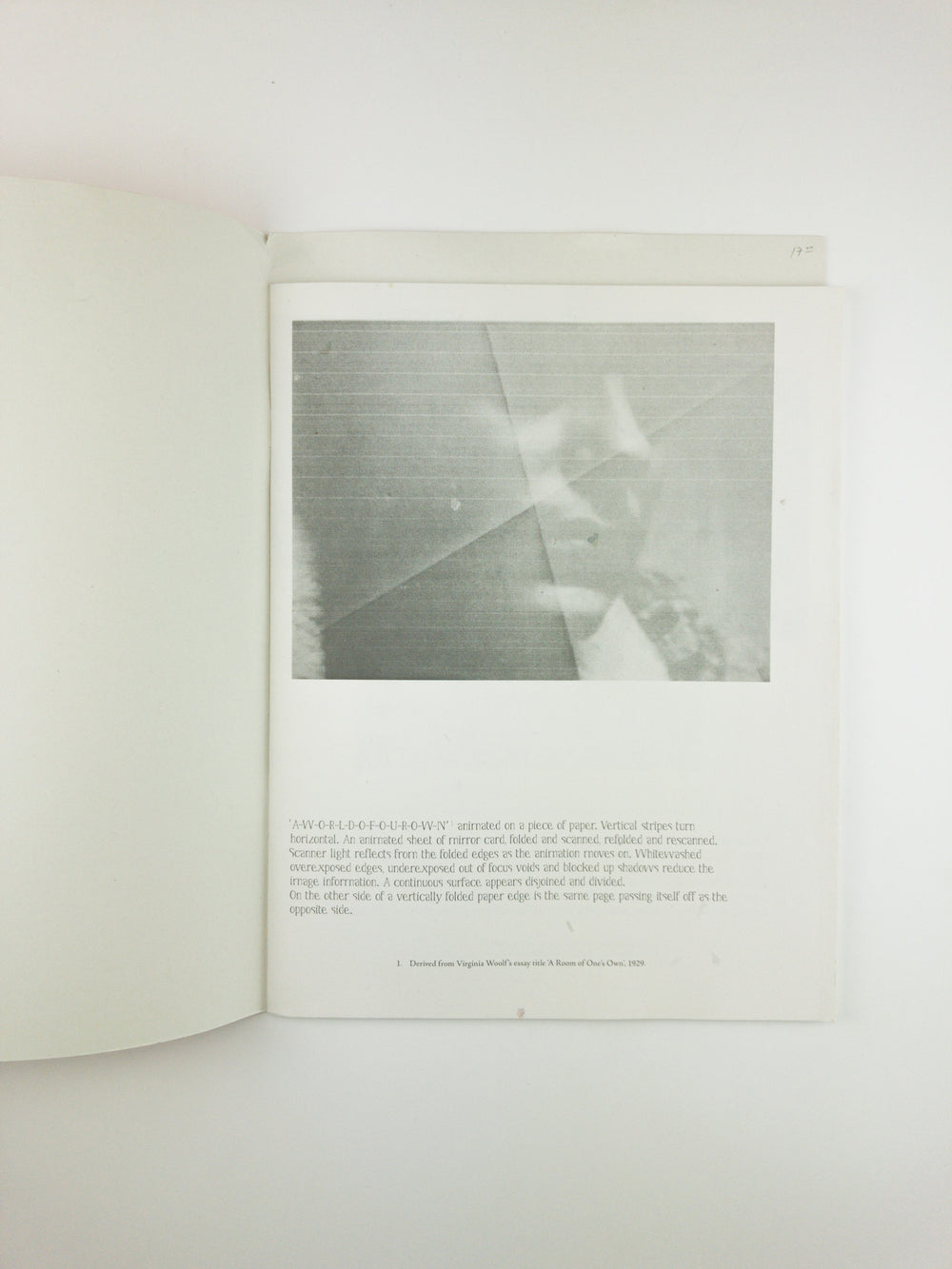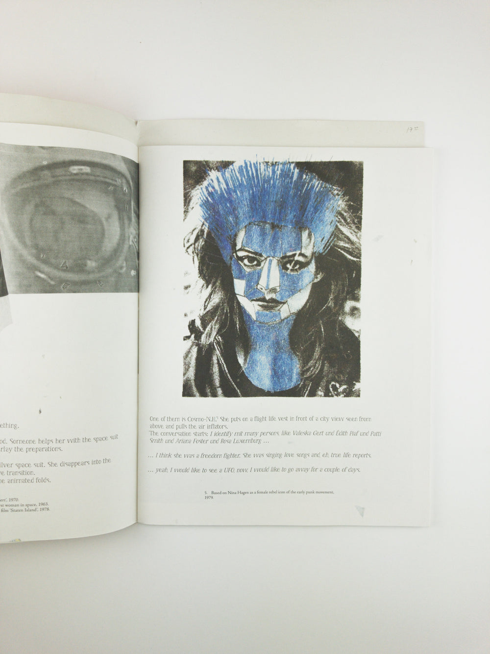 A-W-O-R-L-D-O-F-O-U-R-O-W-N is the second publication of artist Eline McGeorge published by Dent-De-Leone. It features a script of several characters, all named Cosmo who are in turn Maya Deren, Nina Hagen, or Virginia Woolf stuck somewhere between the seventies and today in a world close to our own. The publication itself refuses or embraces both standards of the western world, the European A4, and the American letter while the content is made of recycled £5 notes.