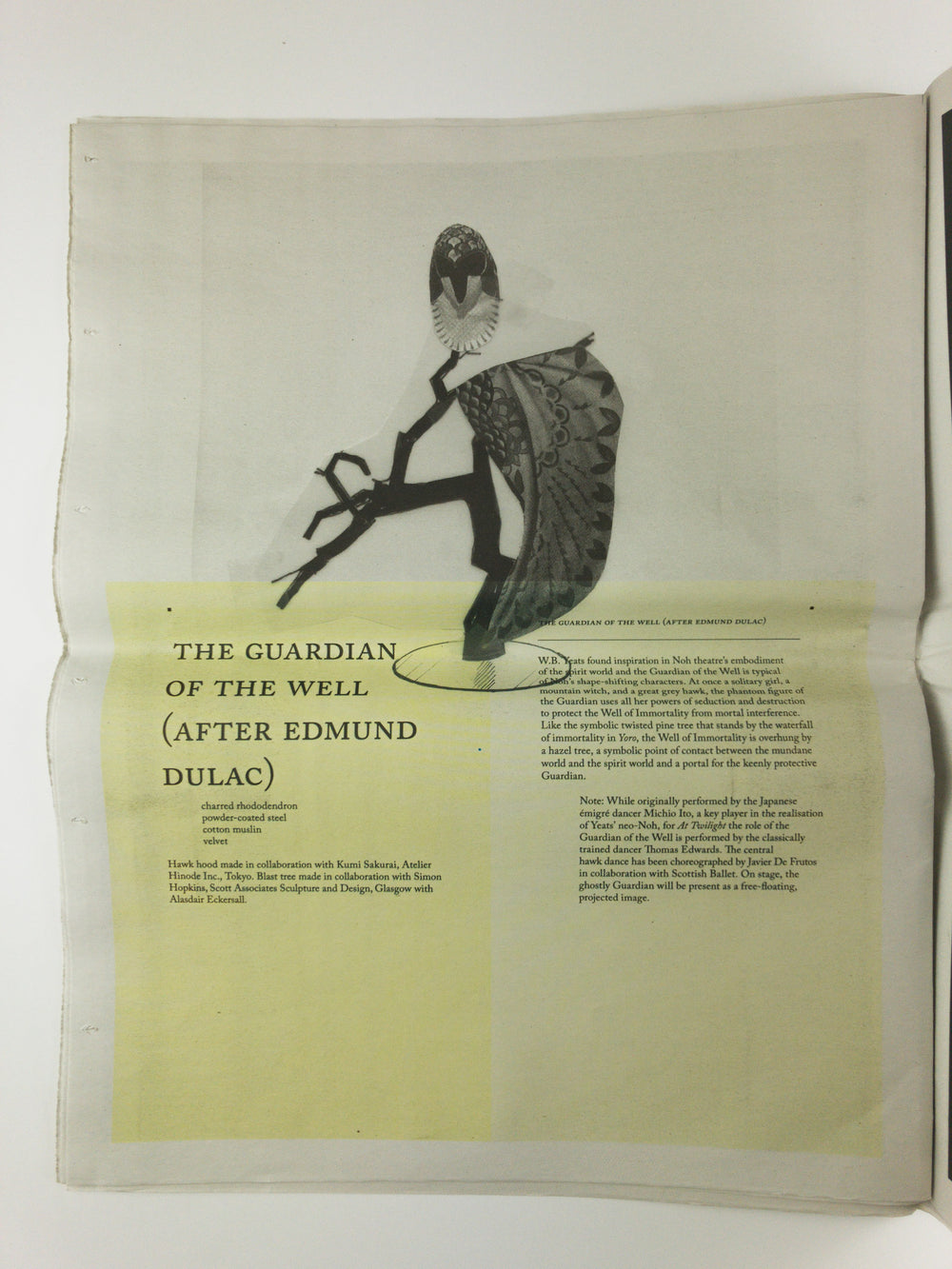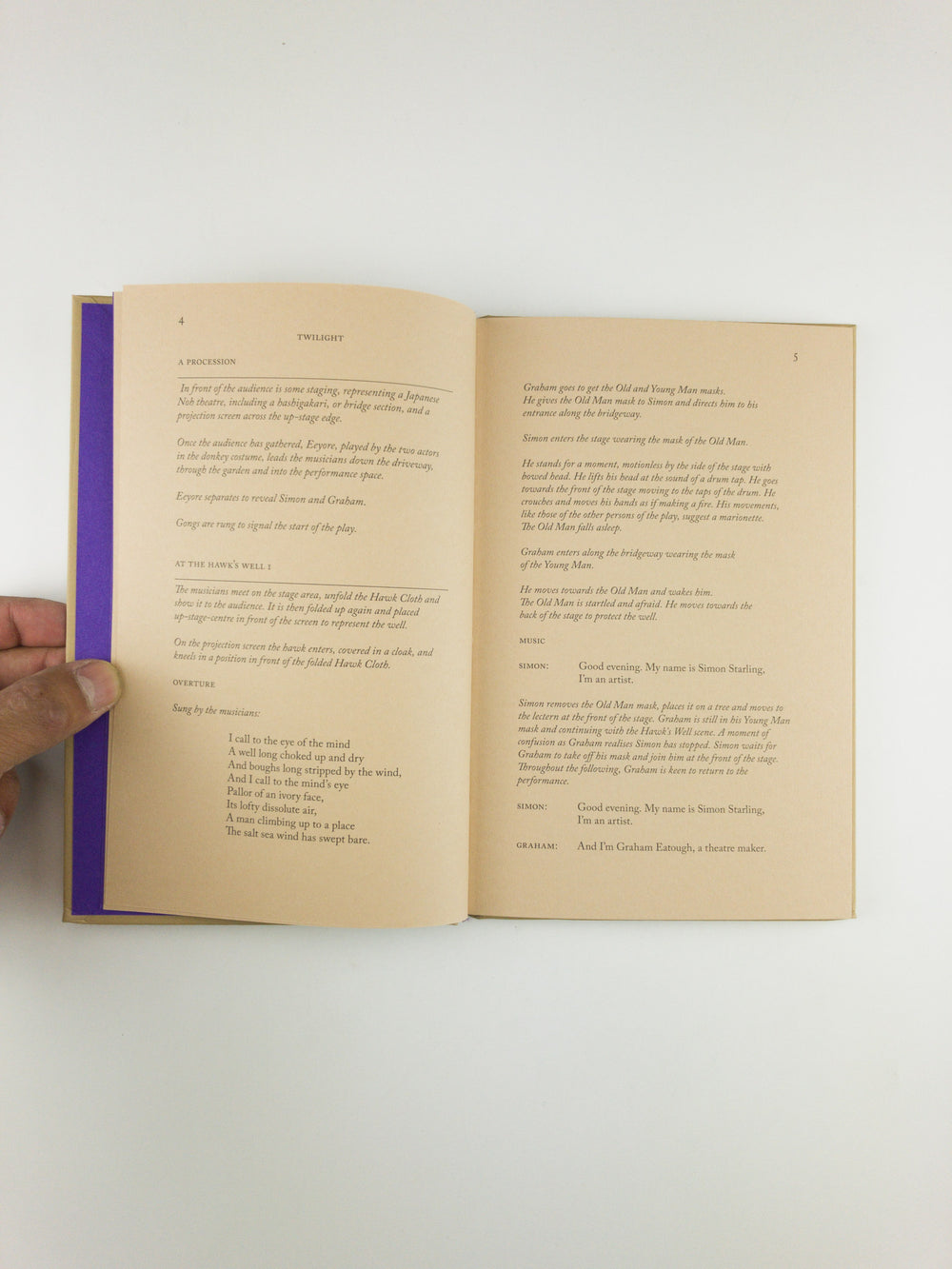 A publication in two parts: one a hard-bound book that includes the script for At Twilight: A play for two actors, three musicians, one dancer, eight masks (and a donkey costume) by Graham Eatough and Simon Starling, first performed in Glasgow in 2016; and the other a tabloid-format newspaper that documents the exhibition At Twilight and the live performances. The publication also includes texts by Katrina Brown, Director of The Common Guild, and Yukie Kamiya, Director of The Japan Society Gallery, alongside character biographies written by Simon Starling and source material selected by the artist.