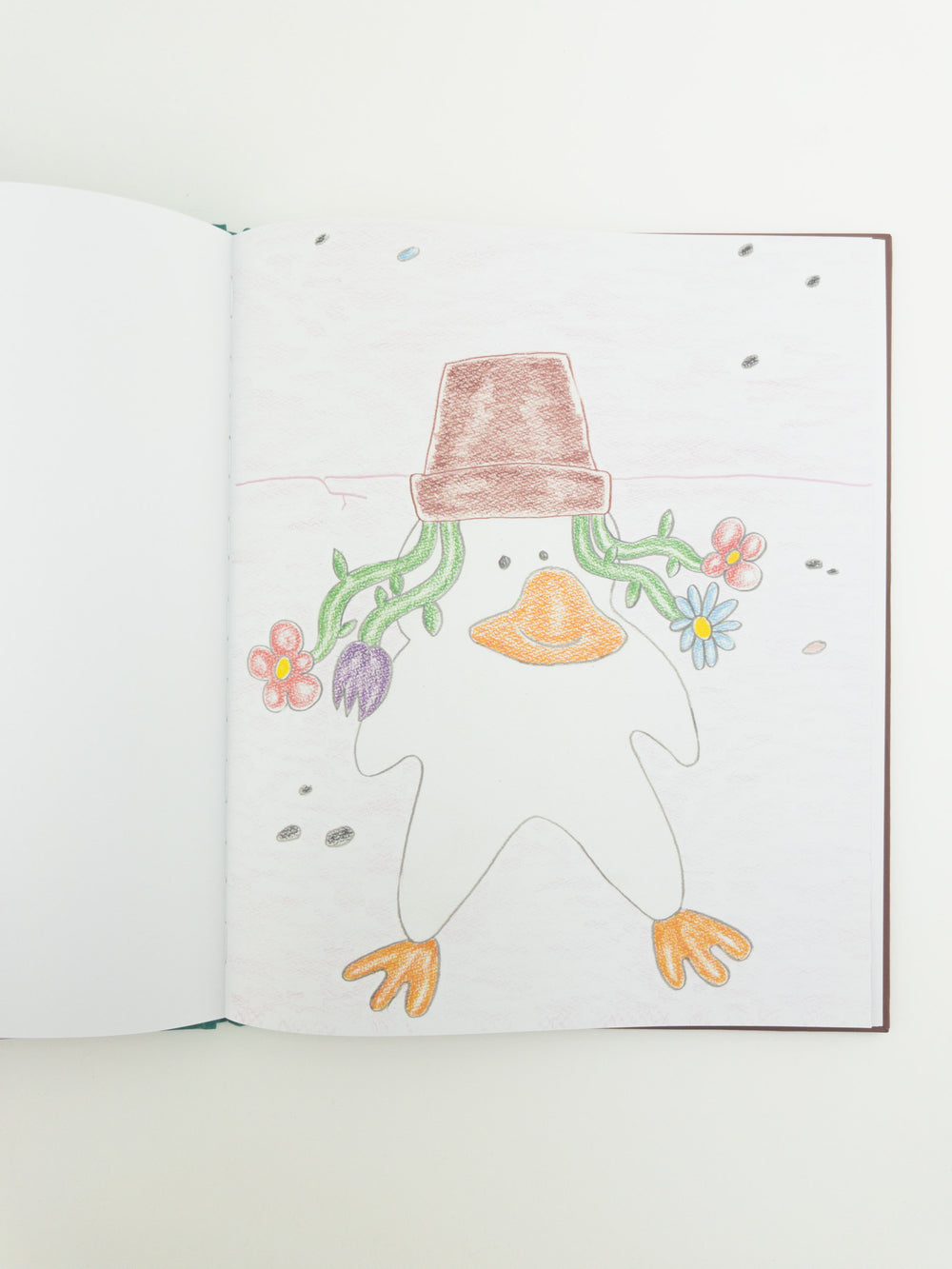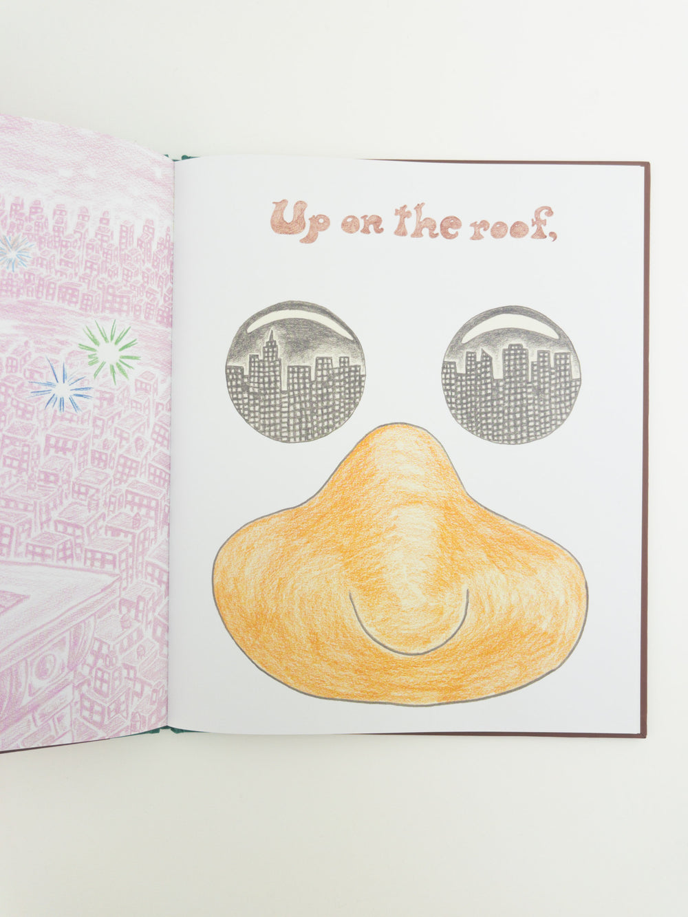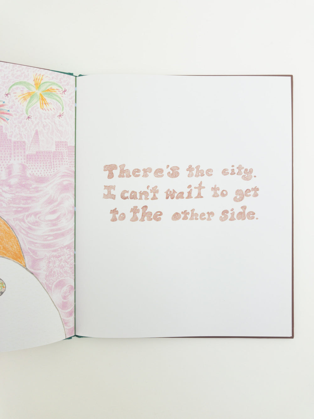 In Eugene Terry’s debut children’s publication, Tuesday, we follow Duck’s journey to a big city, in search of a snack. With delicate colored pencil illustrations rendered in subtle tones, Terry tells a simple story of adventure and friendship. The direct writing is paired with intricate imagery in which details are revealed with every read: an alligator peeking its head out of a sewer grate; the price of a Swiss cheese sandwich at the deli; a man watching television through an apartment building’s window.