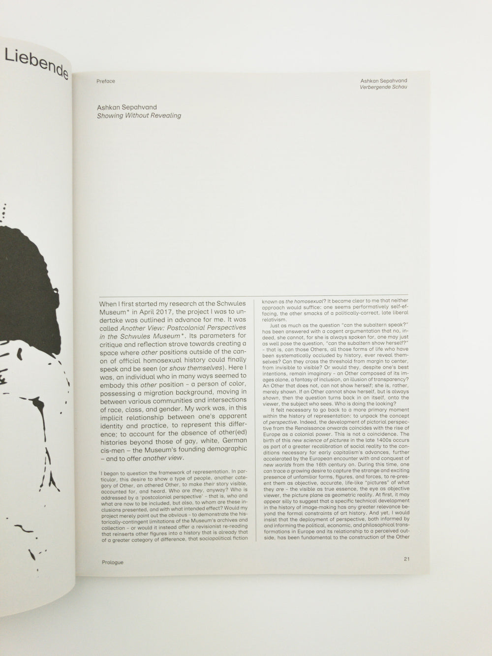 Odarodle specifically turns "Eldorado" backwards. As a site of multiple origins, it is a threefold reference: an historical exhibition, a legendary night club, and a colonial myth. Though the commitment of the Schwules Museum* to enable LGBTIQ cultural visibility bespeaks a greater political agenda of liberation, the contemporary relevance of such a (self-) representational undertaking requires revision and reflection. A more expansive, less obvious scale of critical engagement, as proposed by Odarodle, considers the deeper operations within Modernity that have attempted to exhibit forms of life, their bodies, and their habitats. This is where the desire to show the manners and mores of a kind of "people" and their "nature" confronts the postcolonial challenges of the ethnographic museum: a site that has historically sought to visualize the existence of the "Other" and, in doing so, maintains the "Other" as a normative construction.