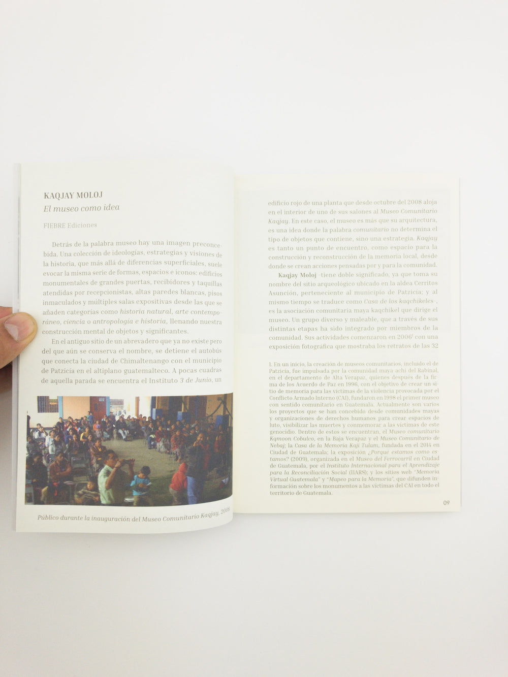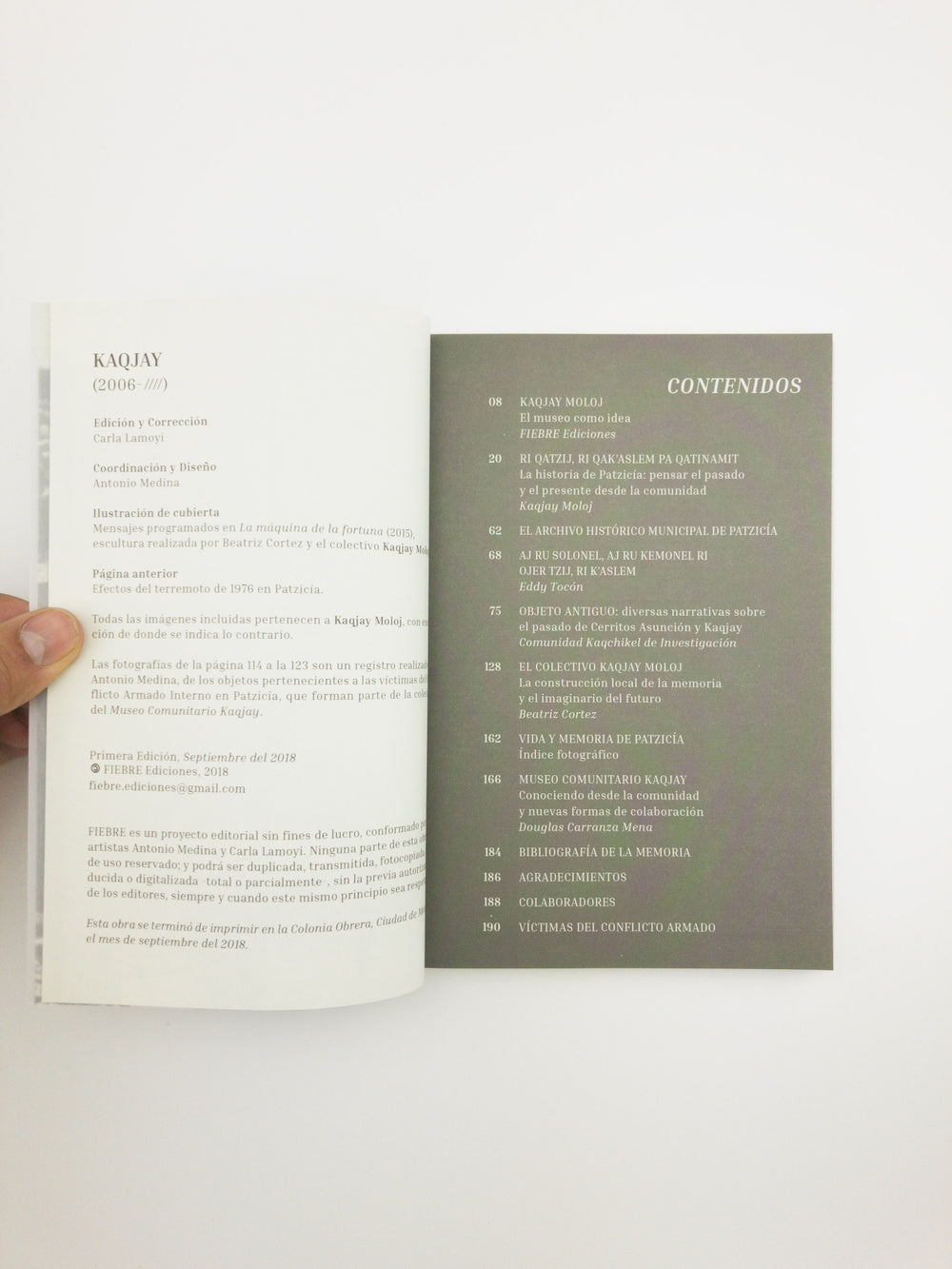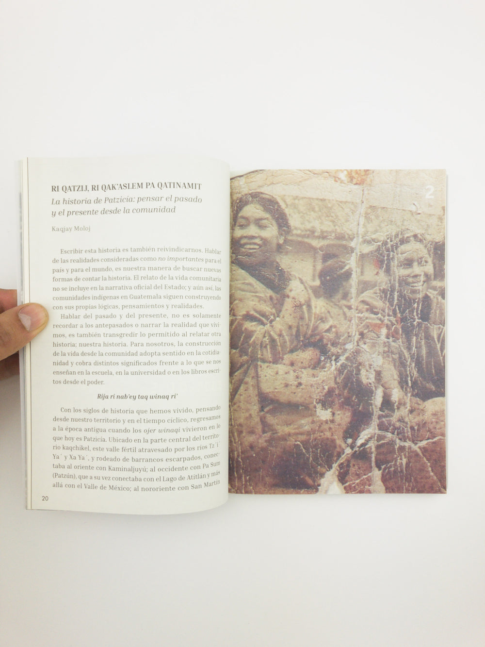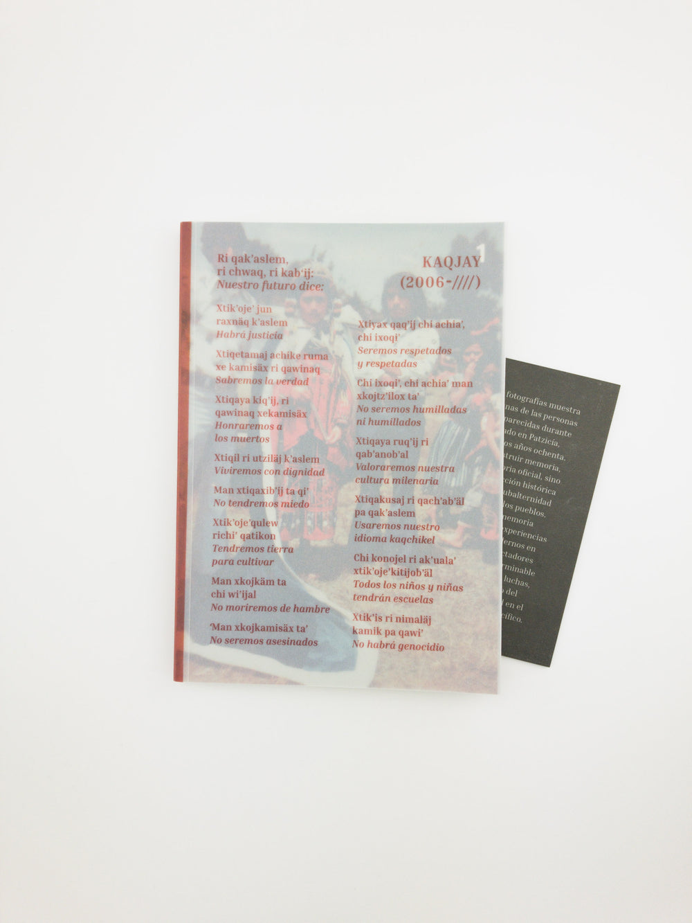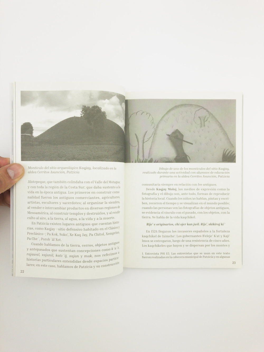 Publicación sobre el trabajo realizado por Kaqjay Moloj, colectivo maya kaqchikel dedicado a la reconstrucción de la historia, memoria e identidad del poblado de Patzicía en Chimaltenango, Guatemala. El libro incluye ensayos sobre identidad, arqueología comunitaria, la construcción de la memoria, y la experiencia de las comunidades mayas en Los Ángeles, escritos por Kaqjay Moloj, Eddy Tocón, la Comunidad Kaqchikel de Investigación, Beatriz Cortez y Douglas Carranza Mena, además de fotografías de archivo e imágenes de las intervenciones realizadas por el colectivo.