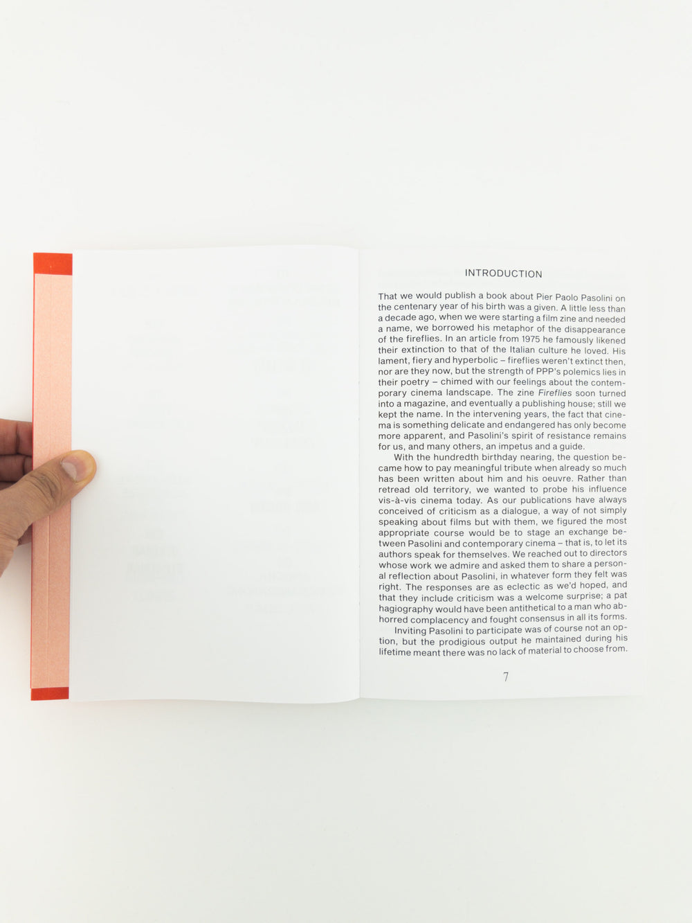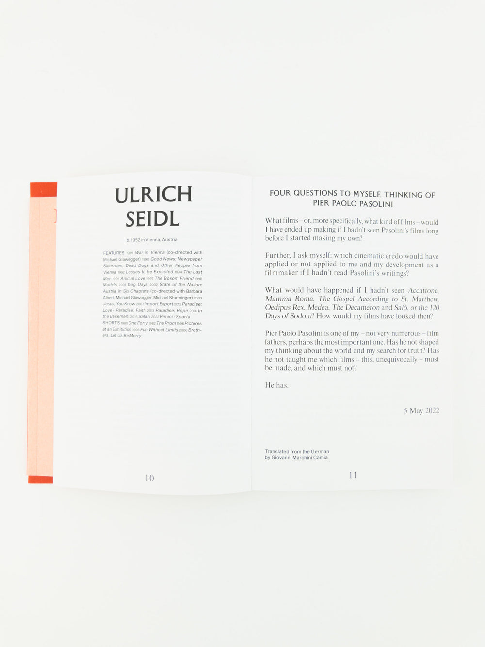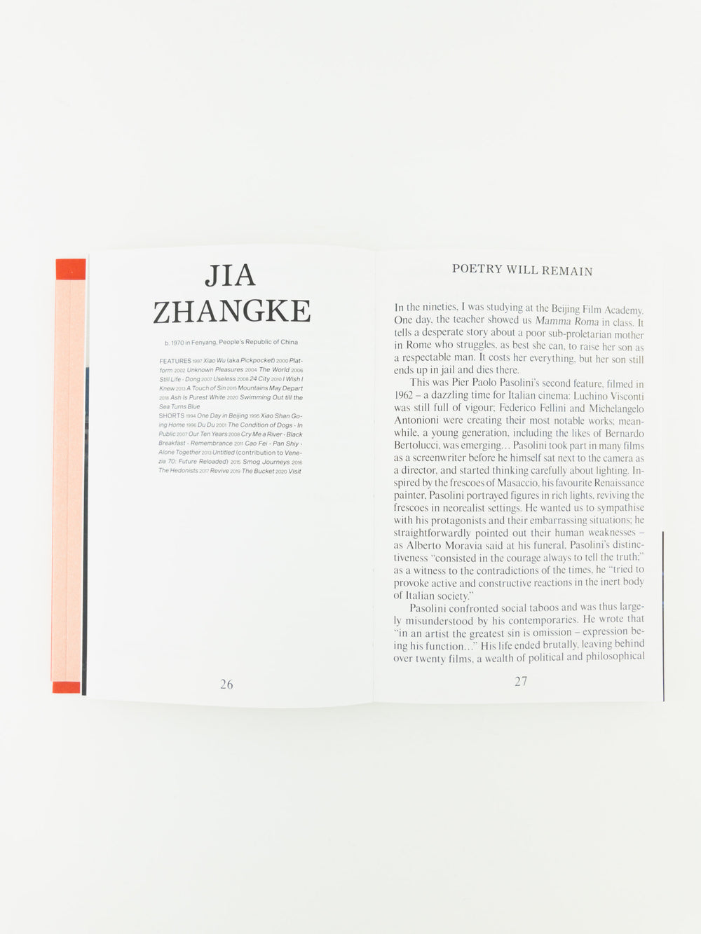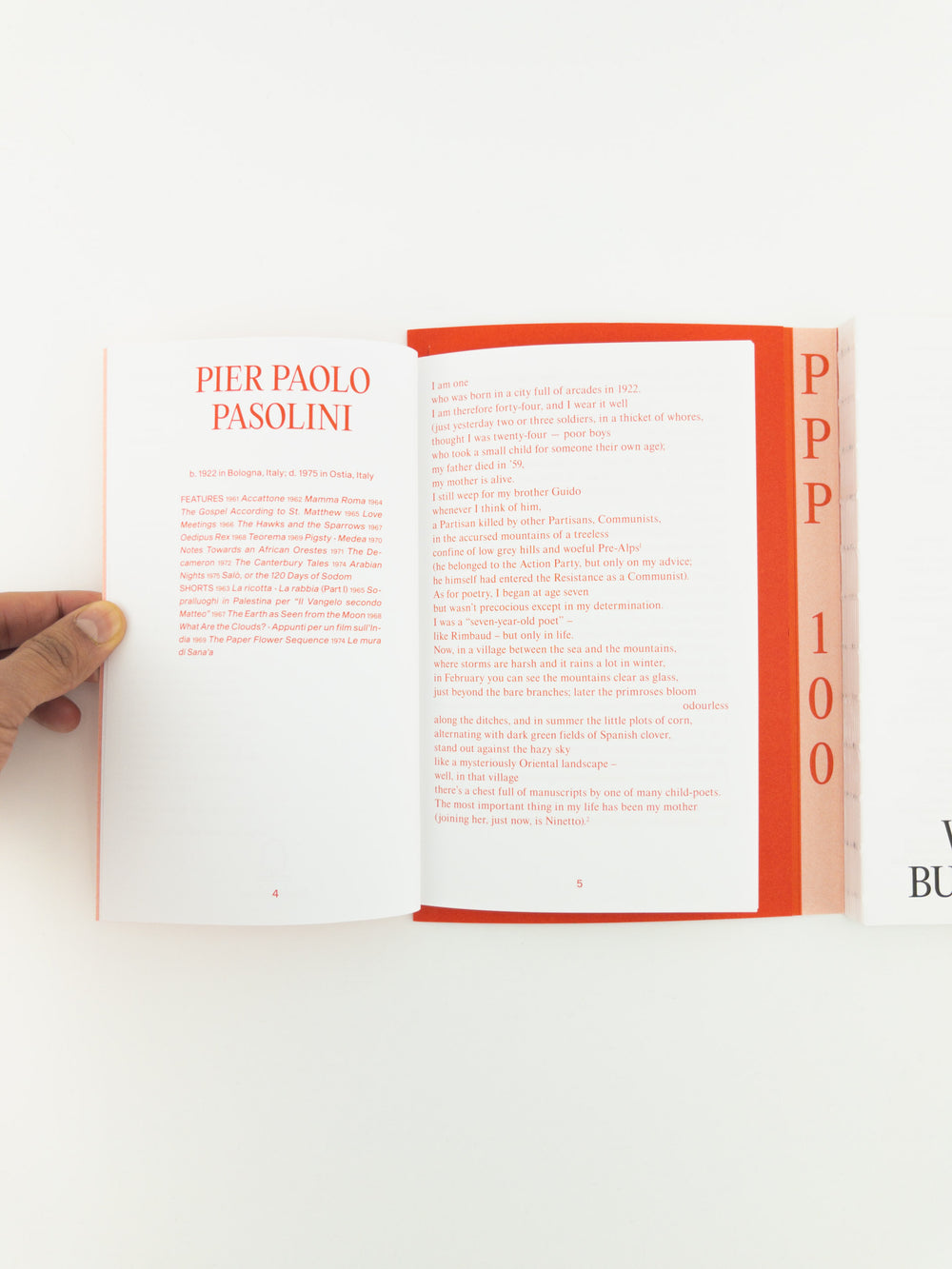 This publication honours the multitalented Italian film director Pier Paolo Pasolini (1922–1975), who was born in Bologna and became a polemical figure due to his outspoken leftist politics and controversial analyses of public affairs. The book centres around Pasolini’s epic autobiographical poem “Poeta delle ceneri”, published here in a revised translation by American poet Stephen Sartarelli. In addition, the book features original written and visual tributes by a variety of filmmakers from across the contemporary landscape, including Radu Jude, Jia Zhangke, Anocha Suwichakornpong, Roberto Minervini, Angela Schanelec, Basma Alsharif, and Alexandre Koberidze.