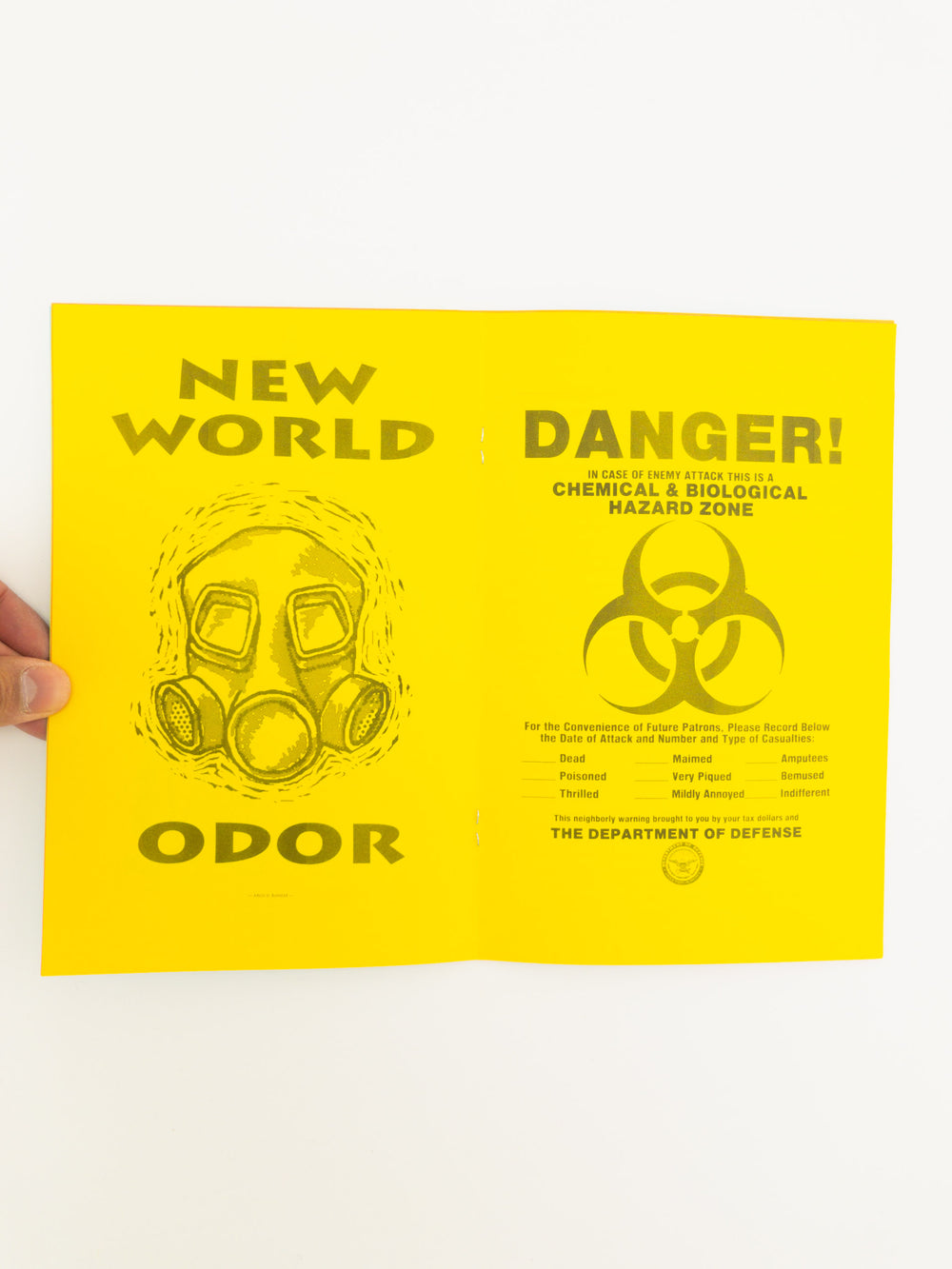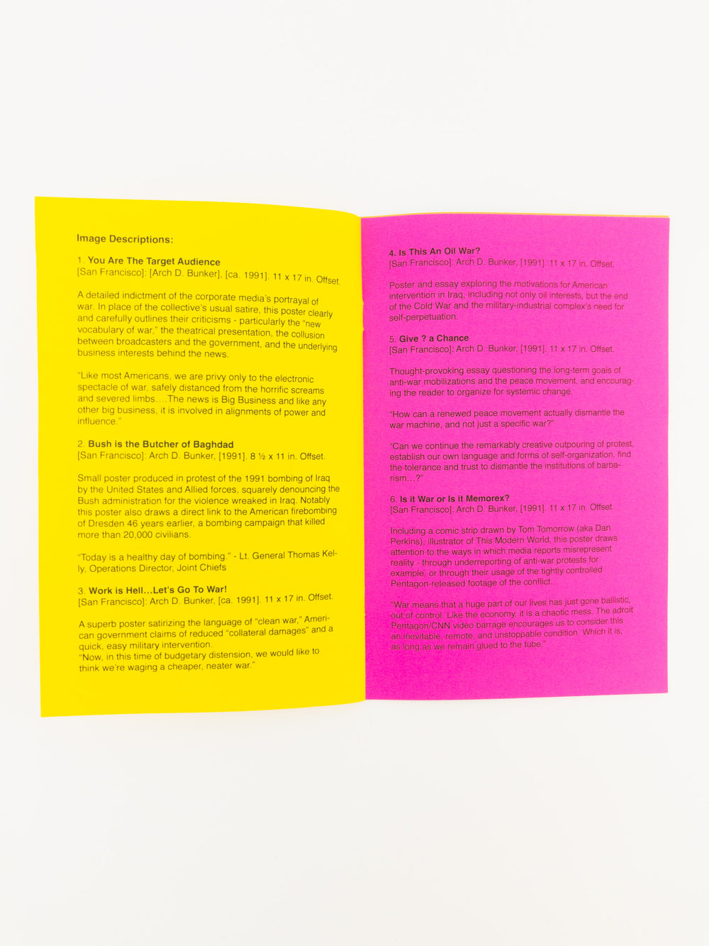 A selection of anti-war flyers and posters produced by Arch D. Bunker, an anonymous artists’ collective that mobilized in the early 1990s in response to the First Gulf War. The short-lived group detourned and criticized the distant and calculating language of military officials, arms dealers, politicians, and corporate media pundits. Produced in the first decade of cable news and the 24-hour news cycle, these prints also brought early attention to disinformation and the distorted ways in which most Americans were being shown the conflict, on television: the spectacle of war.